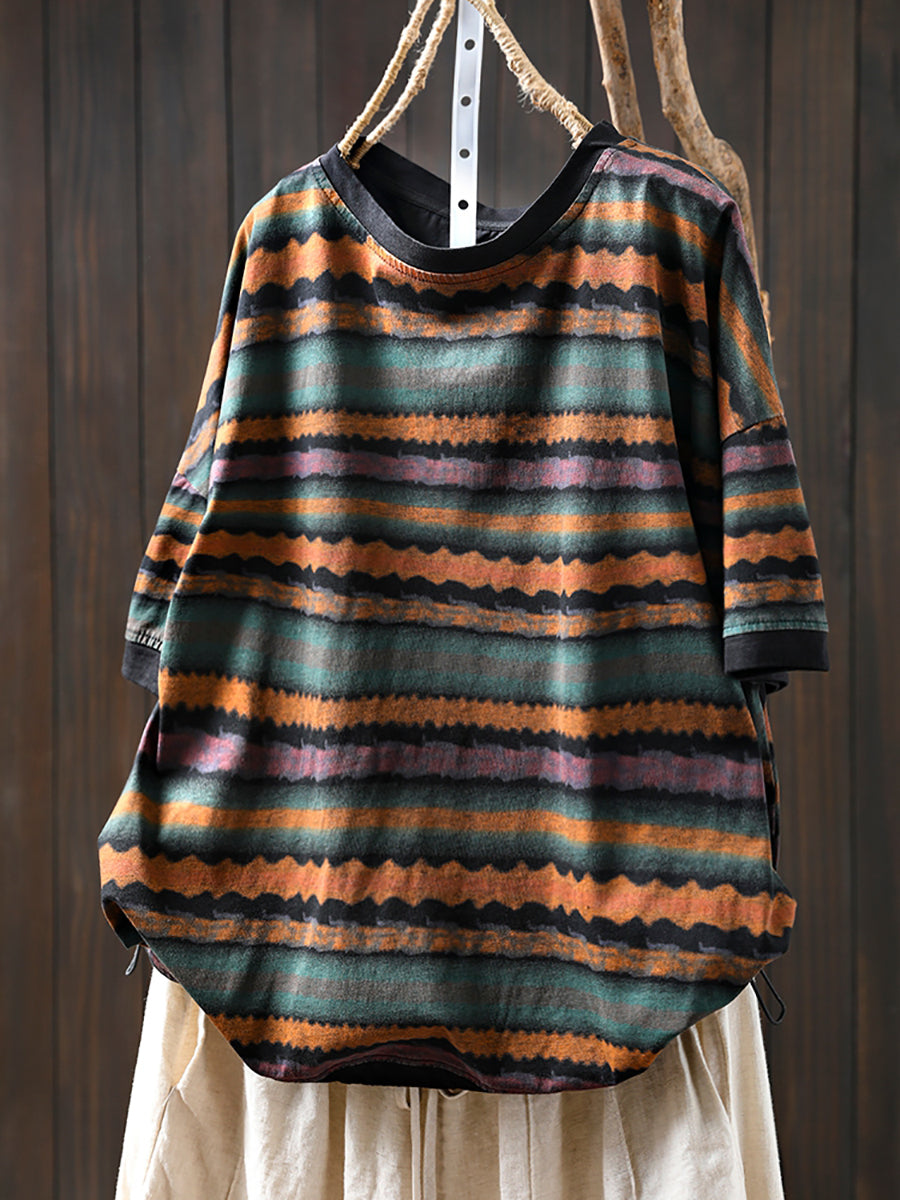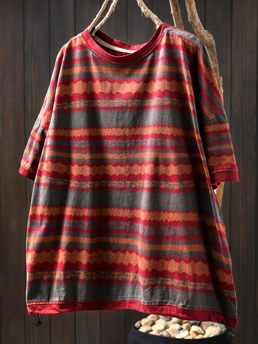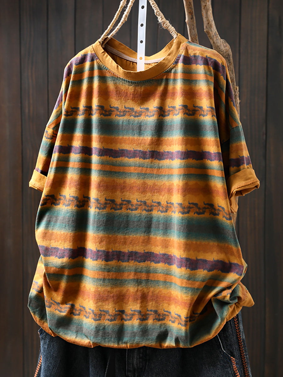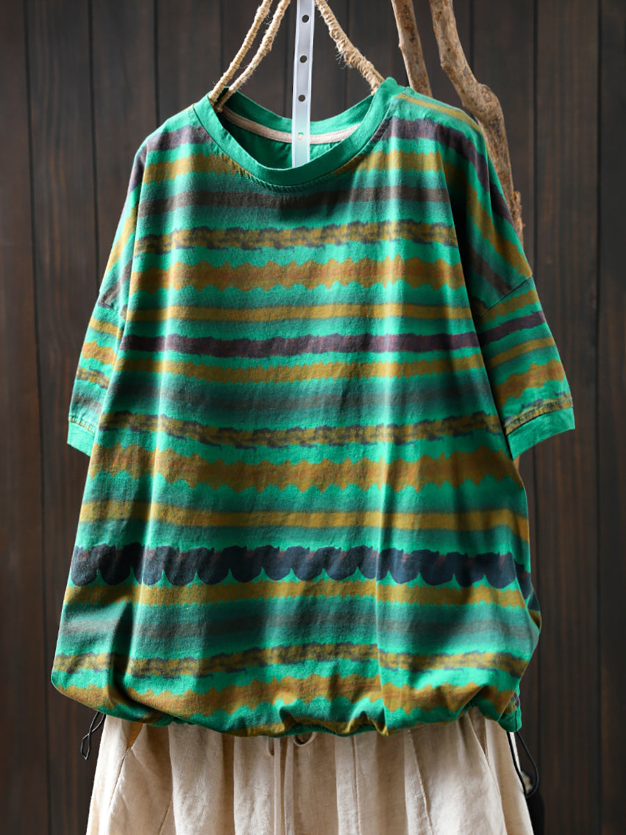 Women Summer Vintage Stripe Cotton O-Neck Shirt