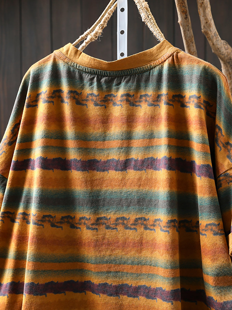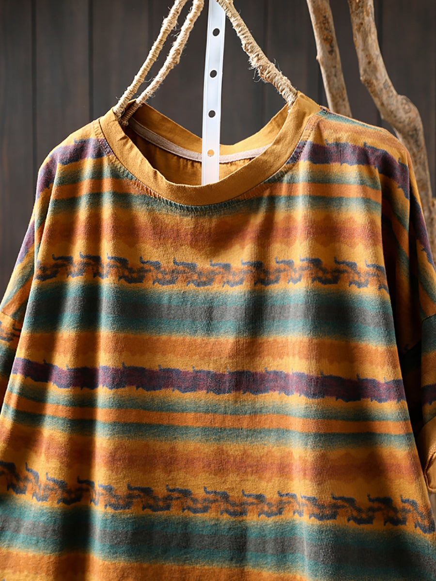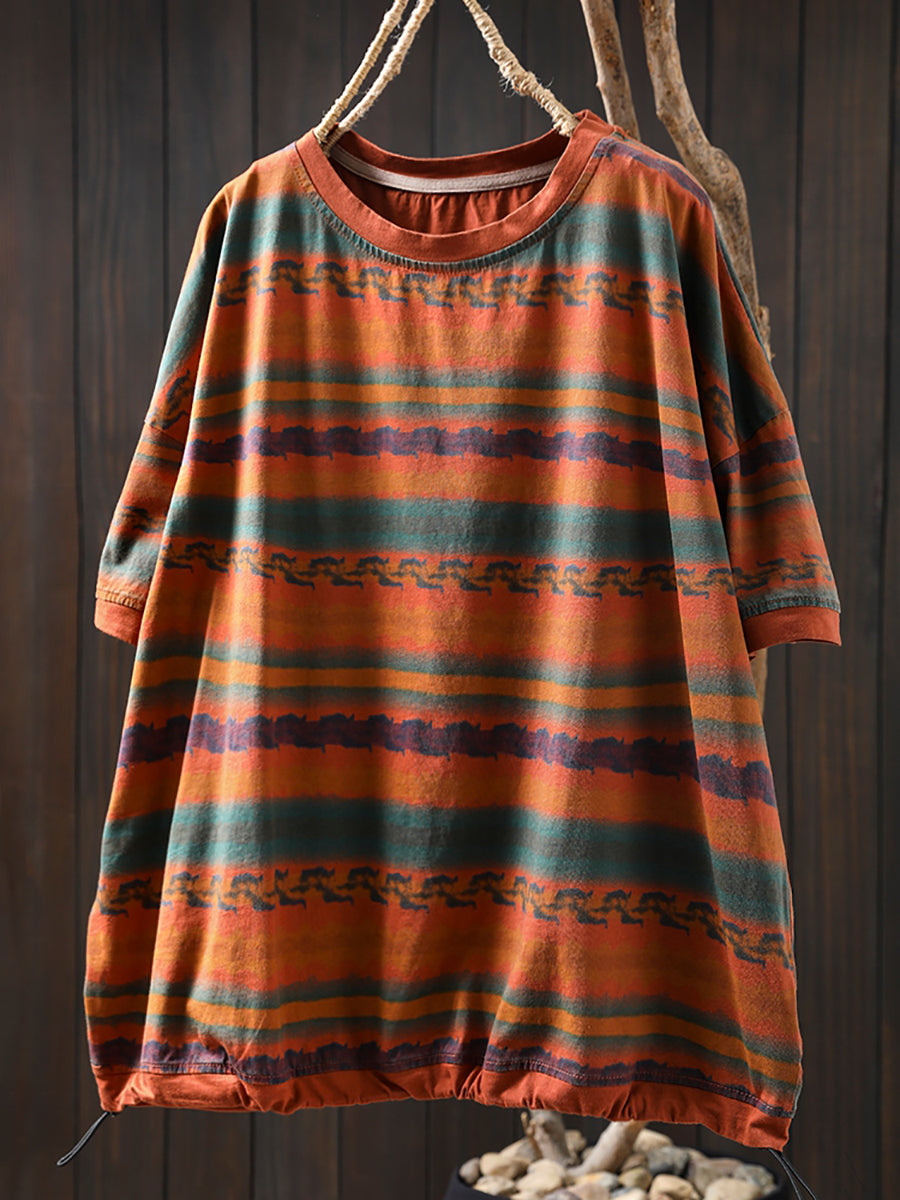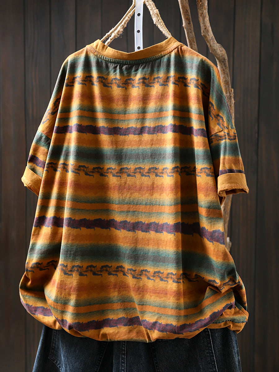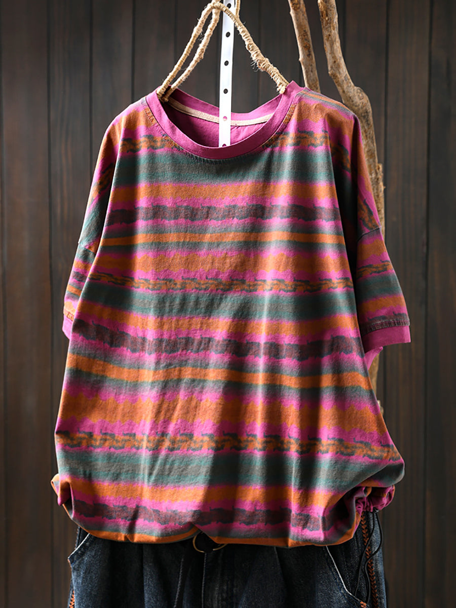 Women Summer Vintage Stripe Cotton O-Neck Shirt
