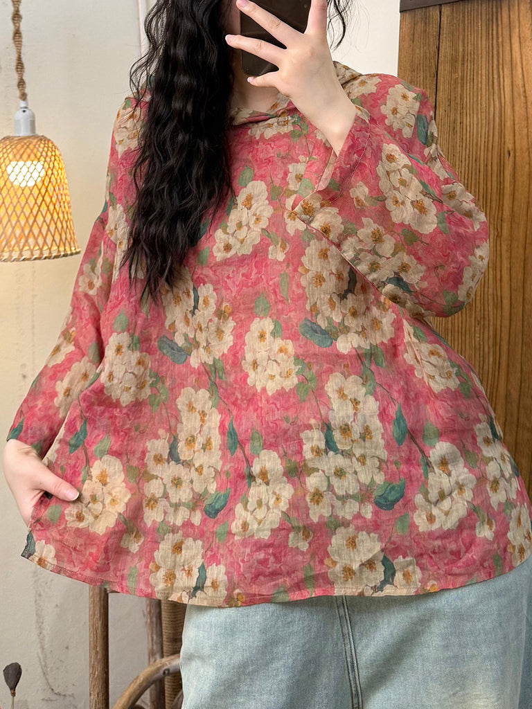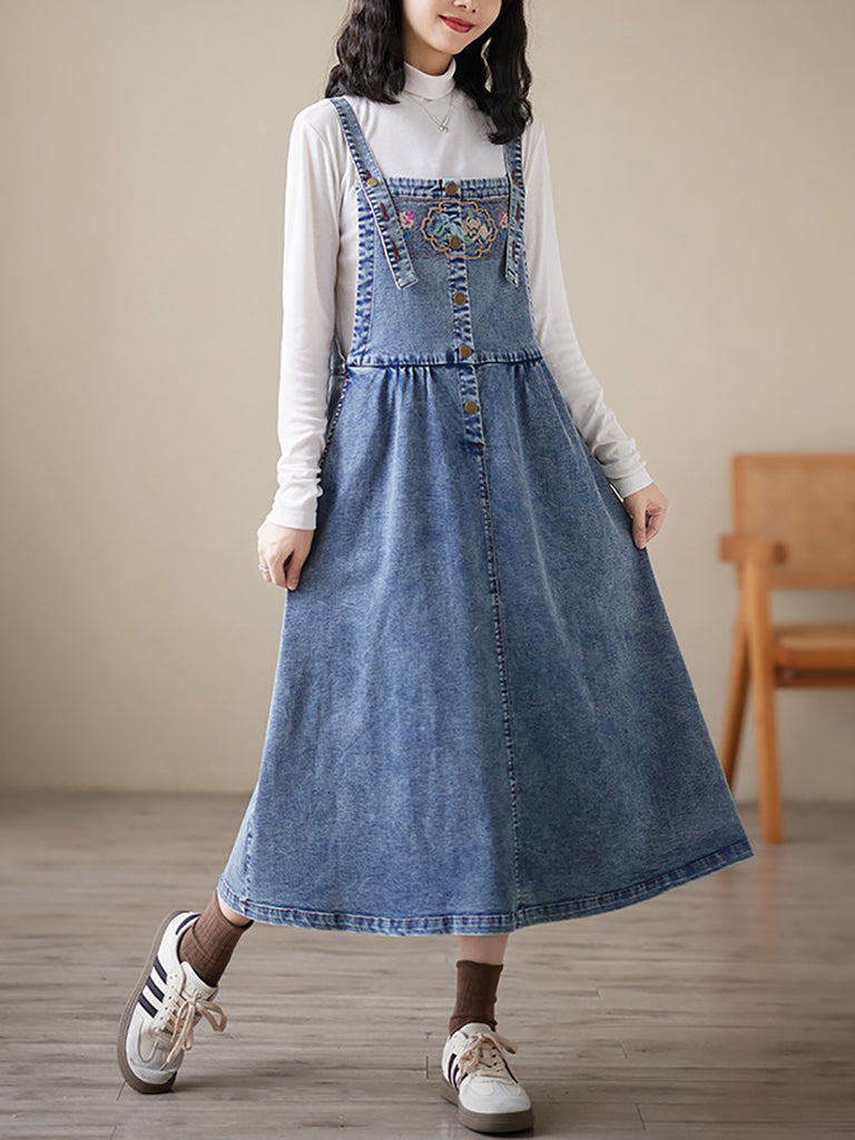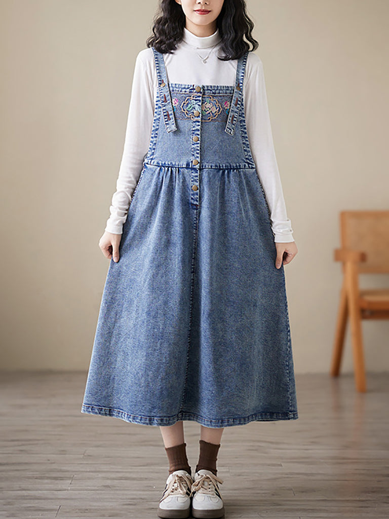 Women Summer Artsy Flower Stand Collar Linen Dress