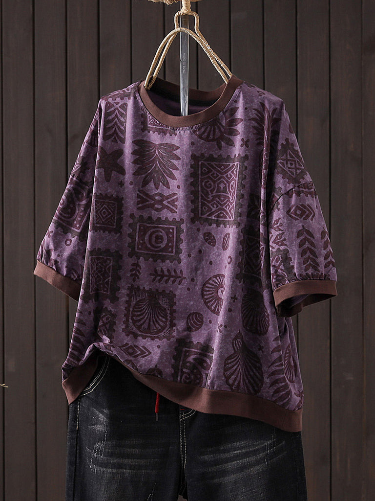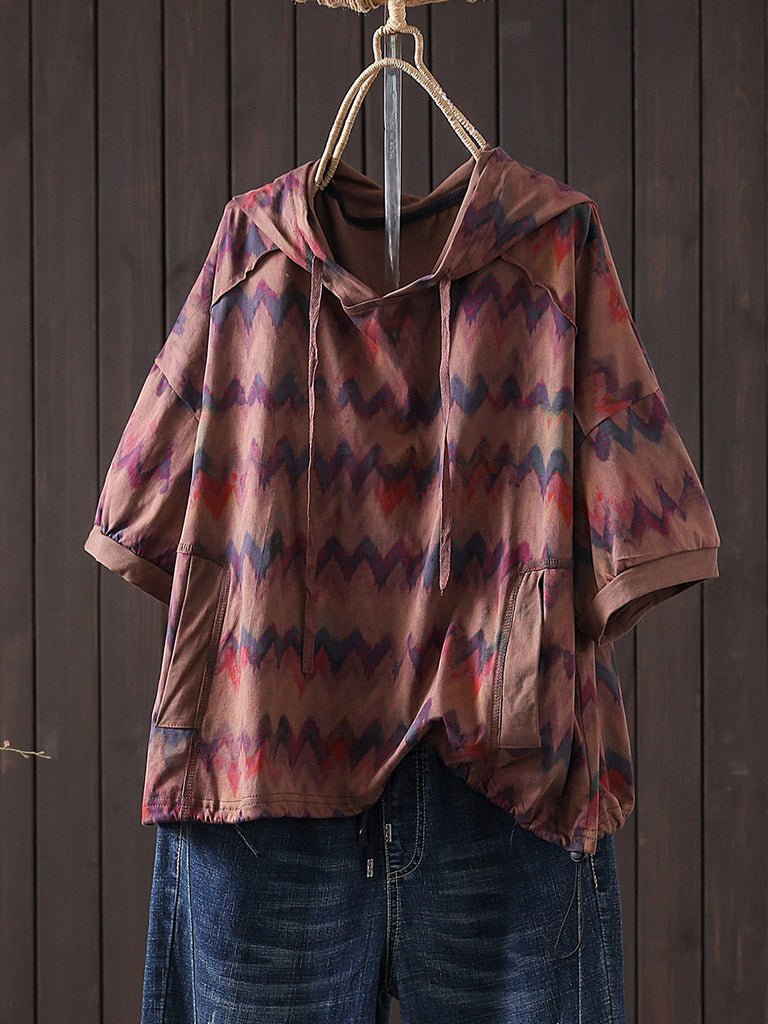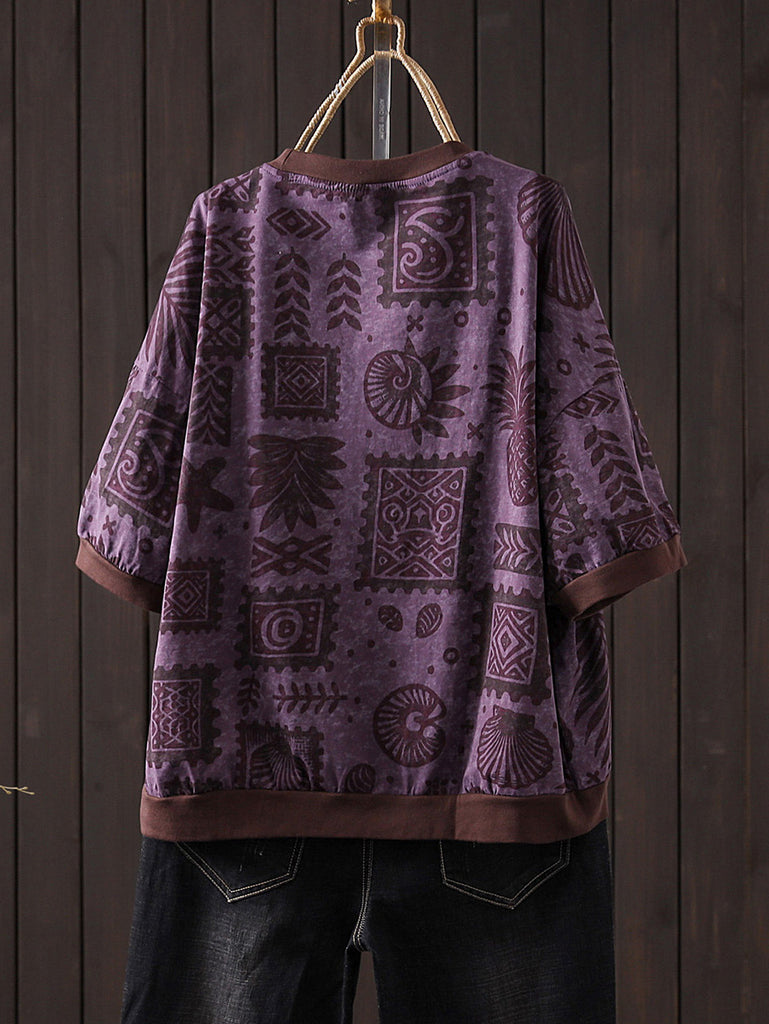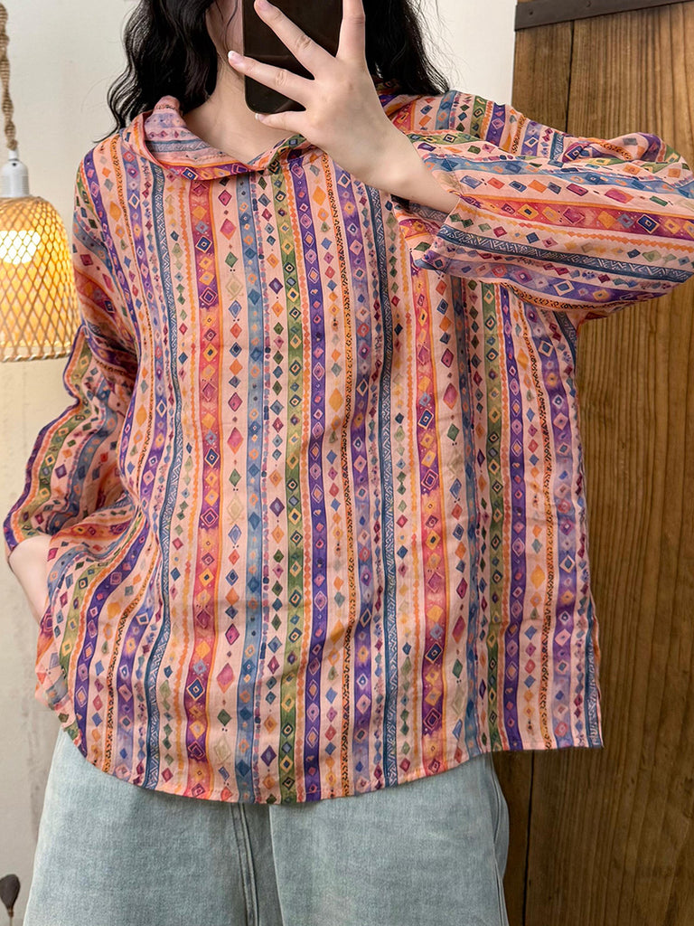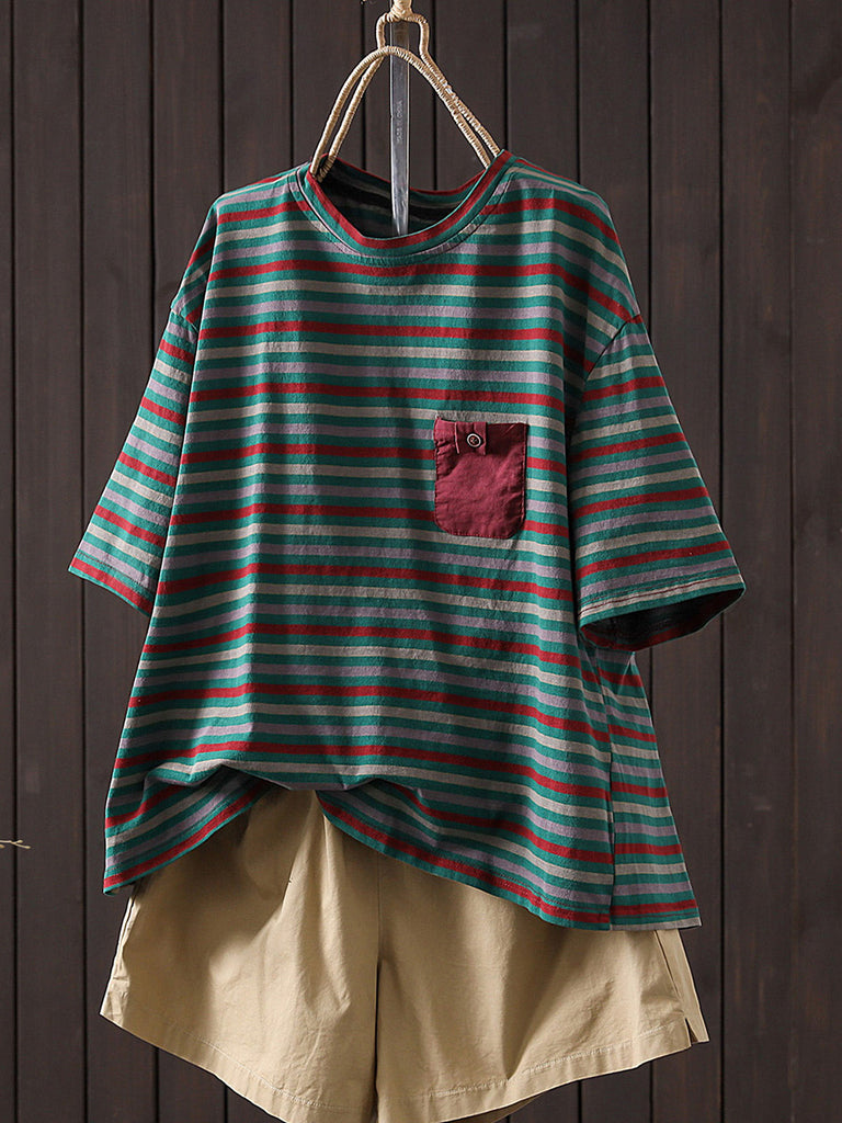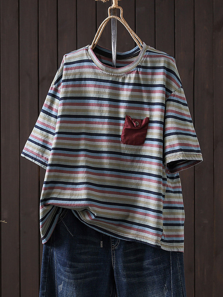 Women Summer Retro Stripe V-Neck Linen Shirt