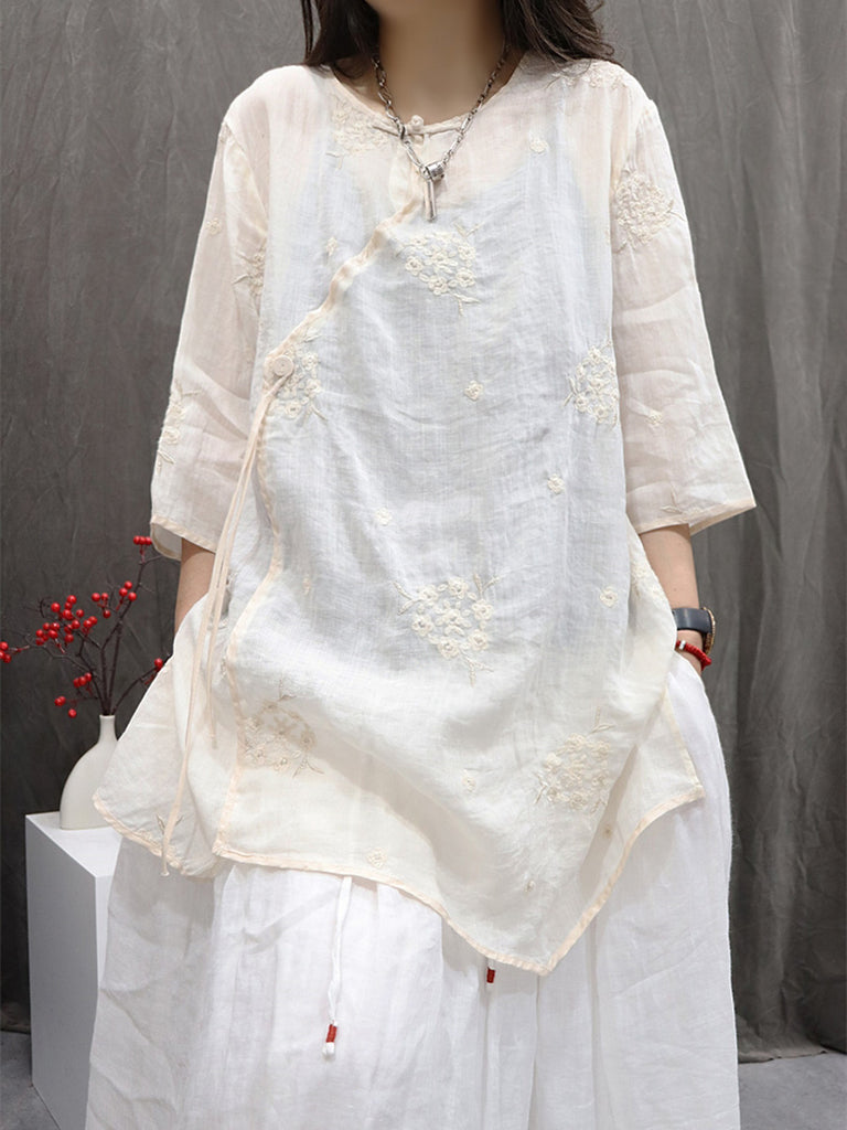 Women Summer Flower Embroidery O-Neck 100%Ramie Shirt