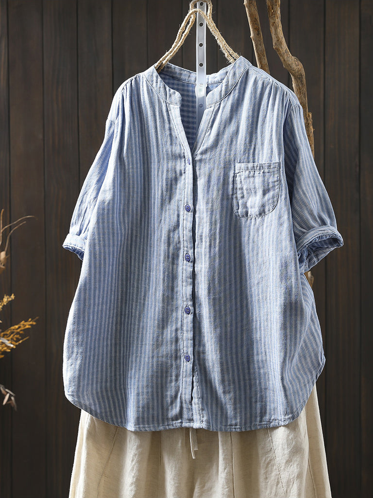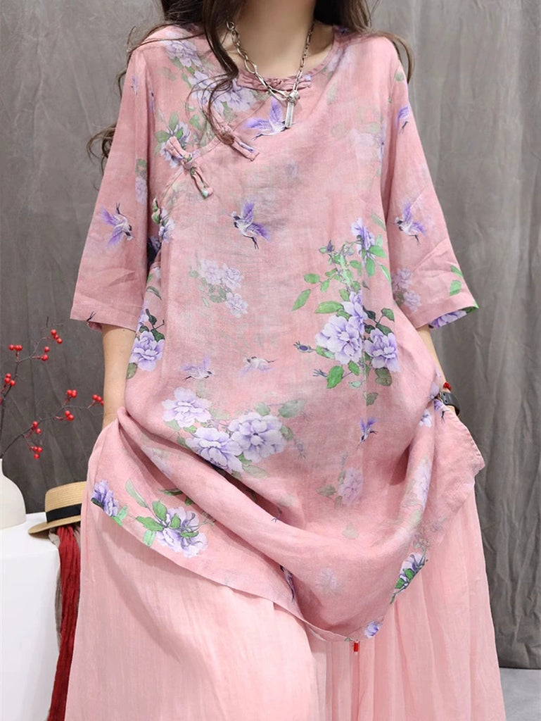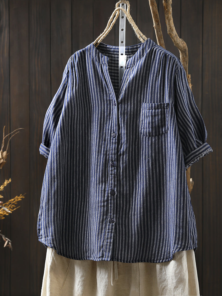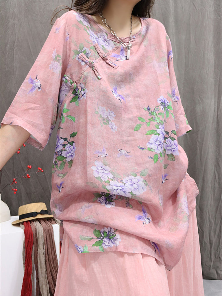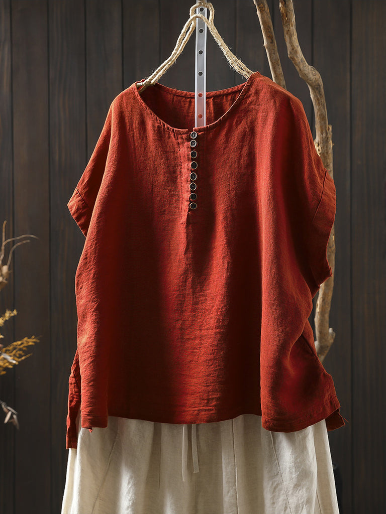 Plus Size Women Summer Casual Pure Color O-Neck 100%Linen Shirt