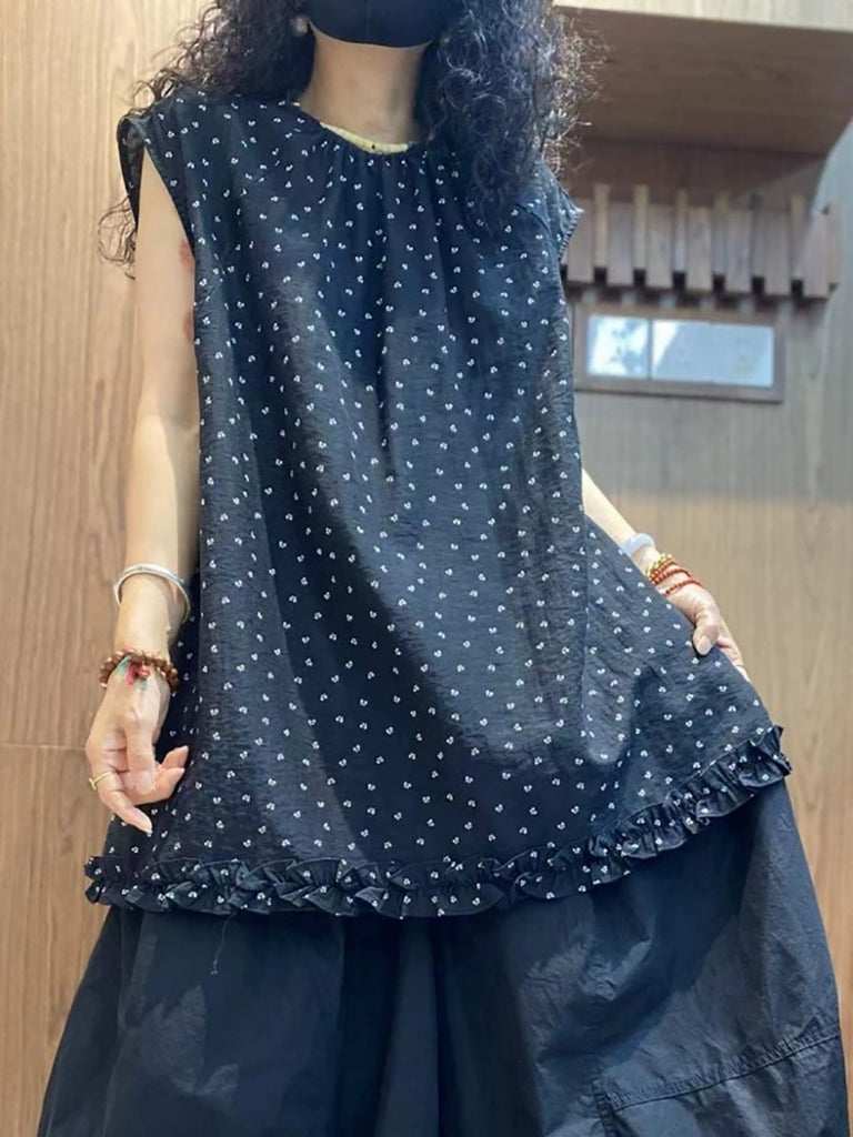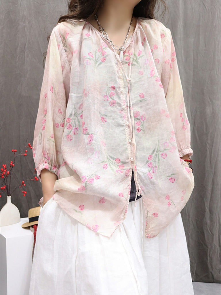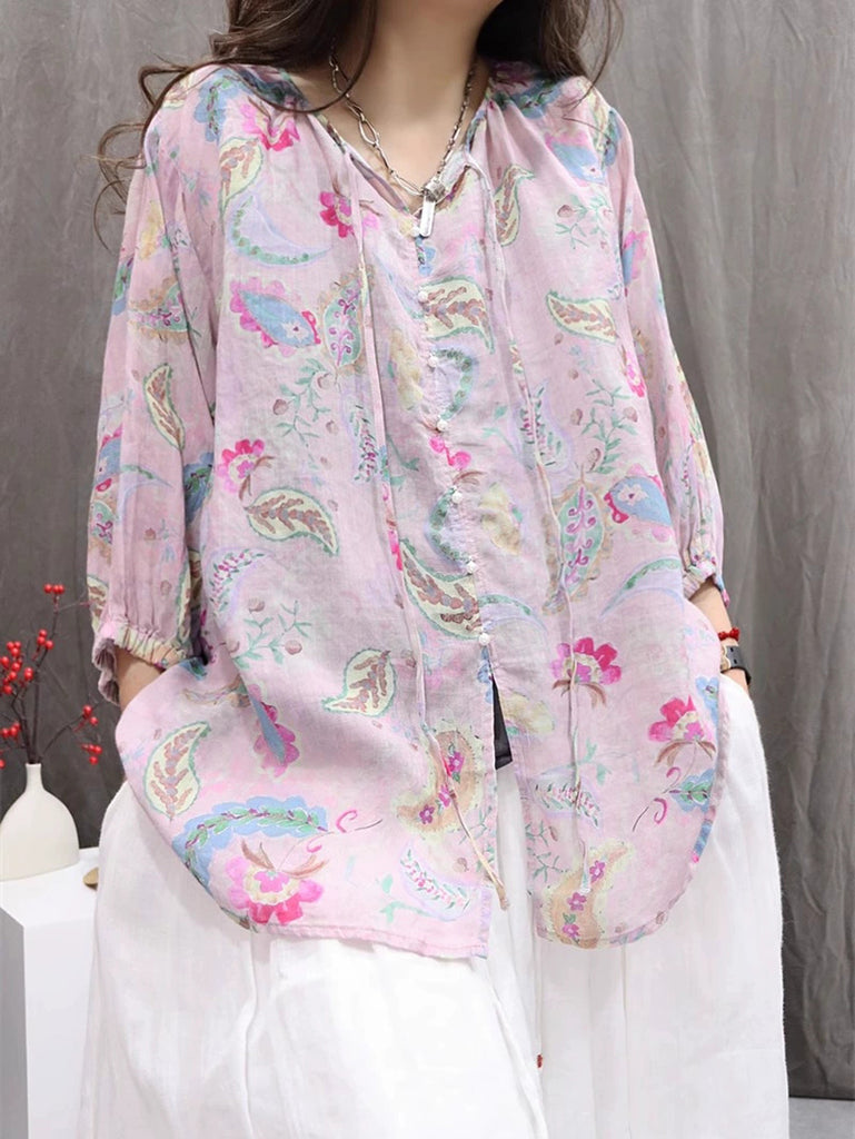 Plus Size Women Summer Artsy Flower Turn-down Collar Long Sleeve Shirt