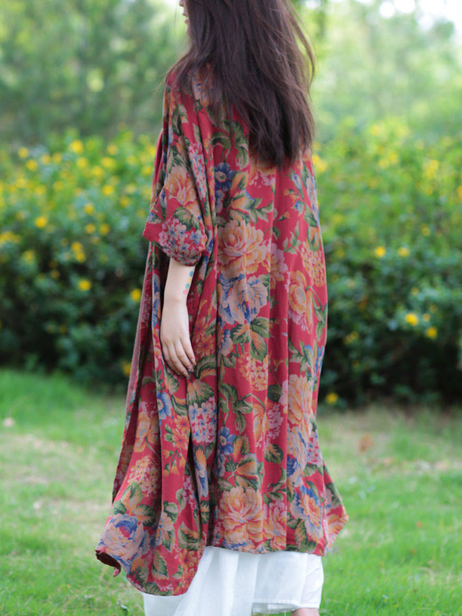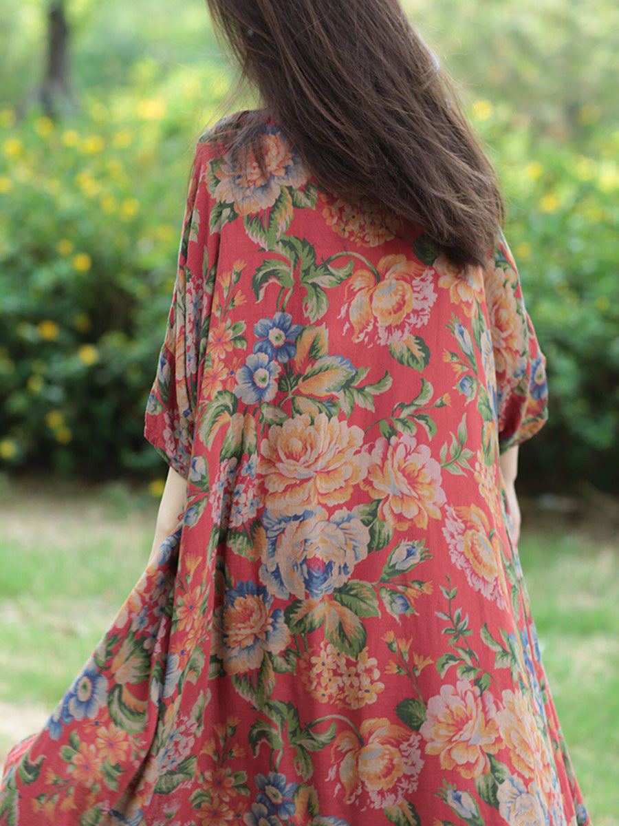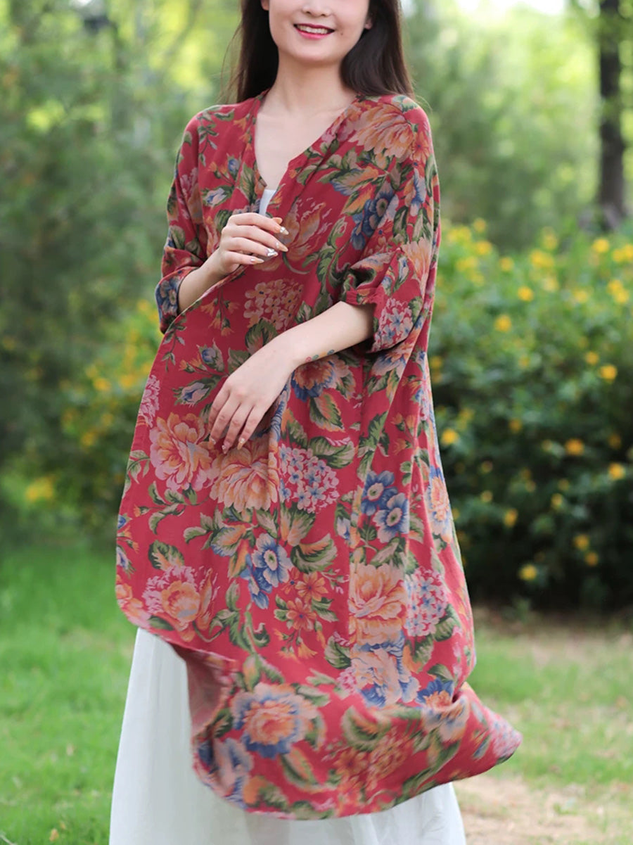 Women Summer Vintage Flower 100%Cotton V-Neck Blouse