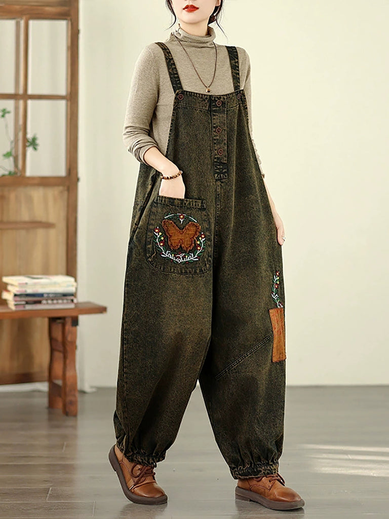 Women Vintage Patchwork Cotton Loose Denim Jumpsuits