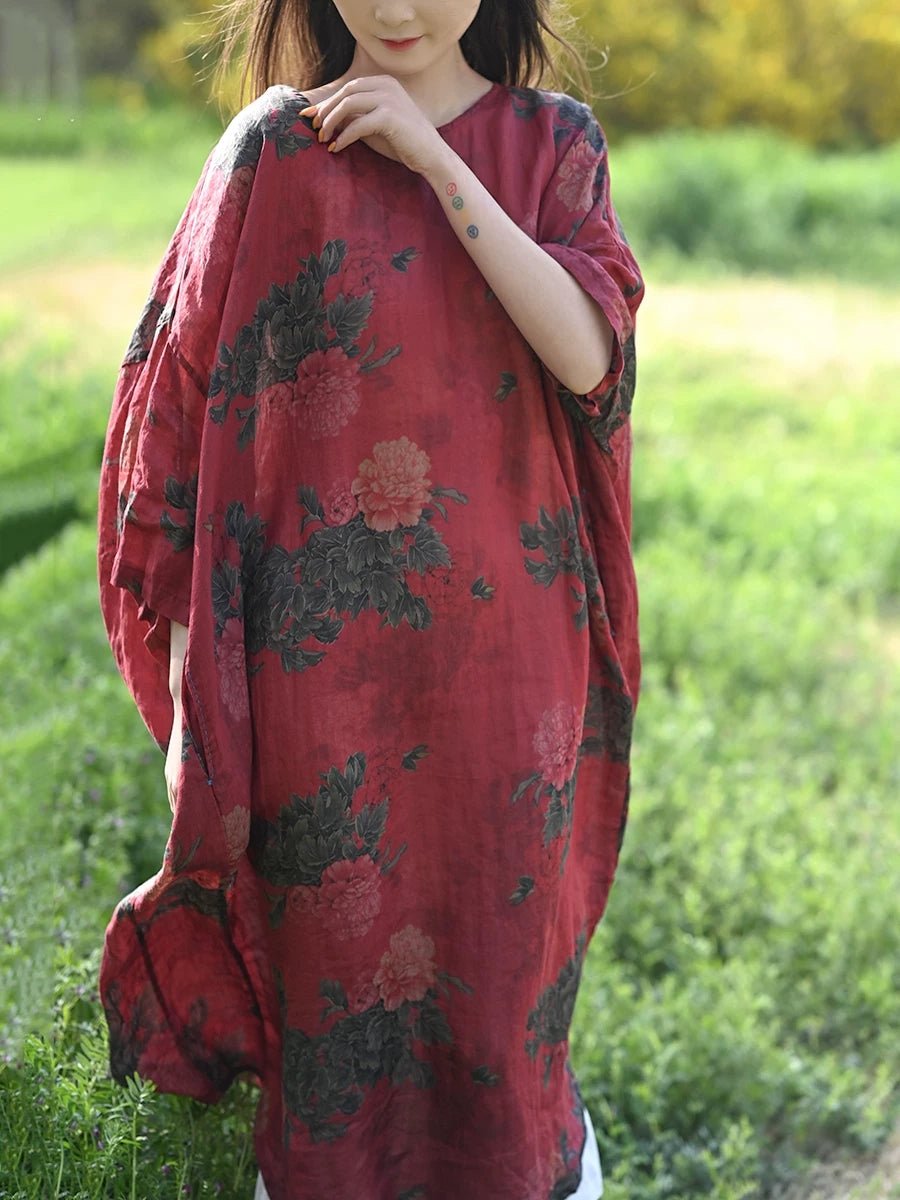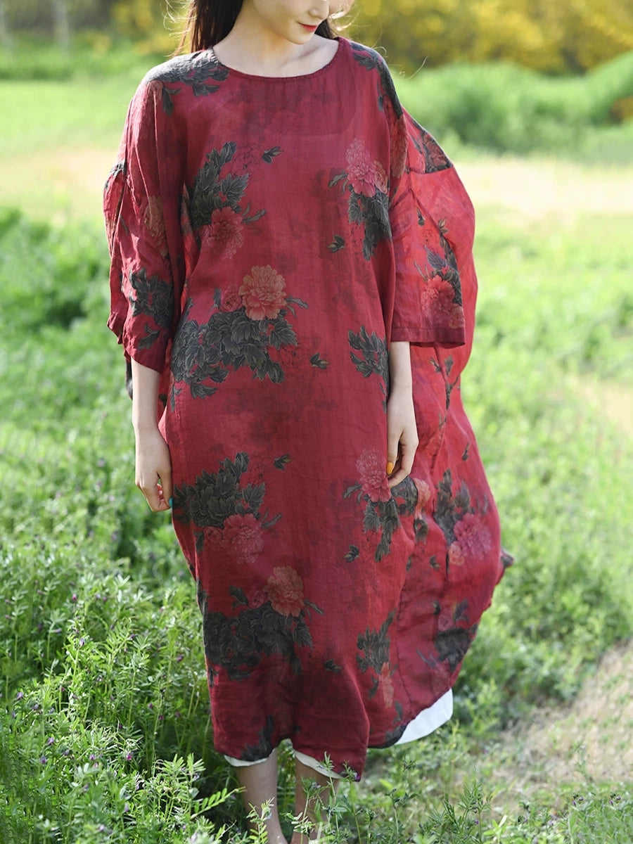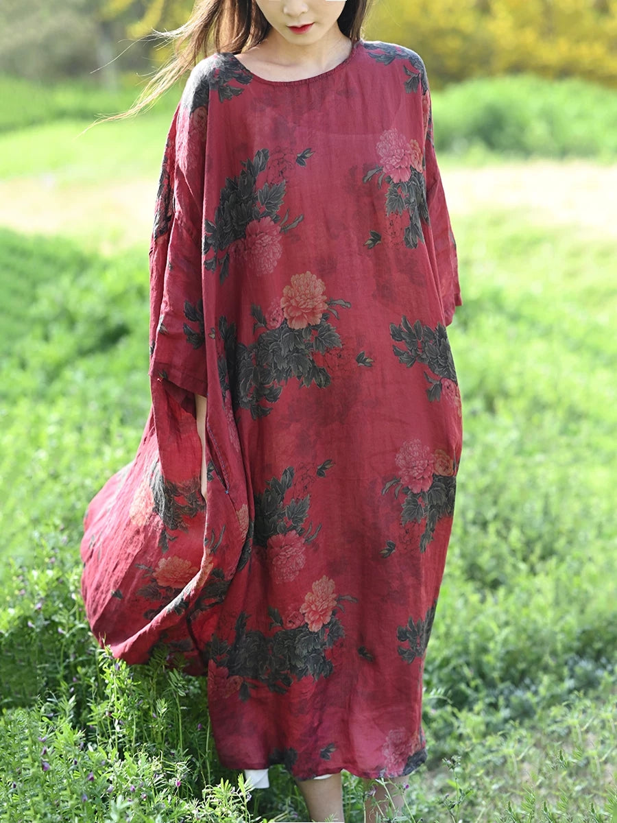 Women Summer Vintage Flower 100%Ramie Robe Dress