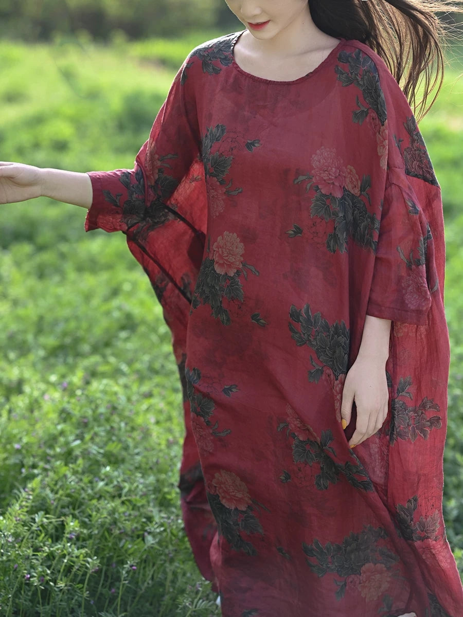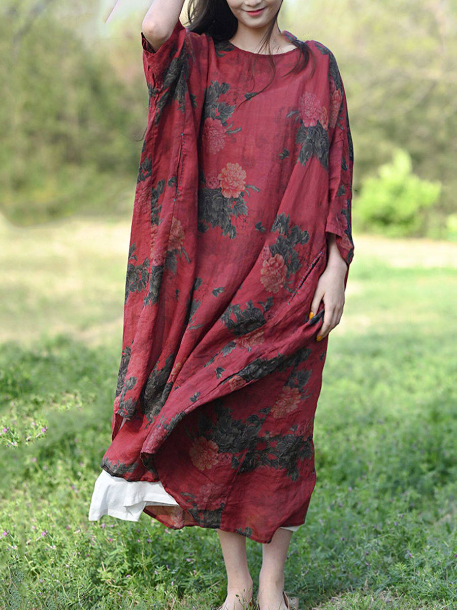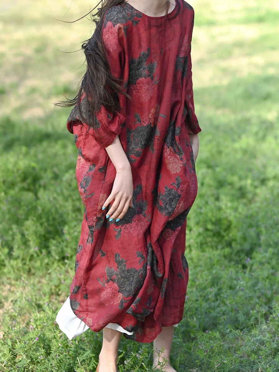 Women Summer Vintage Flower 100%Ramie Robe Dress
