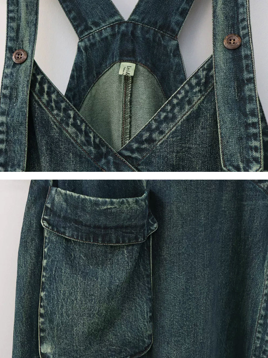 Constructed from high-quality cotton and designed with a solid pattern, this retro-style overall dress boasts an ankle length for a classic and sophisticated look.