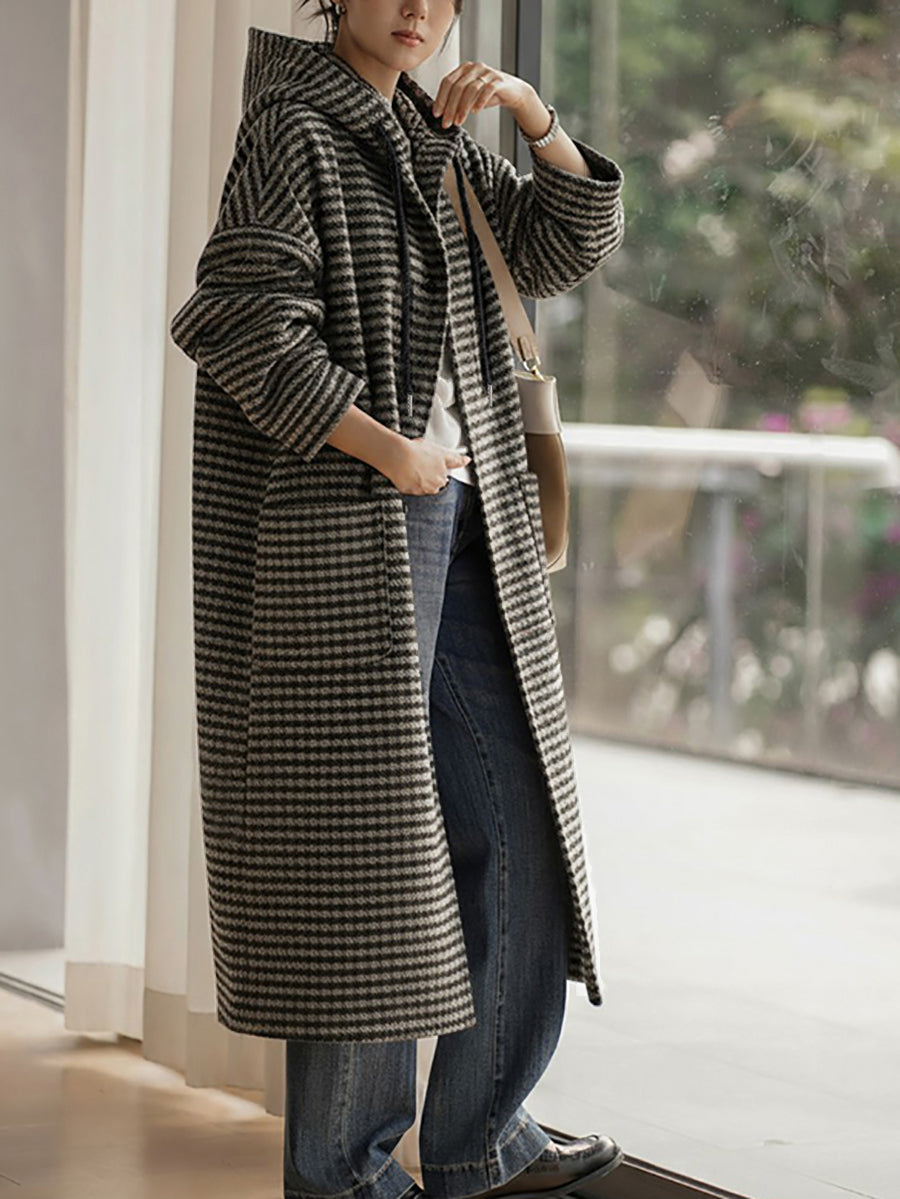 Plus Size Women Vintage Winter Stripe Hooded Coat