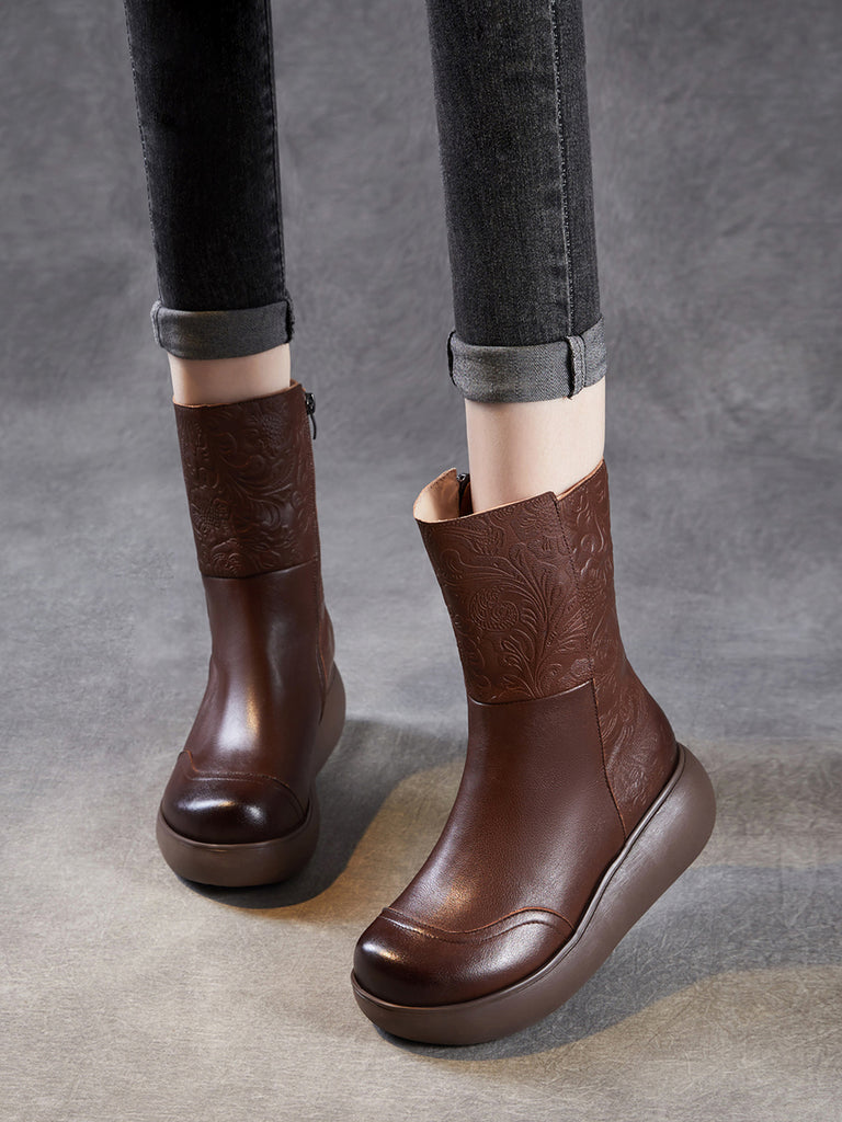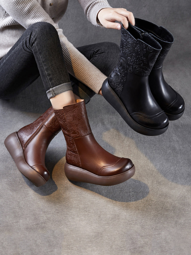 Women Winter Vintage Leather Flower Fleece-lined Boots