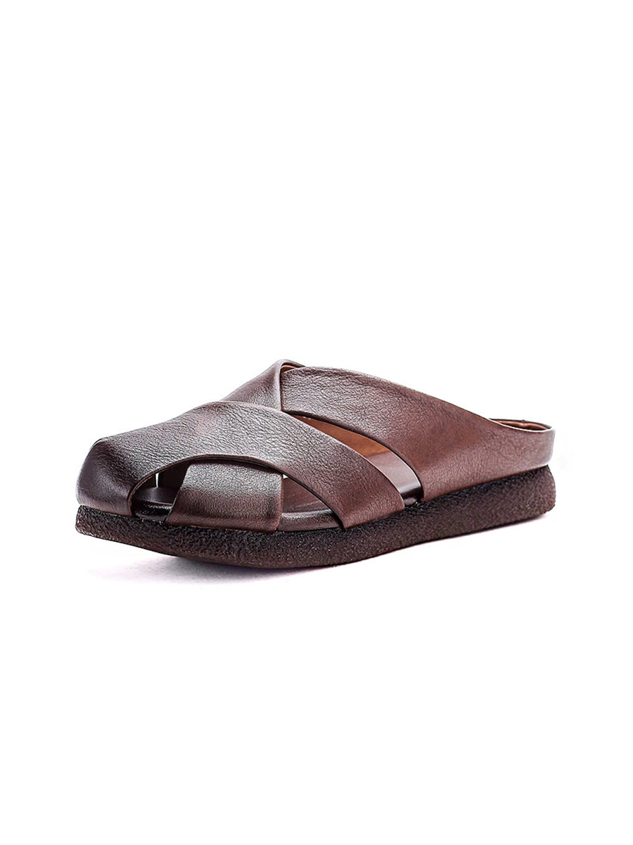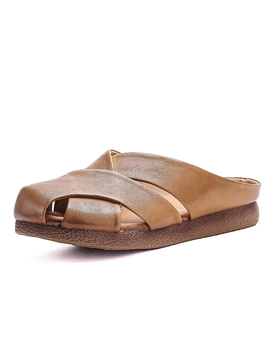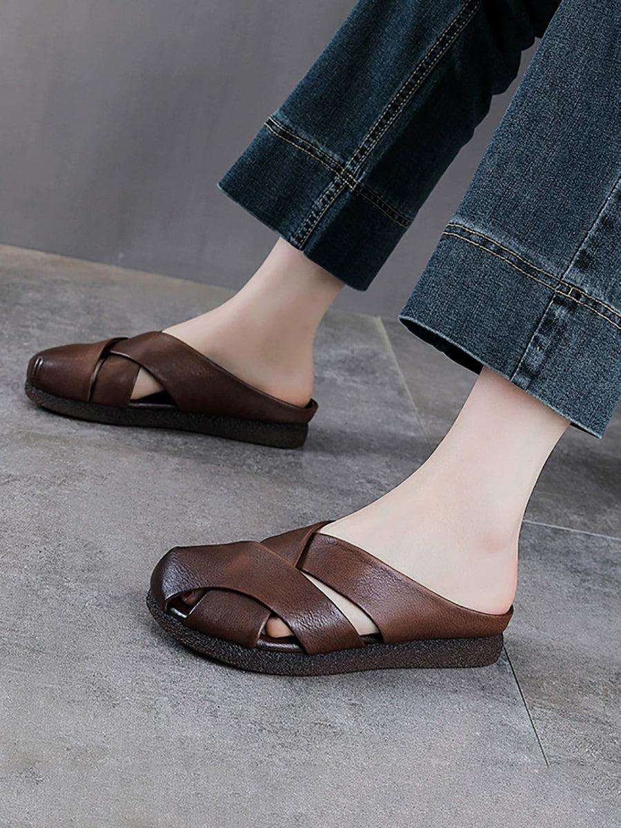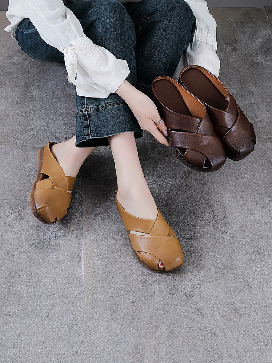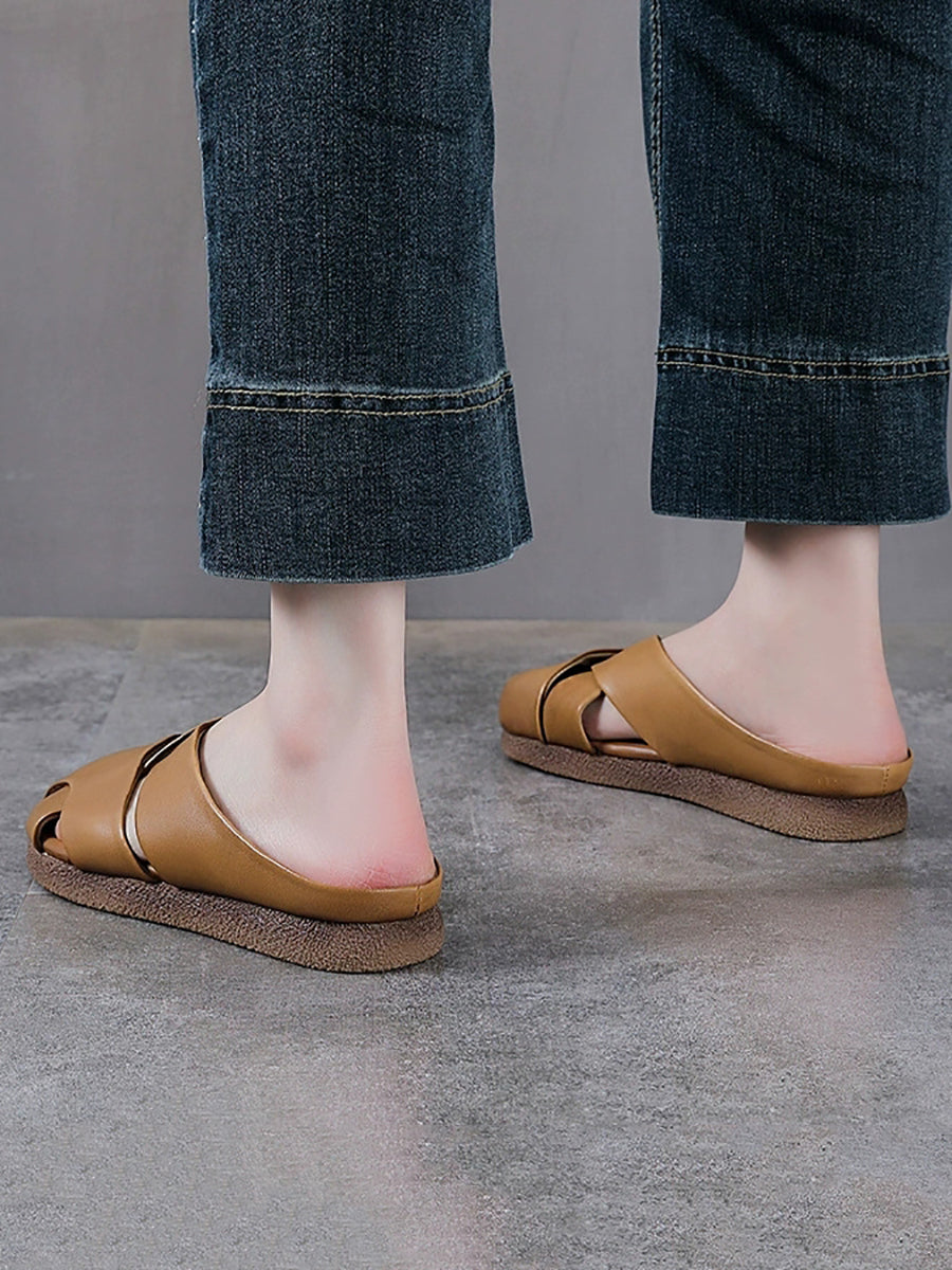 Women Vintage Summer Genuine Leather Weave Slippers