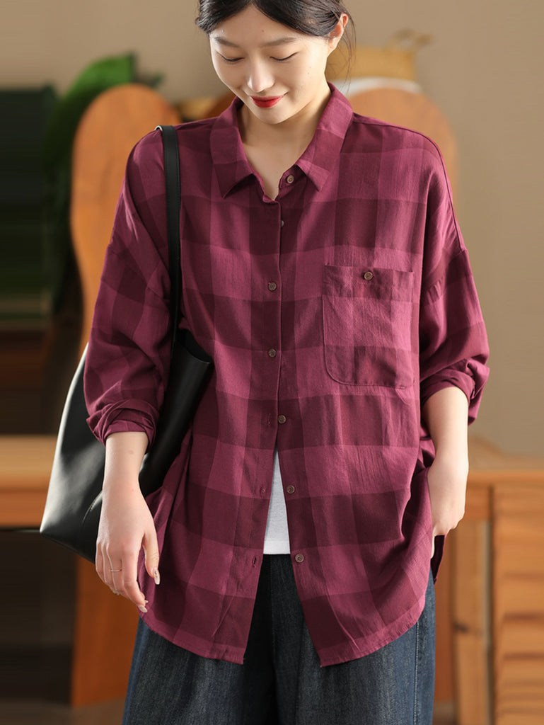 Plus Size Women Spring Turn-down Collar Plaid Linen Shirt