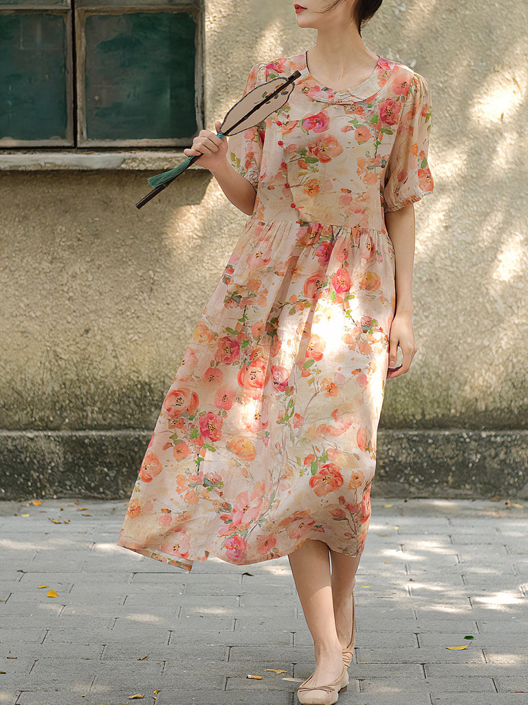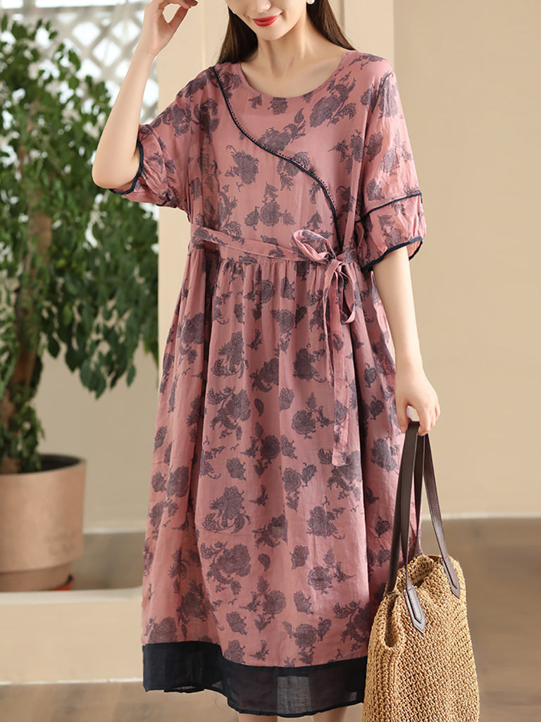 Women Ethnic Summer Flower Print Buckle Ramie Dress