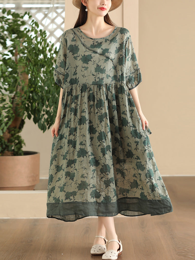 Plus Size Women Vintage Summer Floral Button Loose Ramie Dress