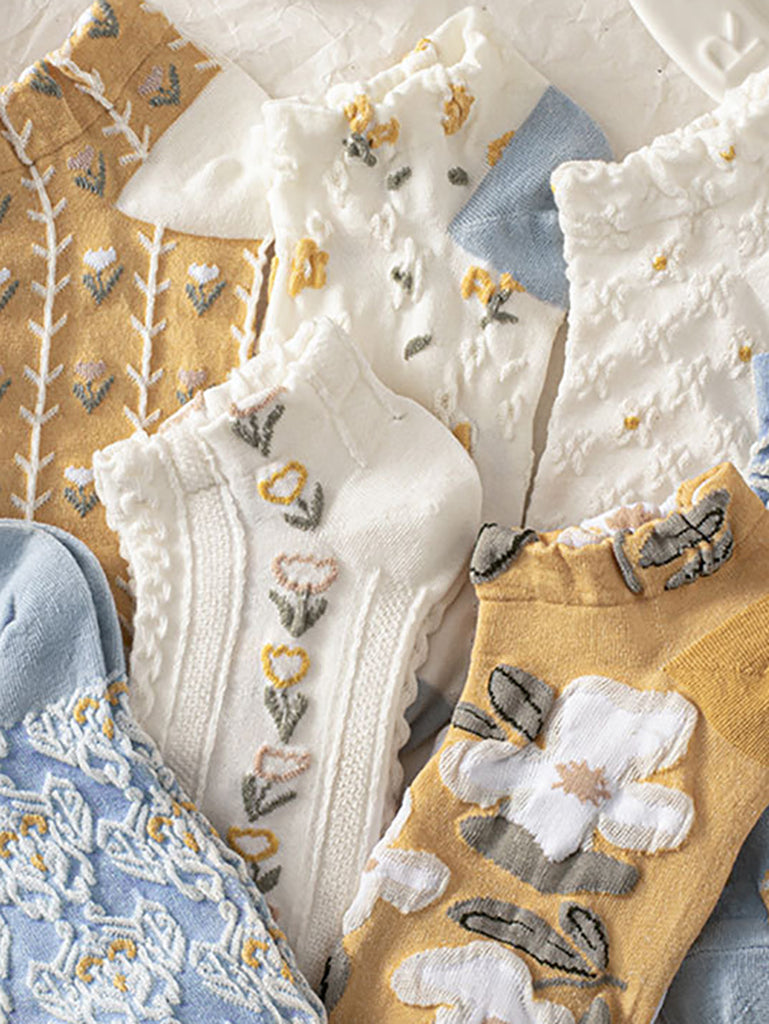 5 Pairs Women Autumn Flower Embossment Cotton Socks