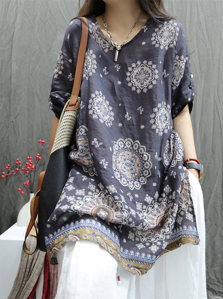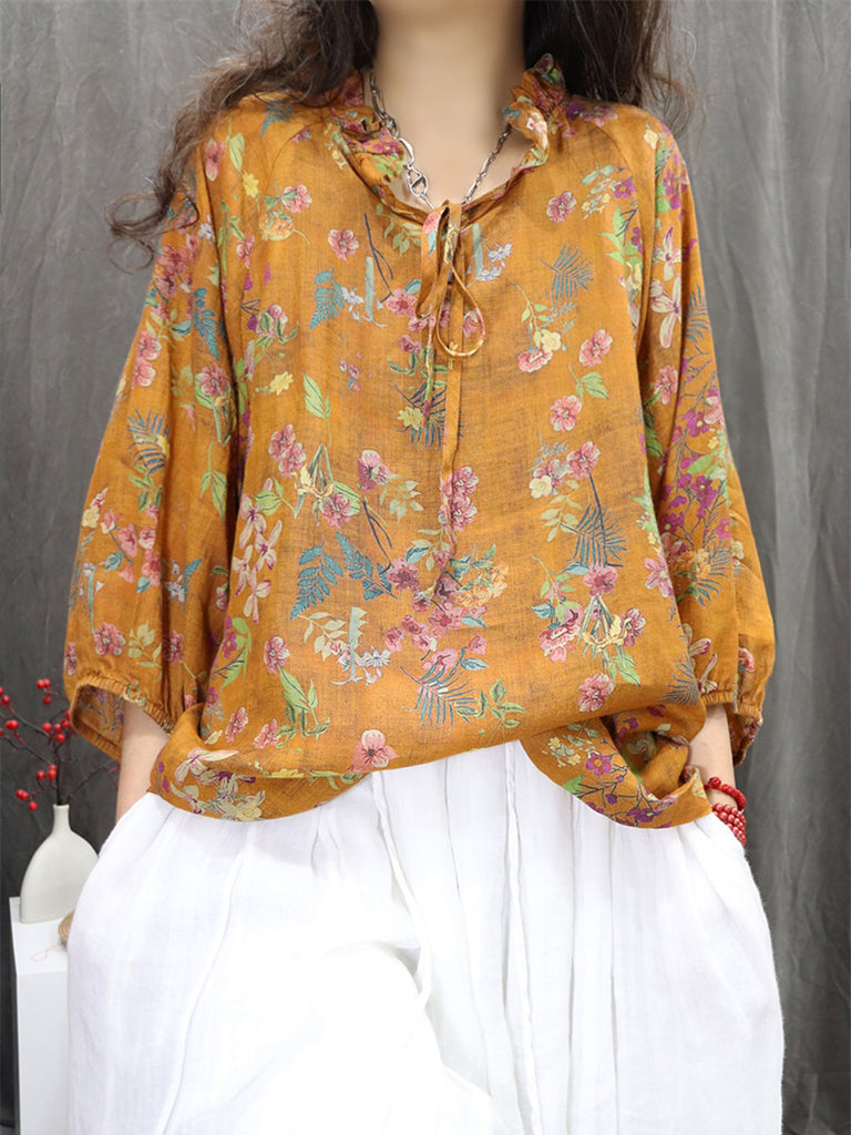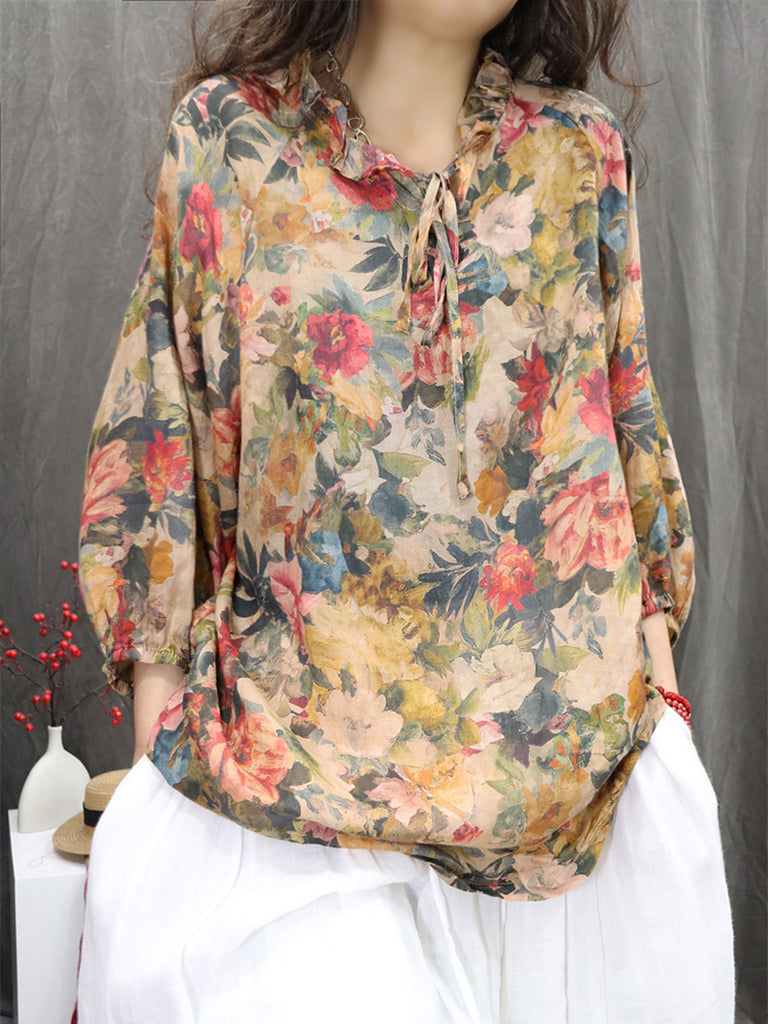 Plus Size Women Summer Vintage Flower Ramie Blouse M-4XL