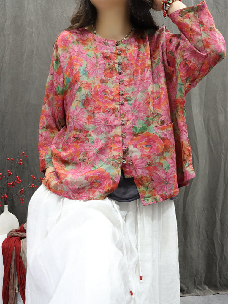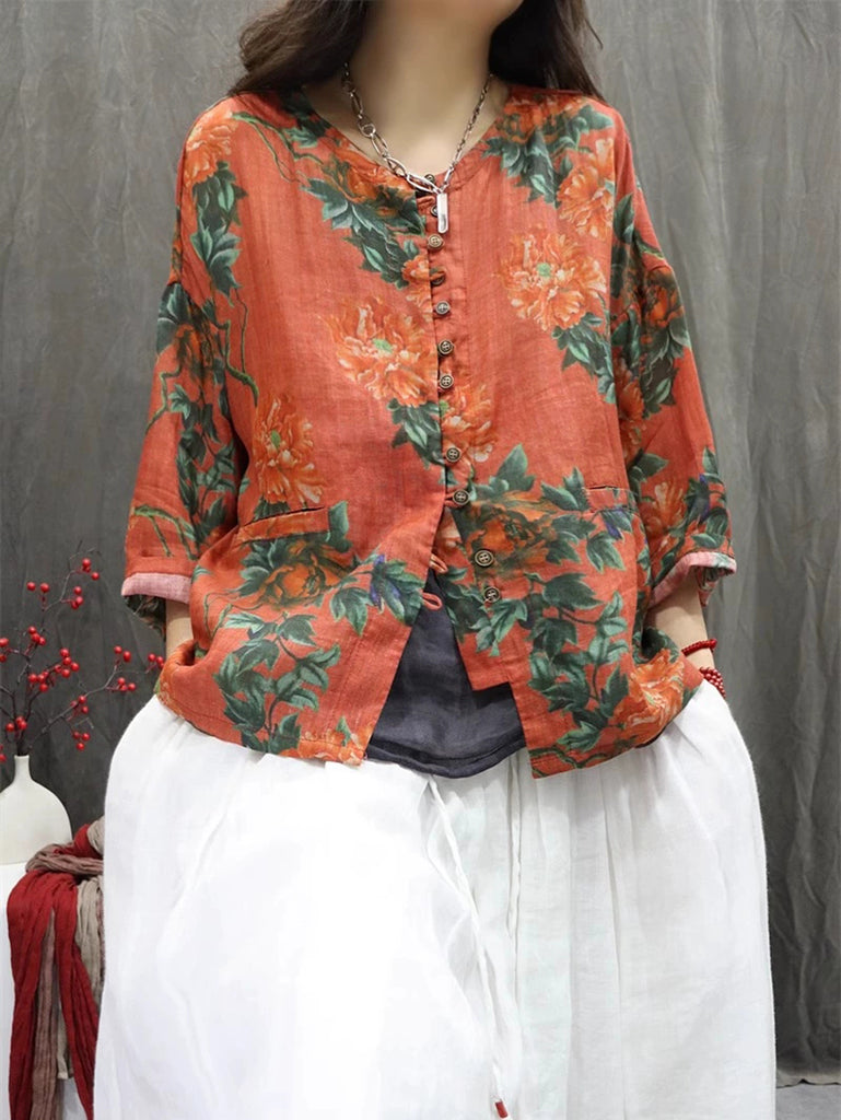 Plus Size Women Summer Stand Collar Flower 100%Ramie Cardigan Shirt