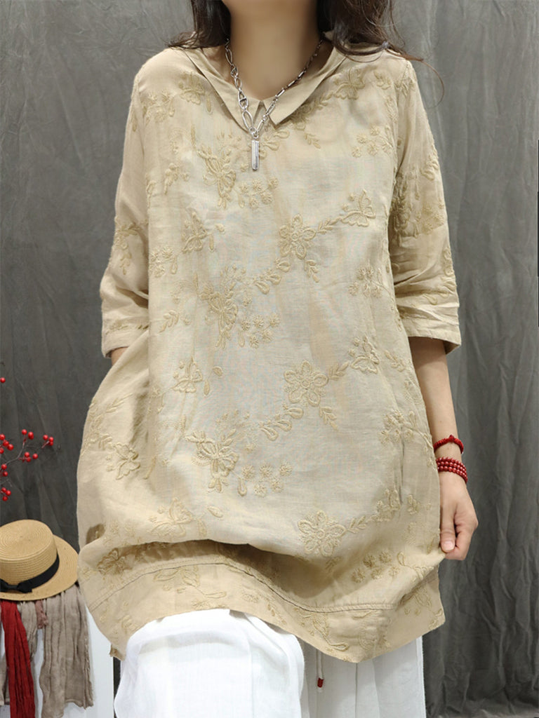 Plus Size Women Vintage Flower Stand Collar 100%Linen Long Shirt