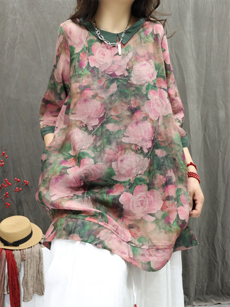 Women Spring Artsy O-Neck Flower 100%Ramie Shirt