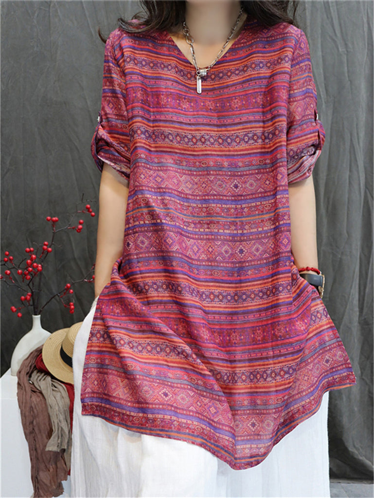 Plus Size Women Summer Retro Spliced V-Neck Loose Long Shirt