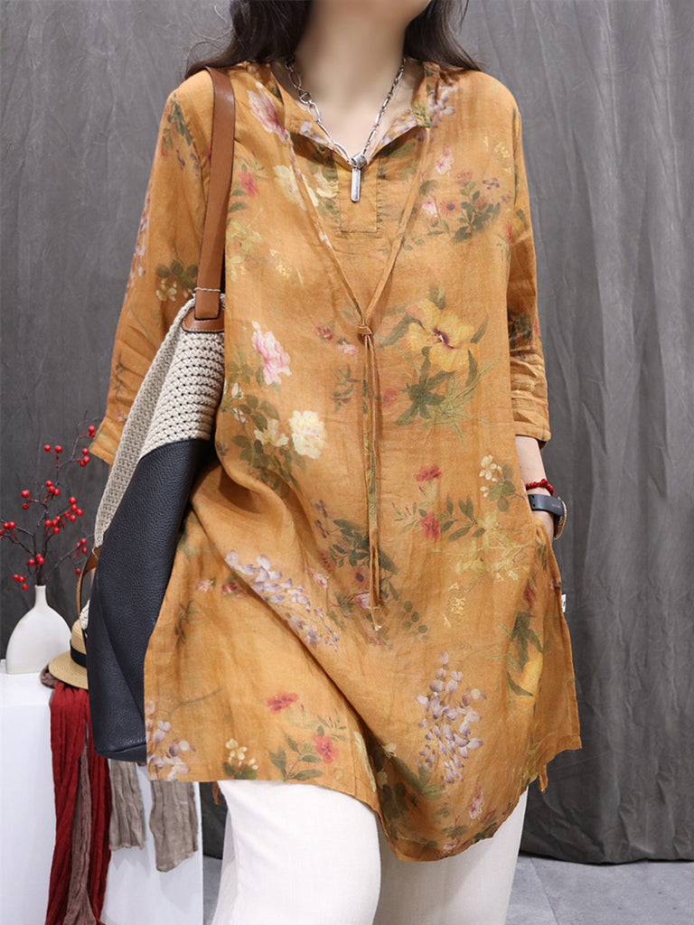 Women Summer Print V-Neck 100%Ramie Thin Long Shirt