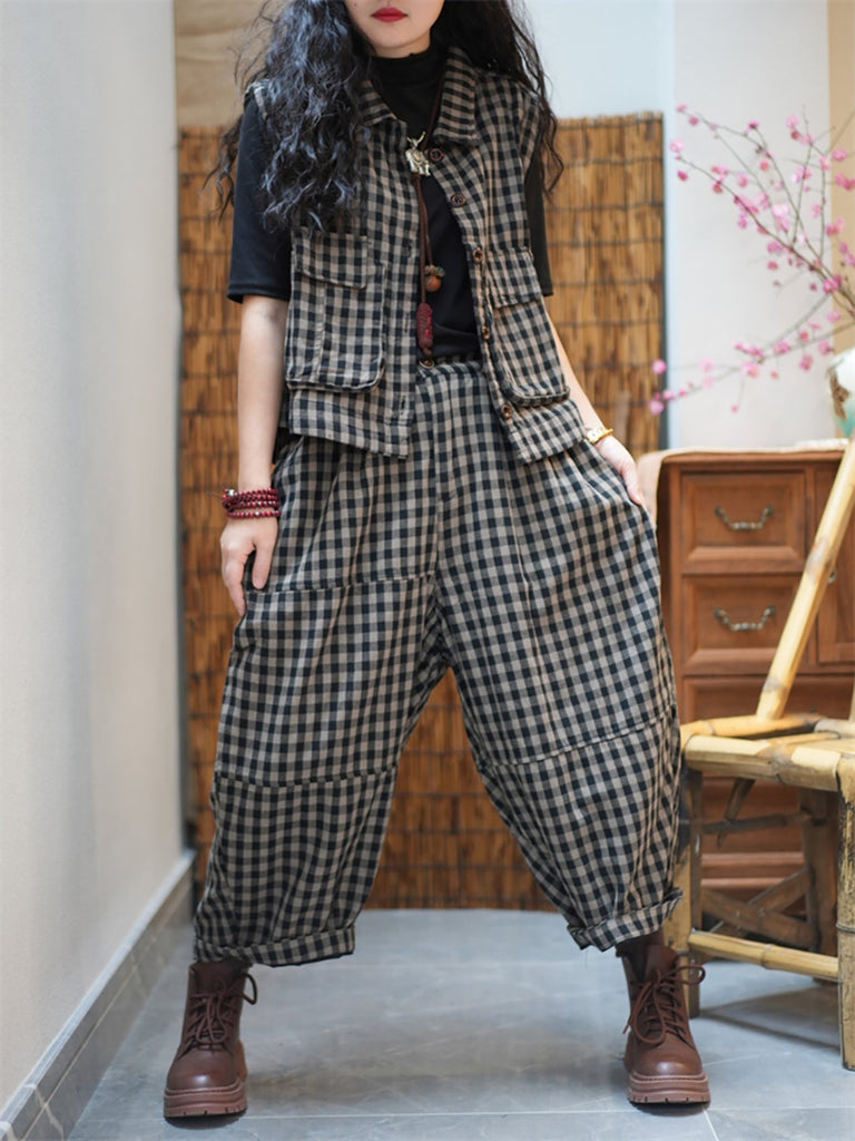 Plus Size Women Vintage Solid Linen Cotton Shirt+Pants