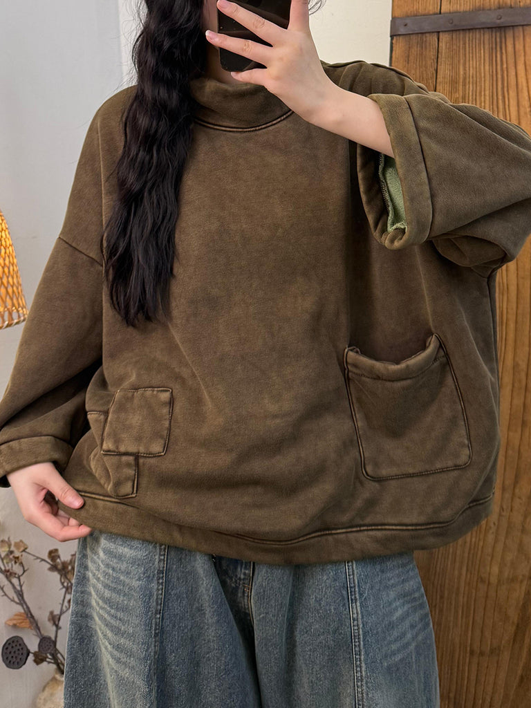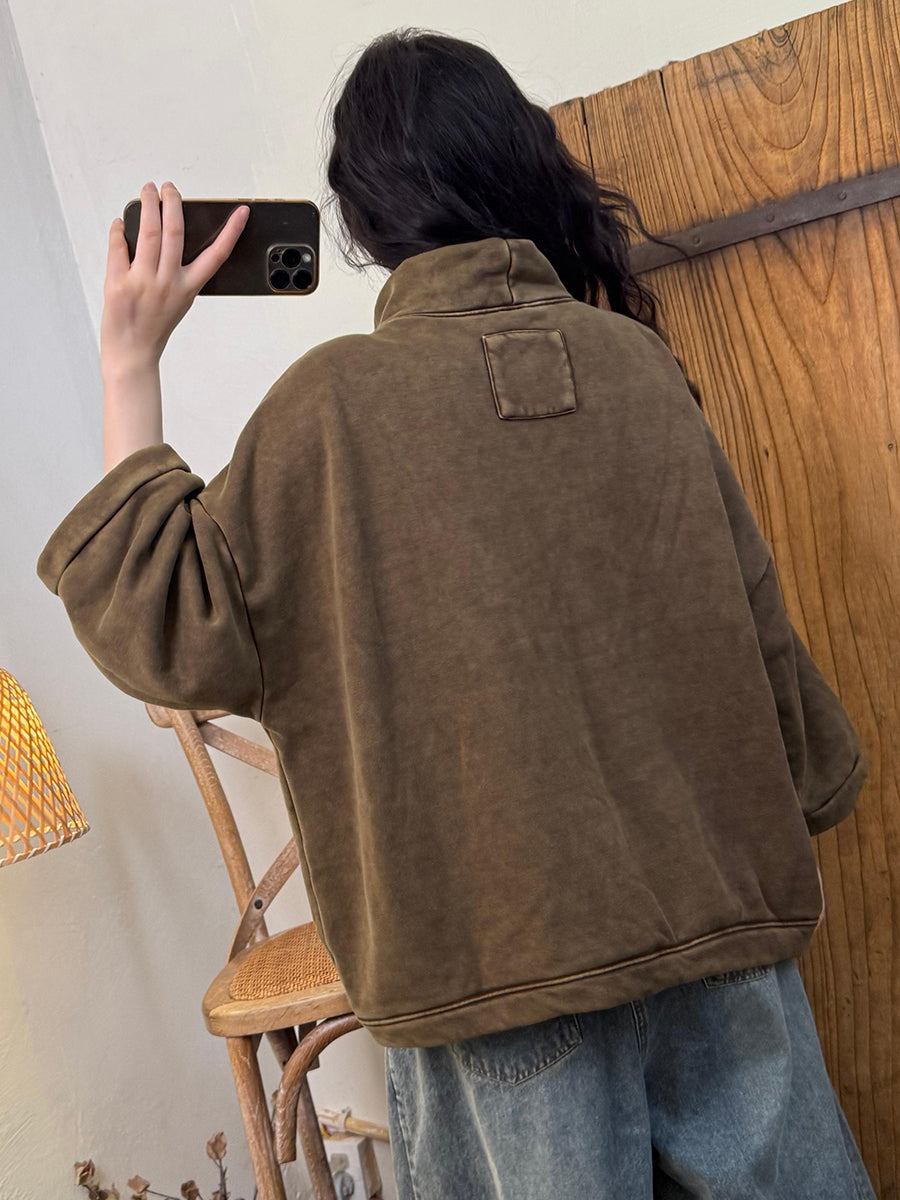 Women Vintage Autumn Stand Collar Fleece-lined Blouse
