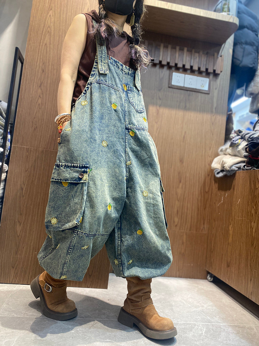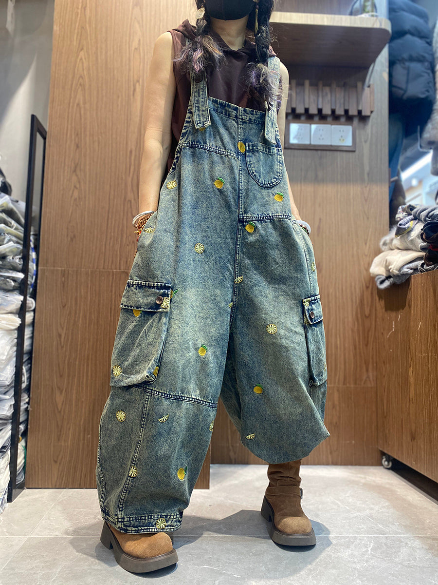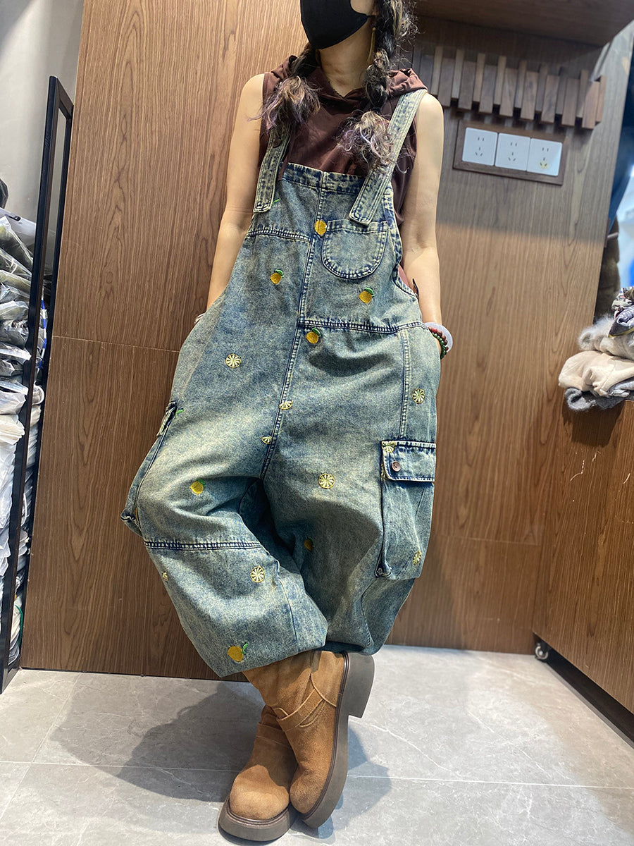 Women Vintage Embroidery Loose Denim Jumpsuits