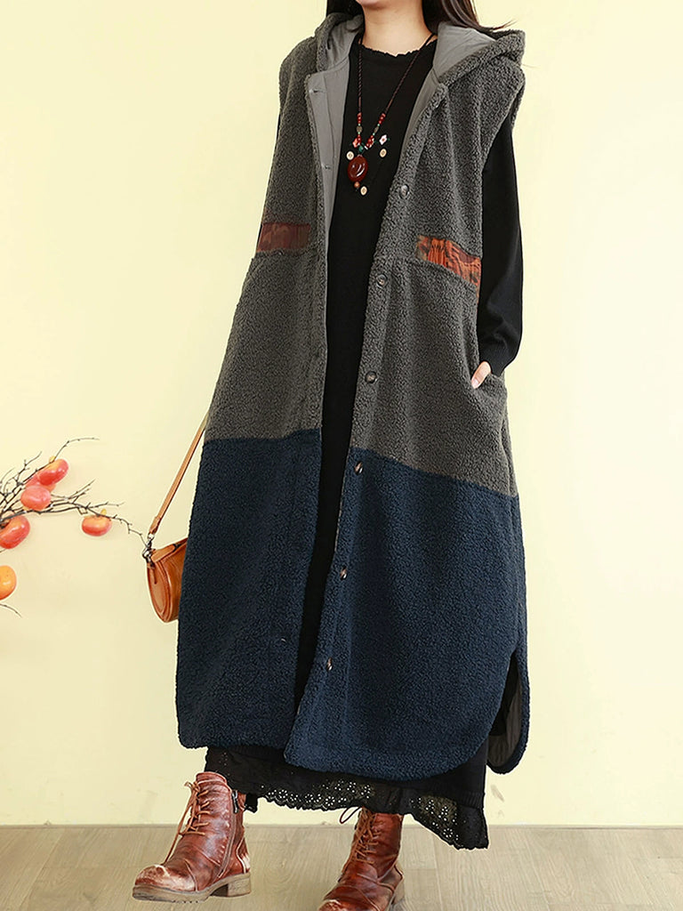 Women Winter Fleece Colorblock Hooded Padded Vest Coat