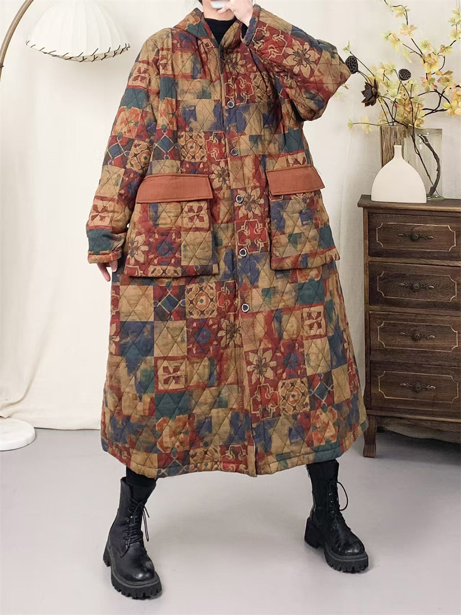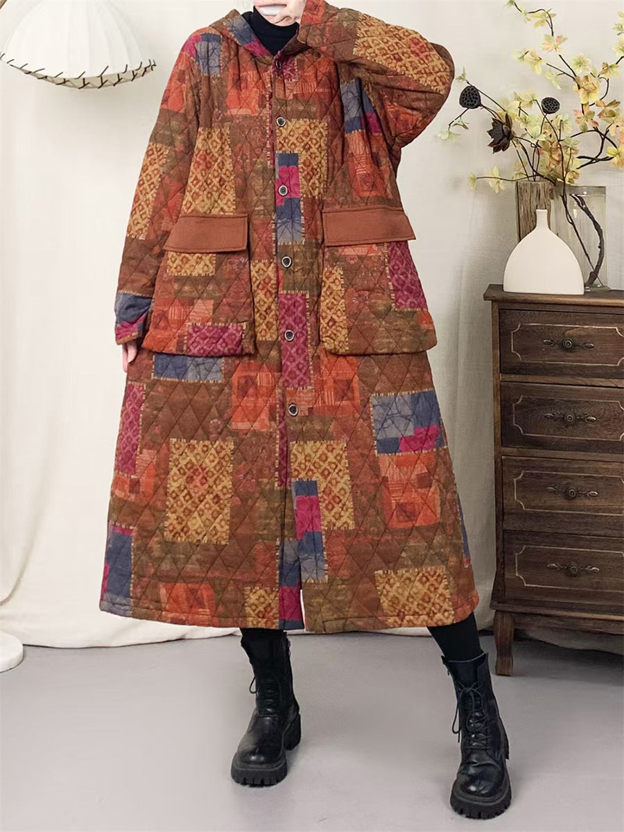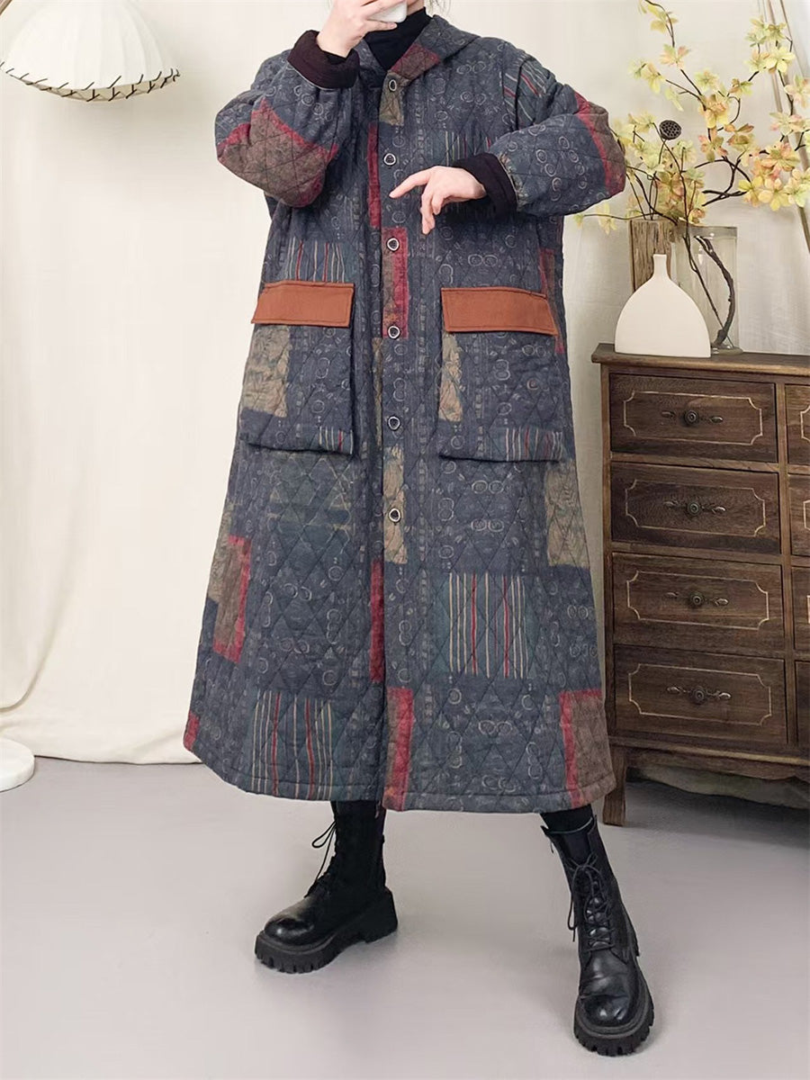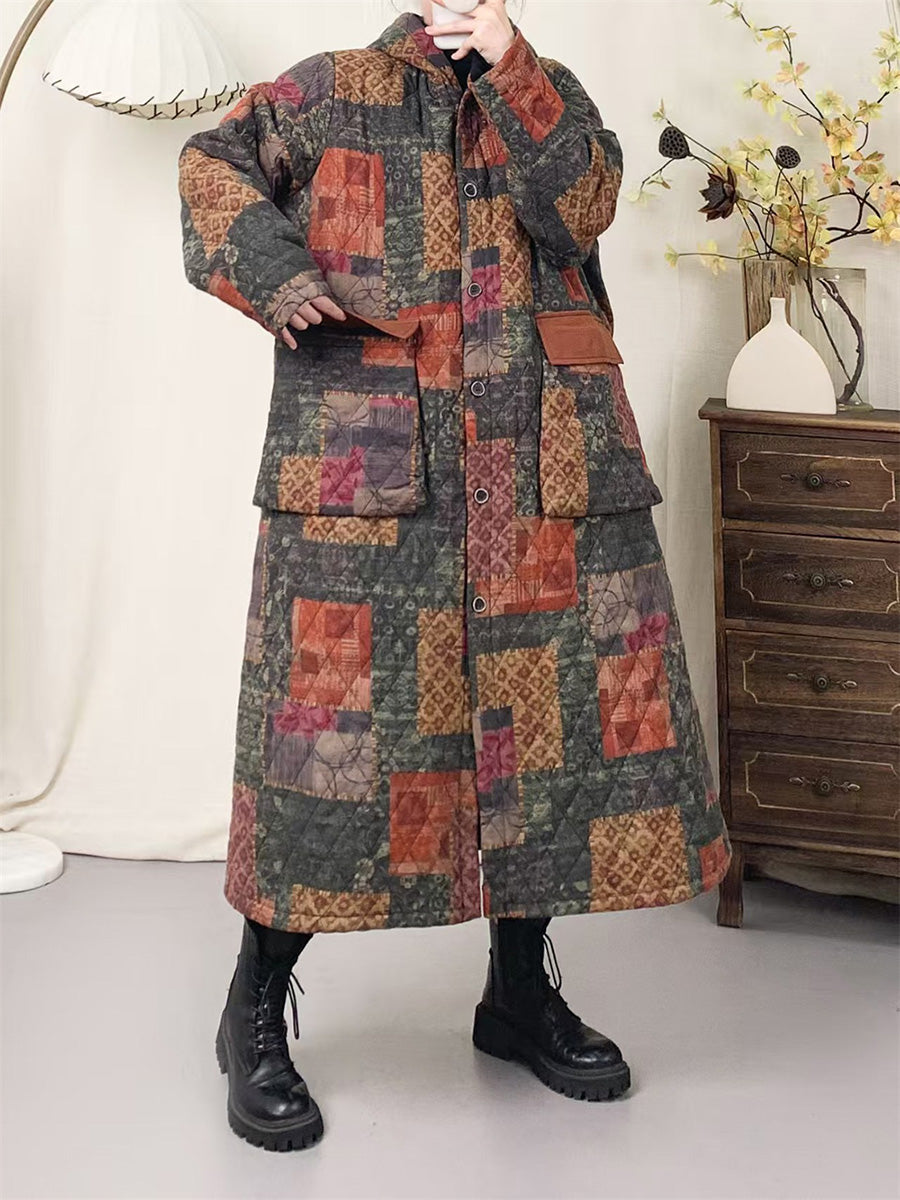 Dámský zimní umělecký patchworkový prošívaný bavlněný kabát s kapucí