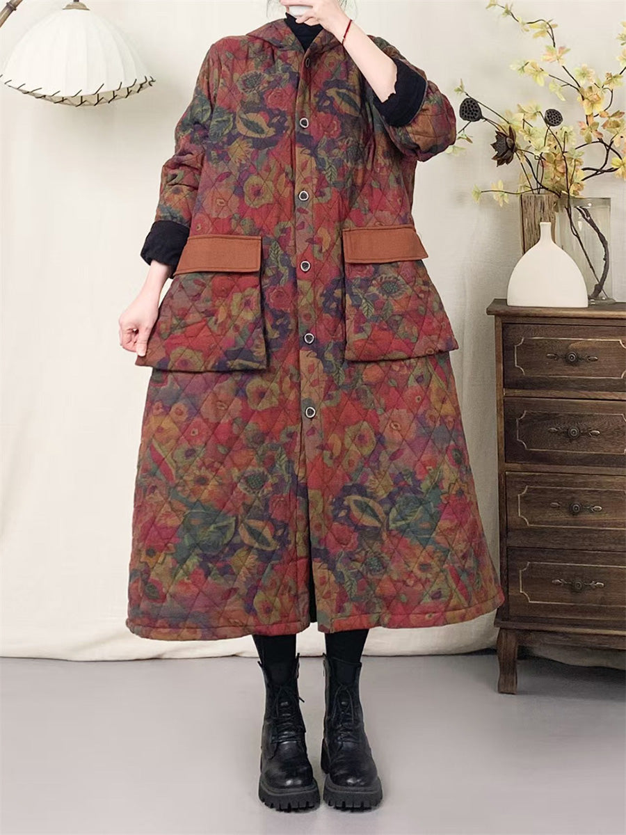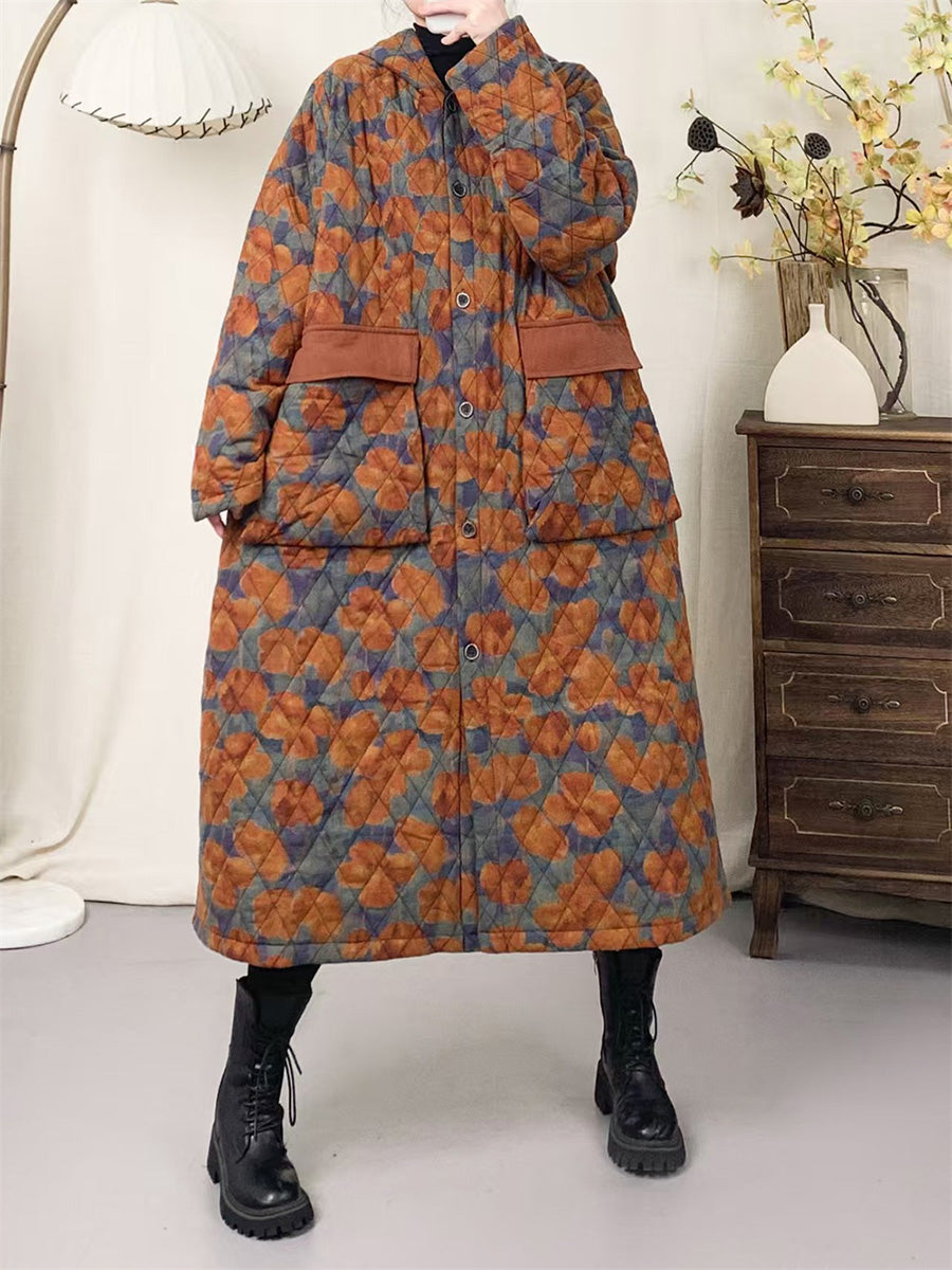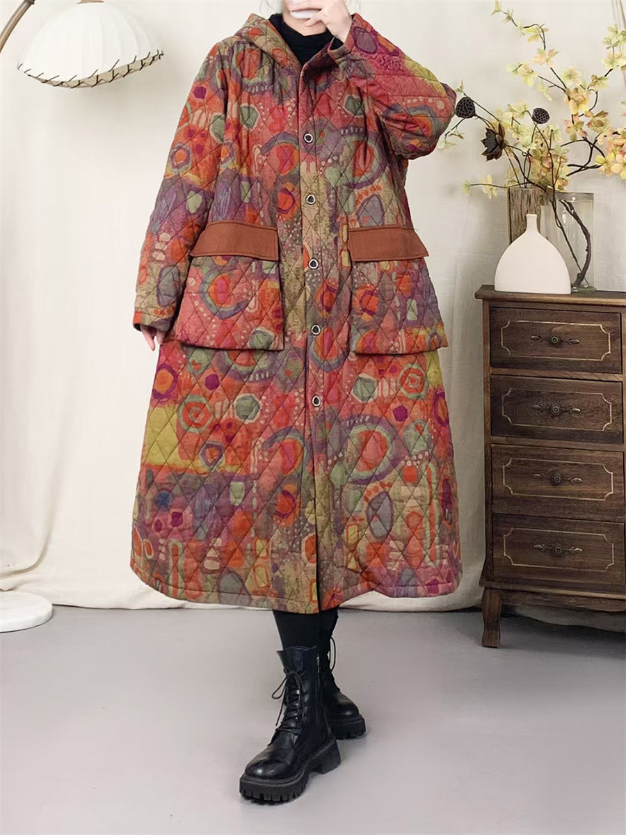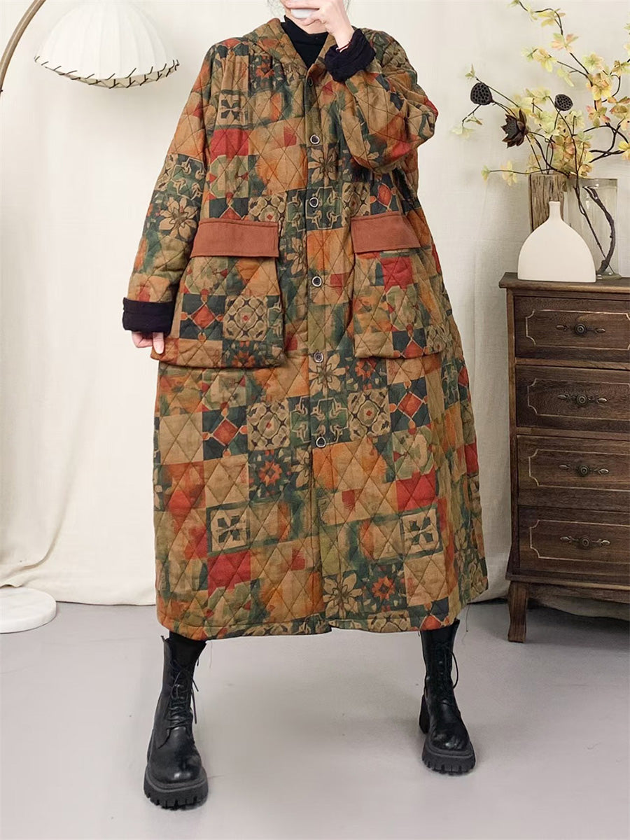 Dámský zimní umělecký patchworkový prošívaný bavlněný kabát s kapucí