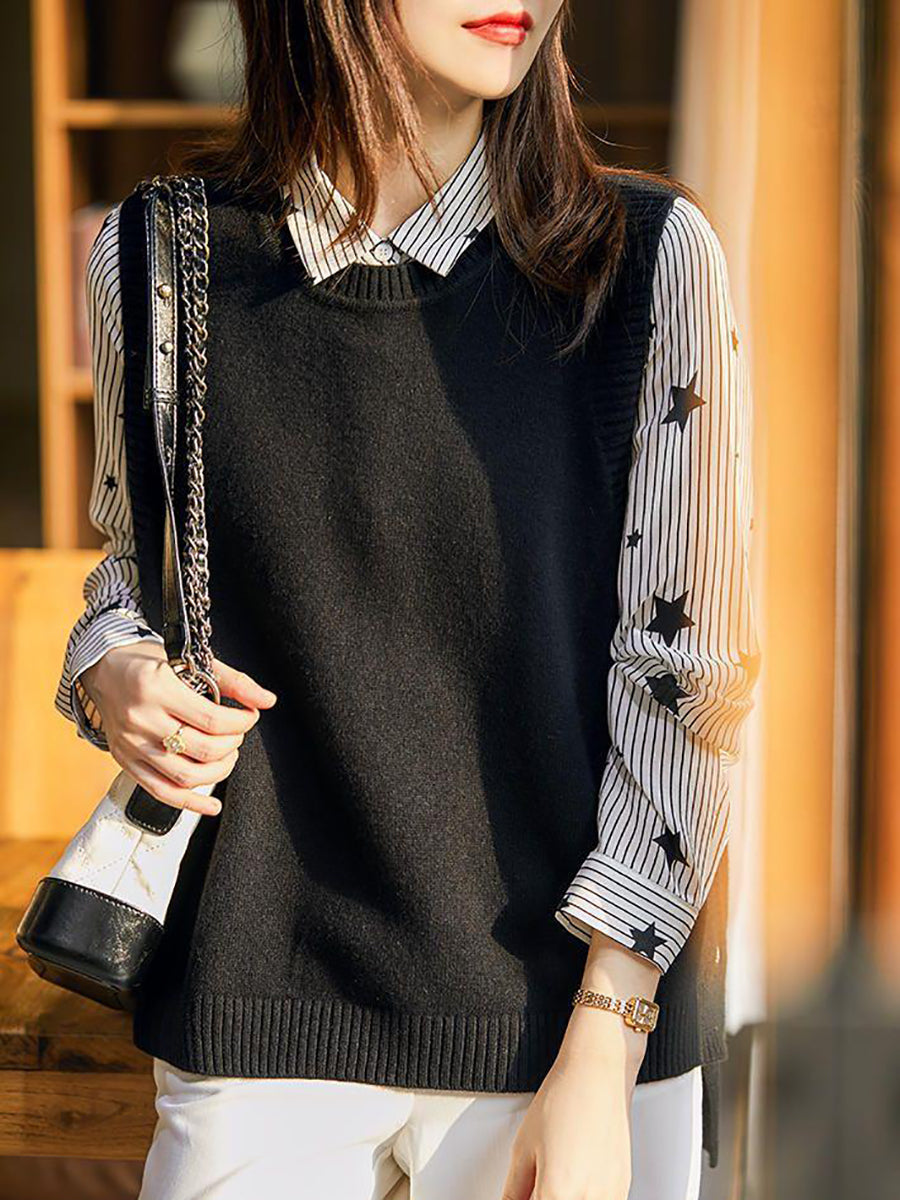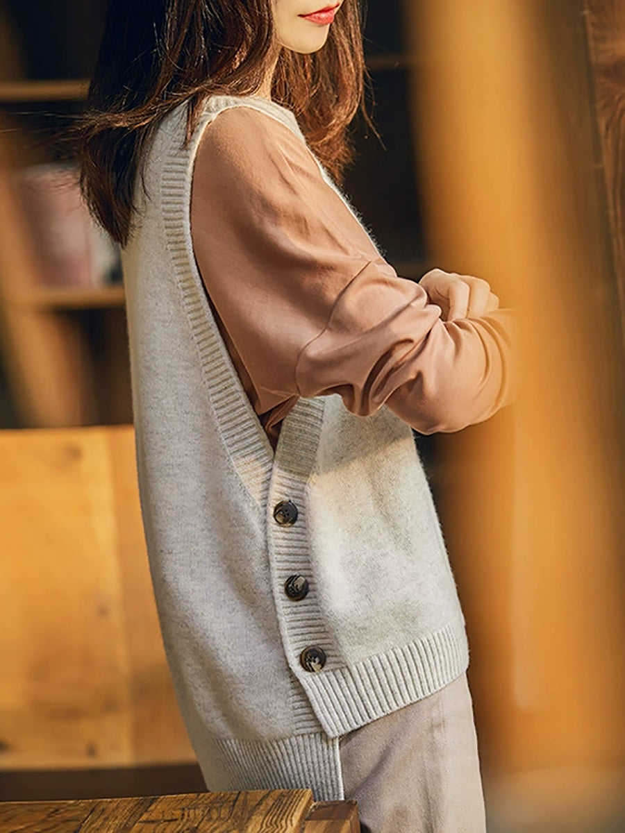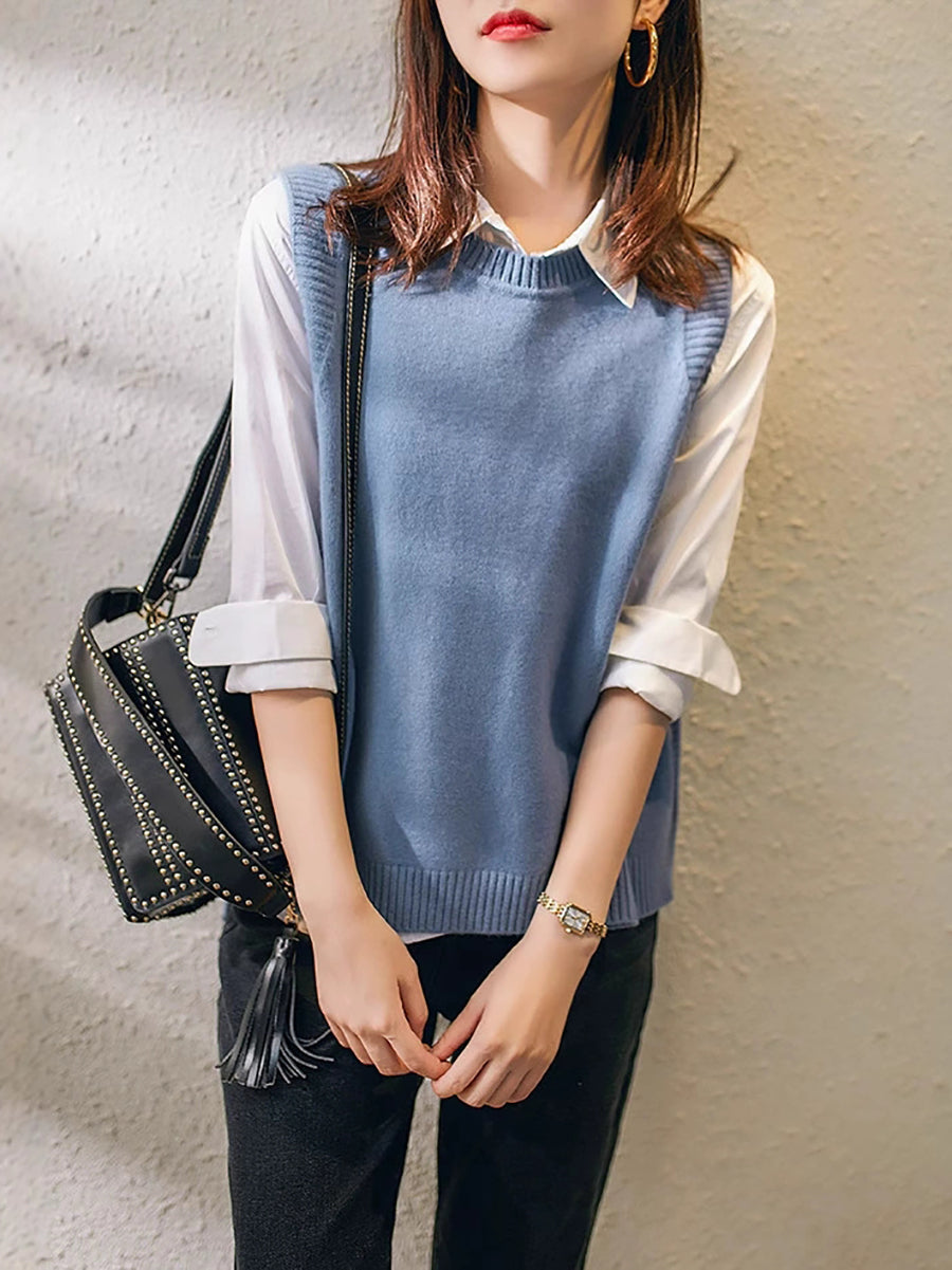 Dámská podzimní umělecká pletená vesta s čistými barvami a výstřihem do O-neck