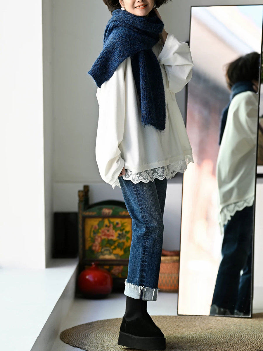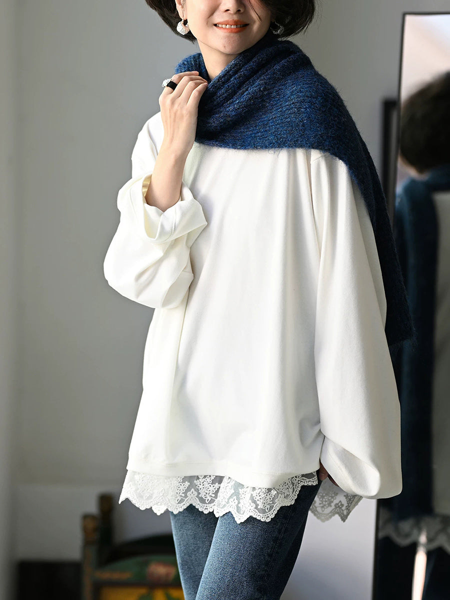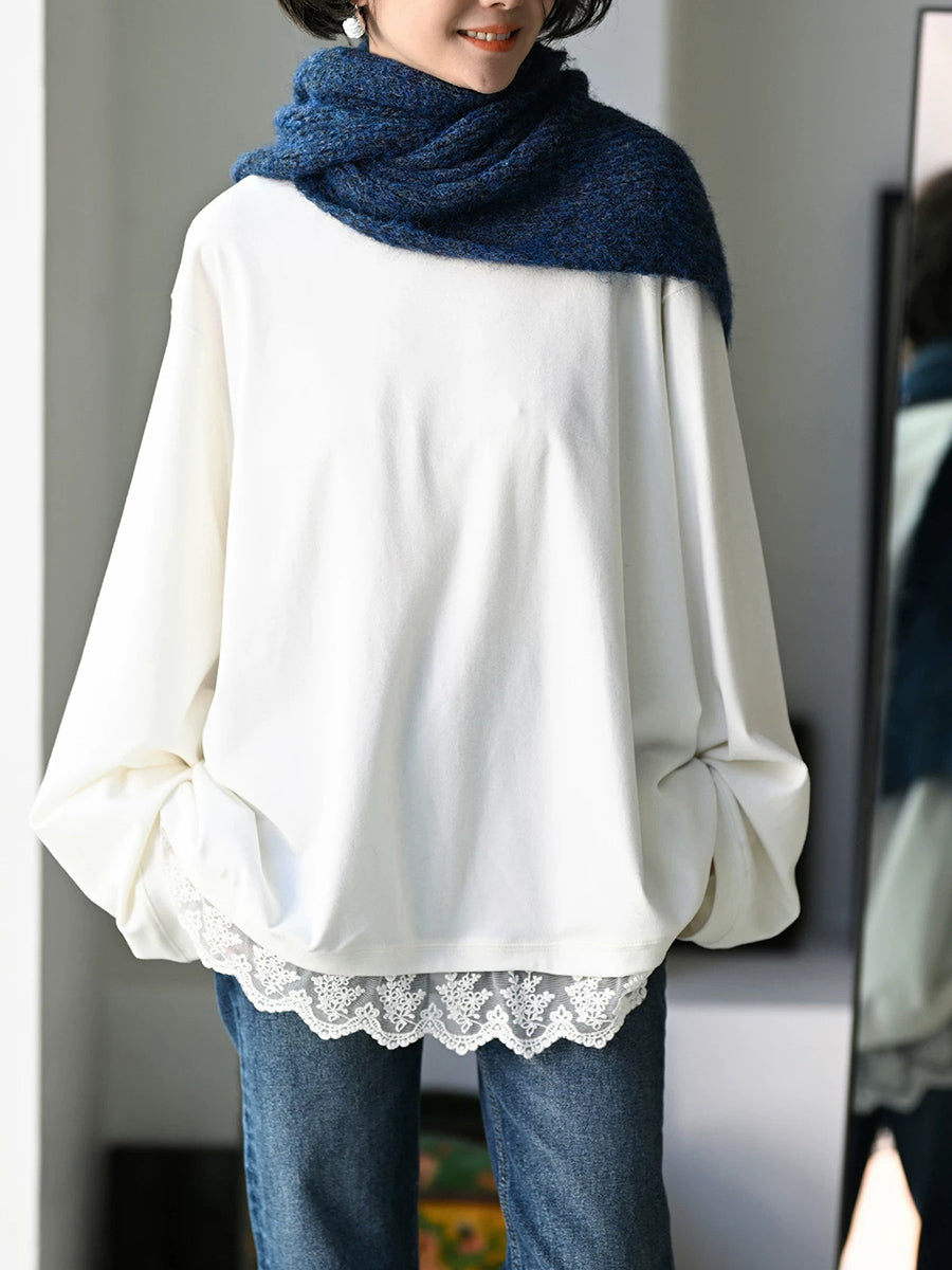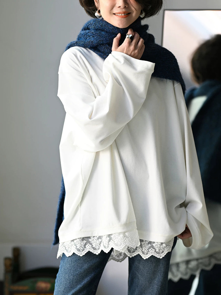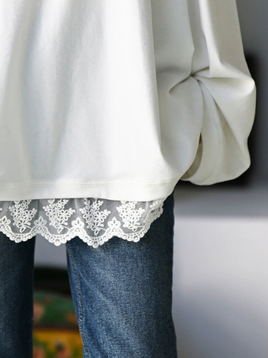 Dámská umělecká podzimní halenka s krajkovým lemem a výstřihem do O-neck ze 100% bavlny