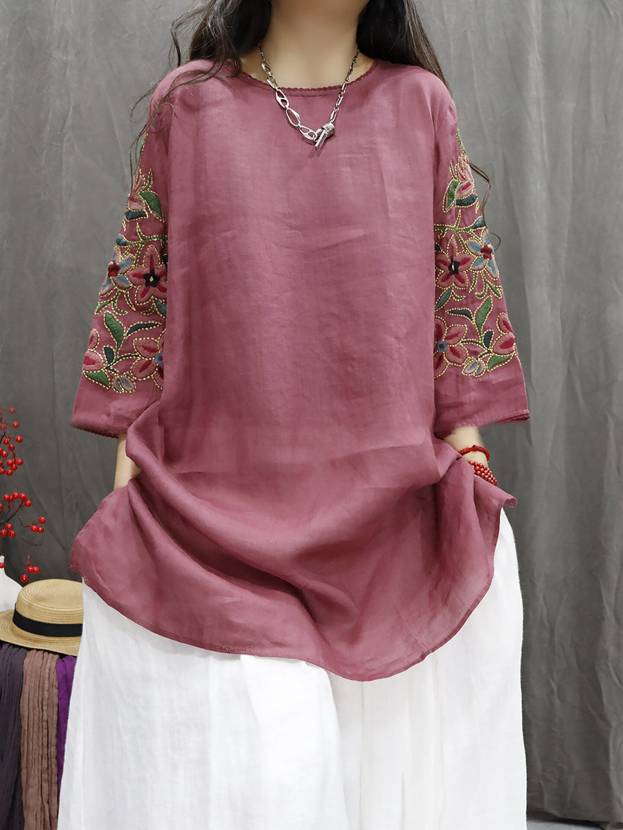 Dámská umělecká výšivka s květinovým výstřihem do O-krku, 100% ramie halenka