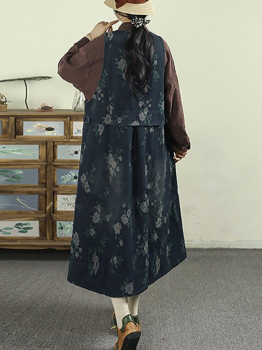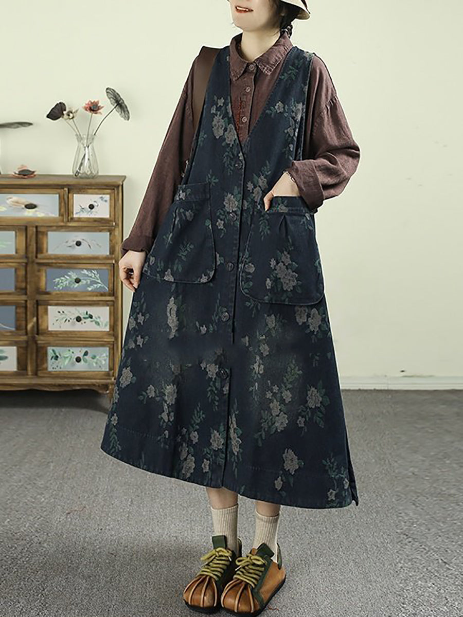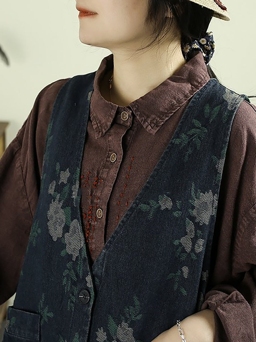 Dámské jarní retro květinové džínové vesty s výstřihem do V