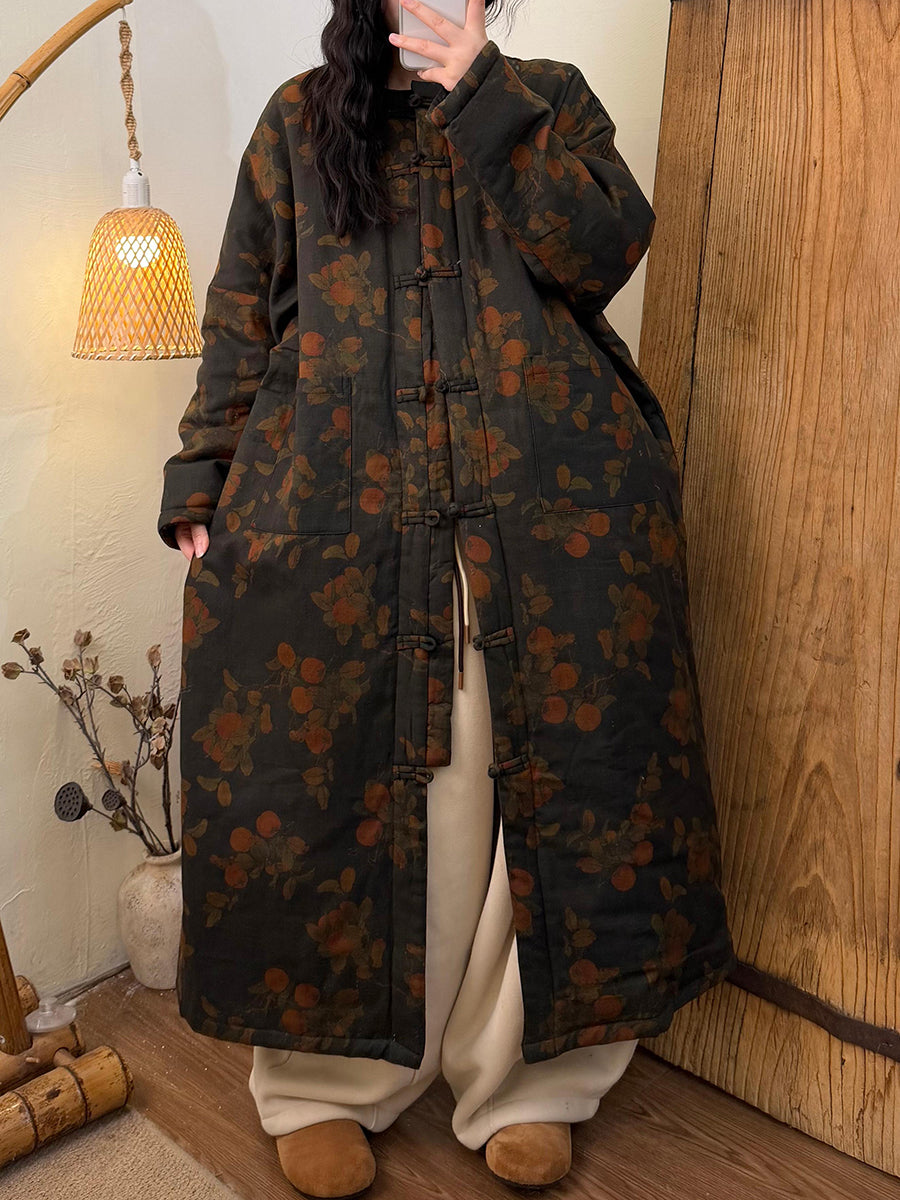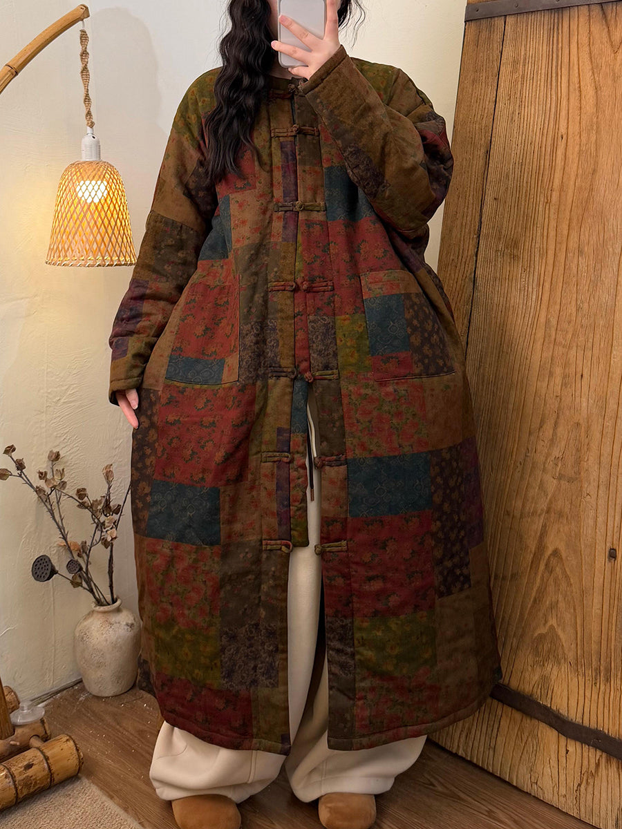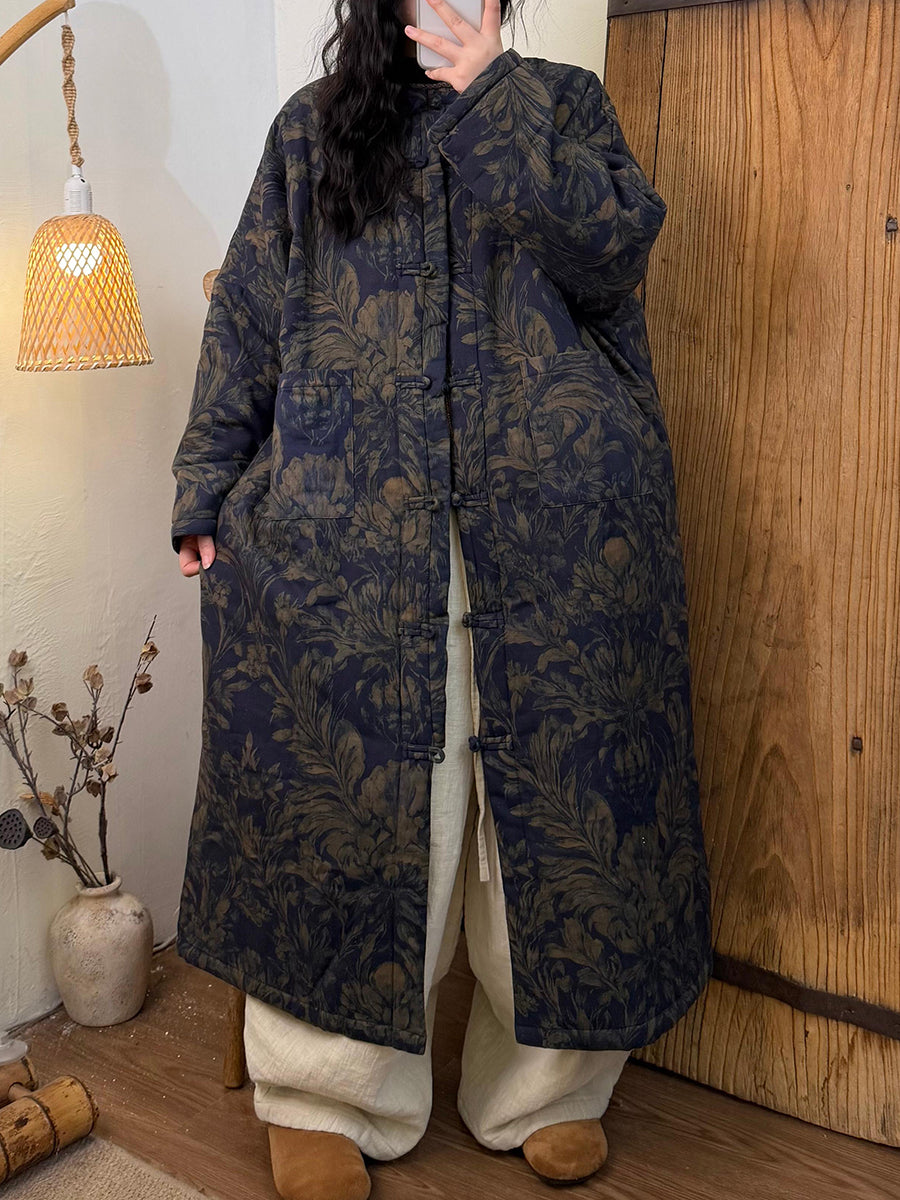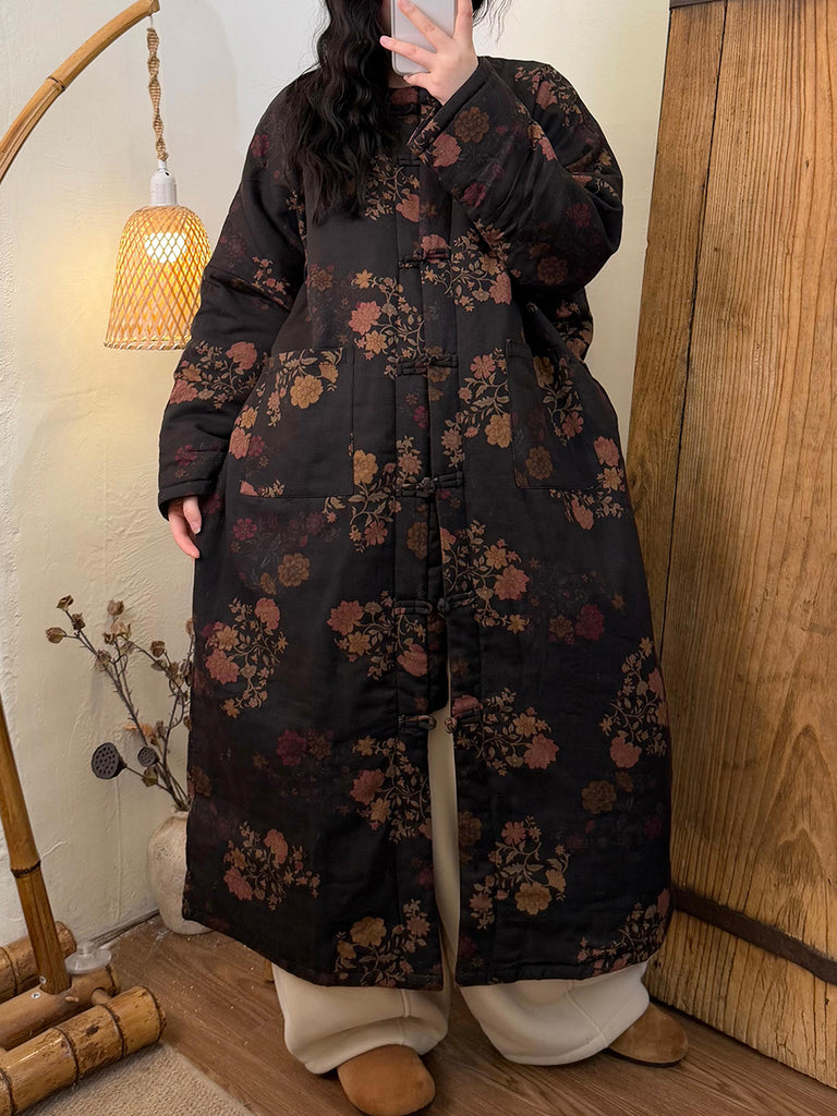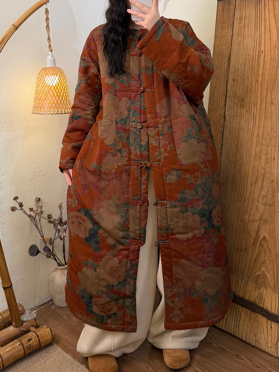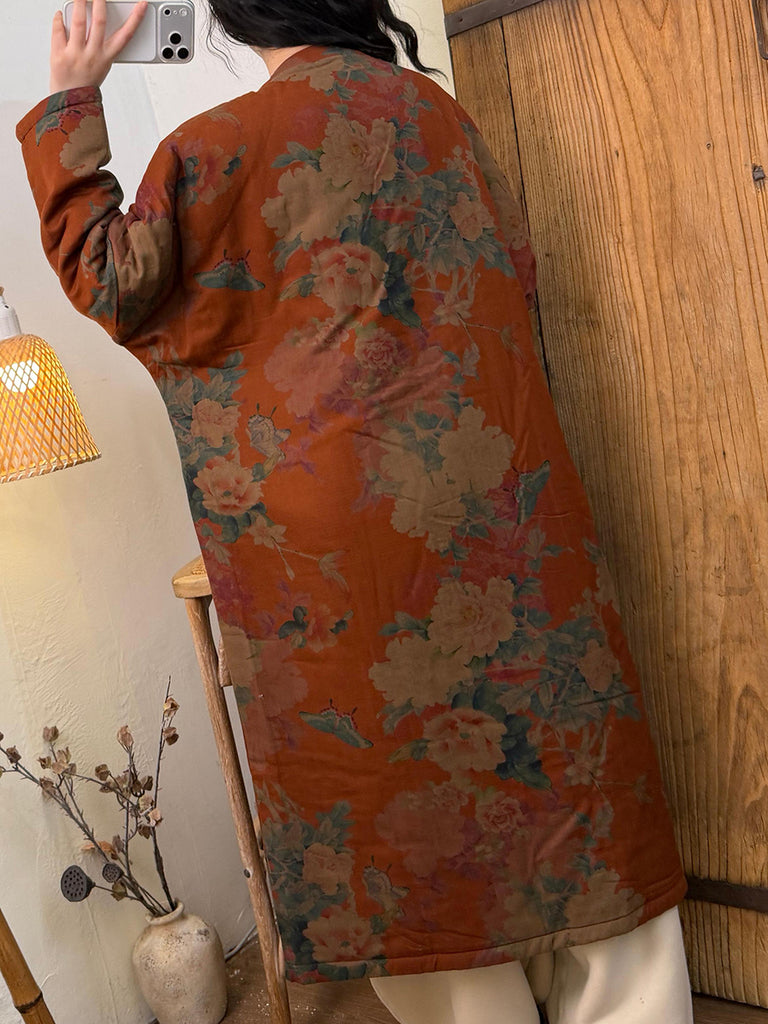 Dámský zimní retro květinový prošívaný dlouhý kabát s výstřihem do O-neck