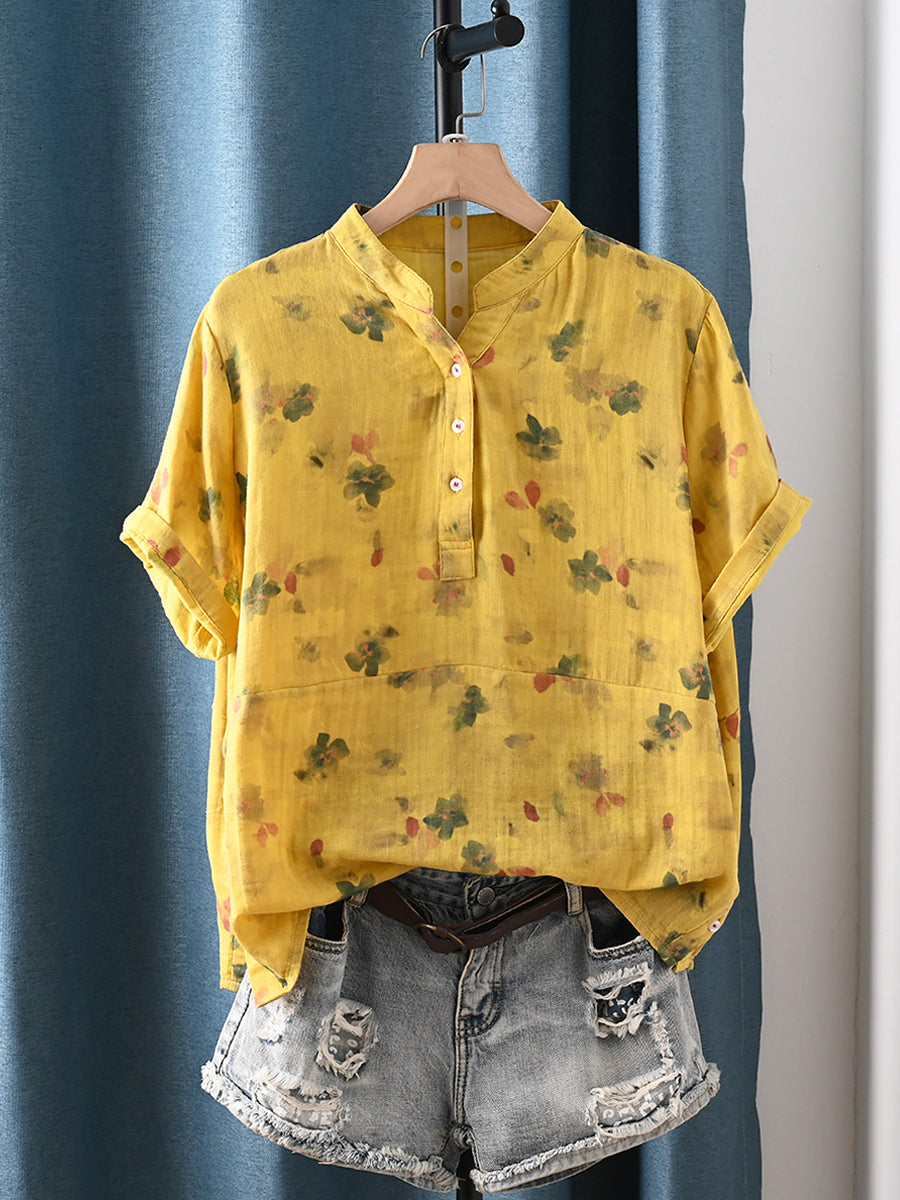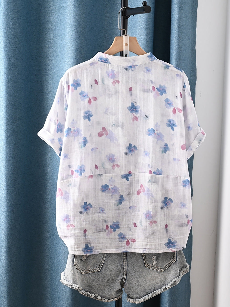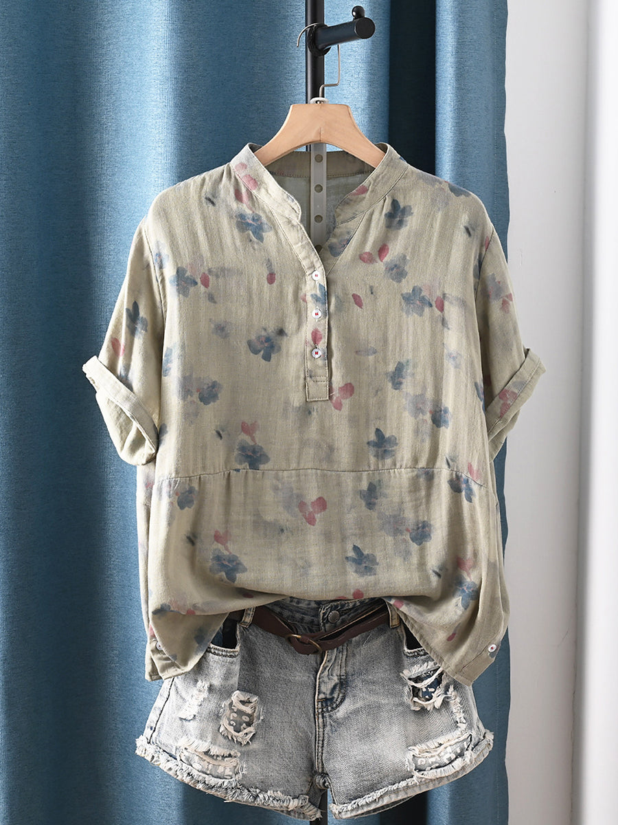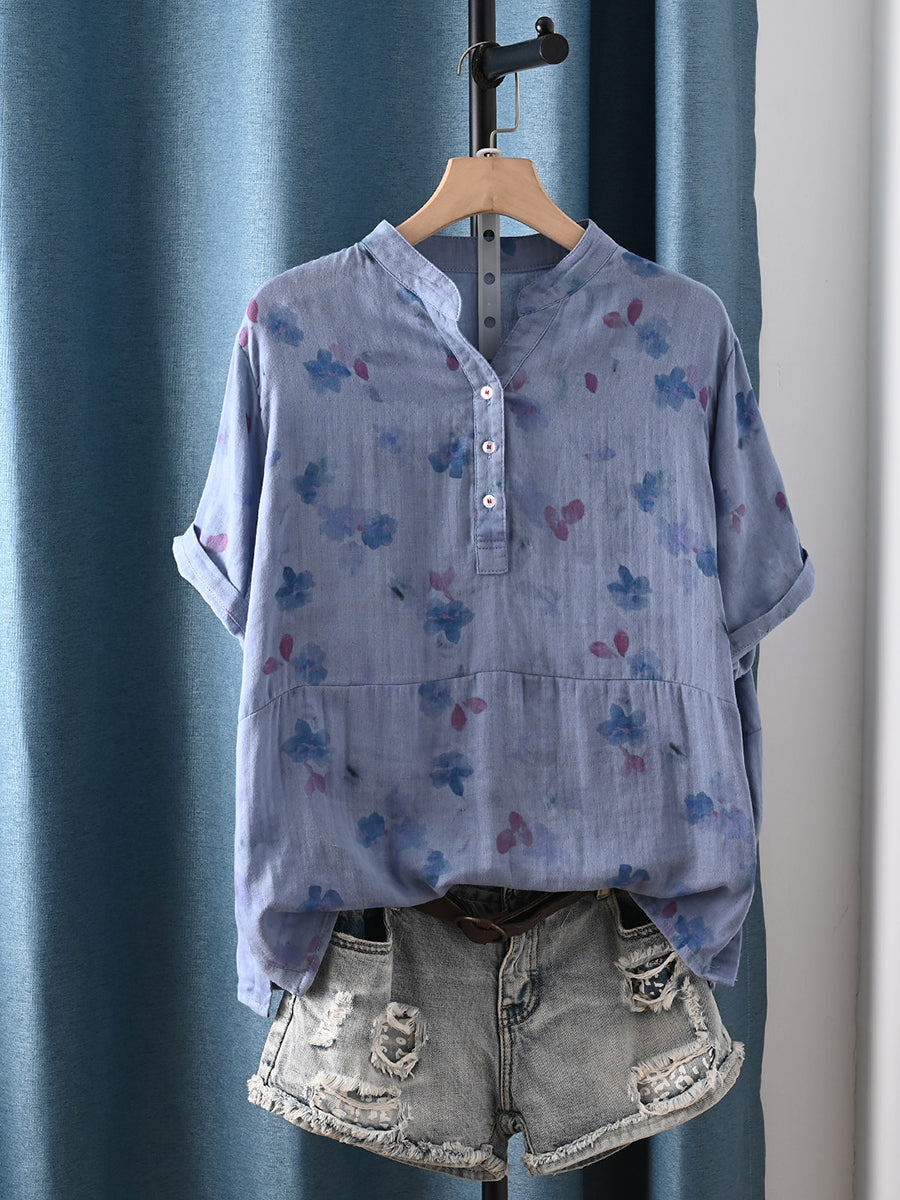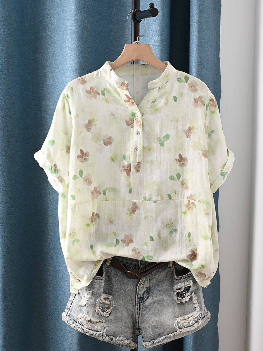 Dámská letní umělecká květinová halenka s výstřihem do V ze 100% bavlny