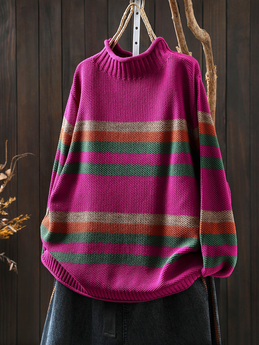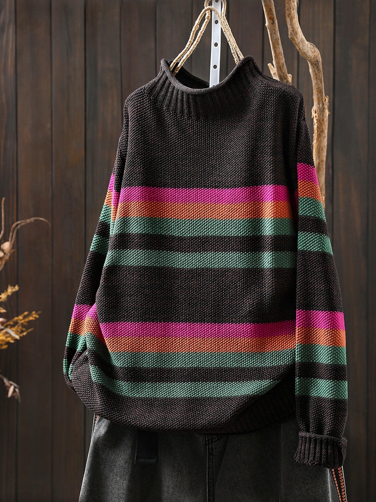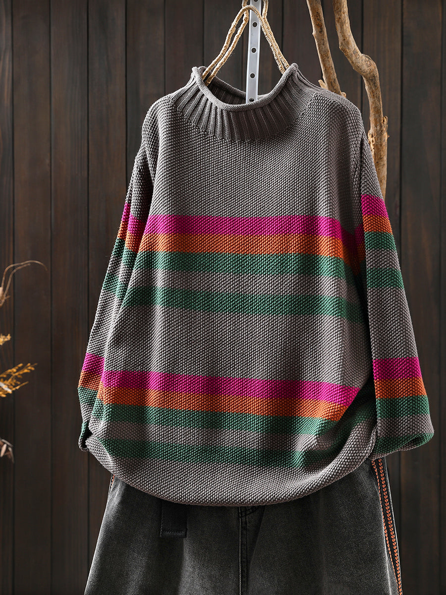 Dámský podzimní umělecký pruhovaný svetr s půlrolátkem