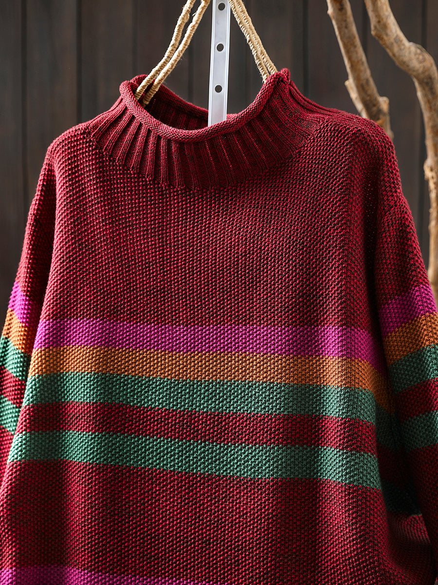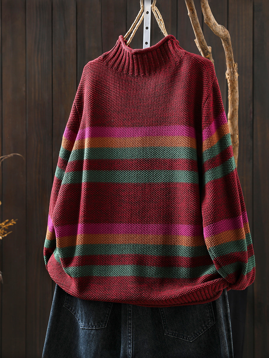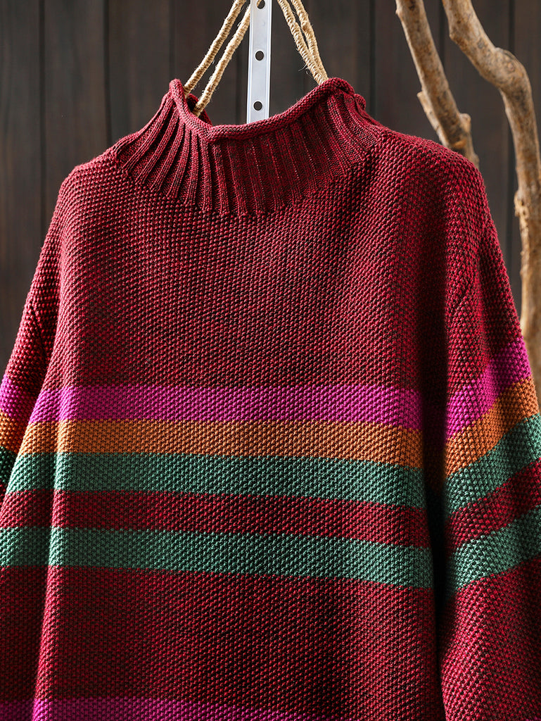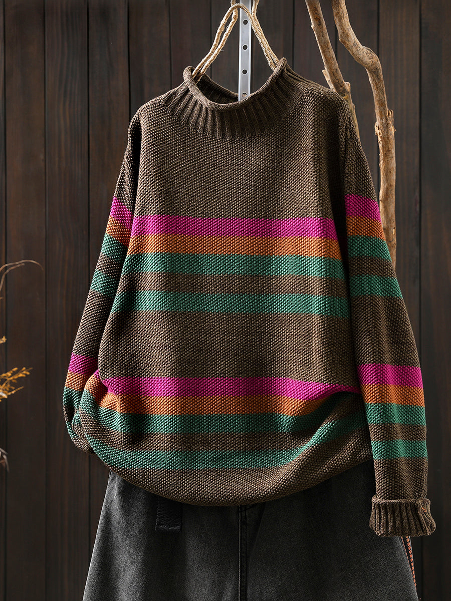 Dámský podzimní umělecký pruhovaný svetr s půlrolátkem