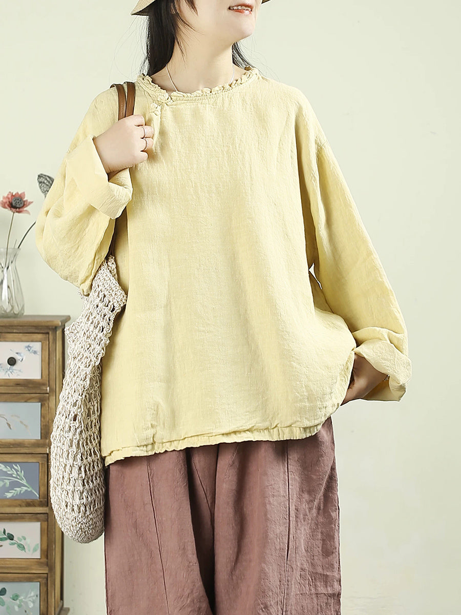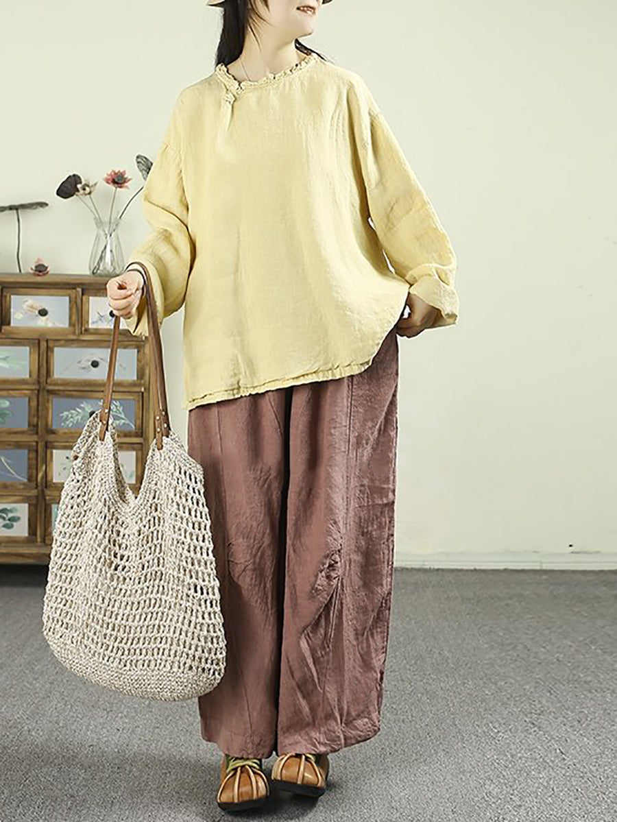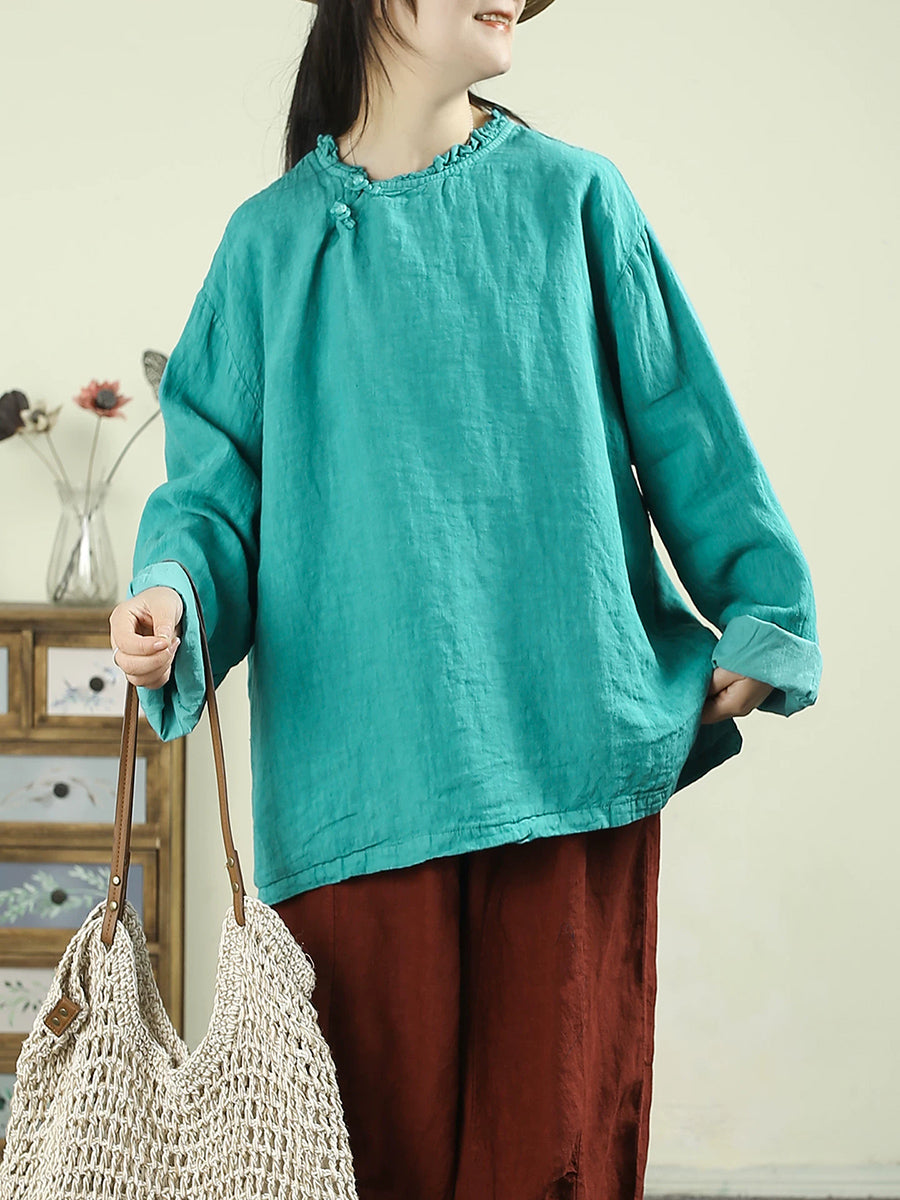 Dámská jarní etnická čistě barevná halenka s výstřihem do O-neck, 100% lněný vzor