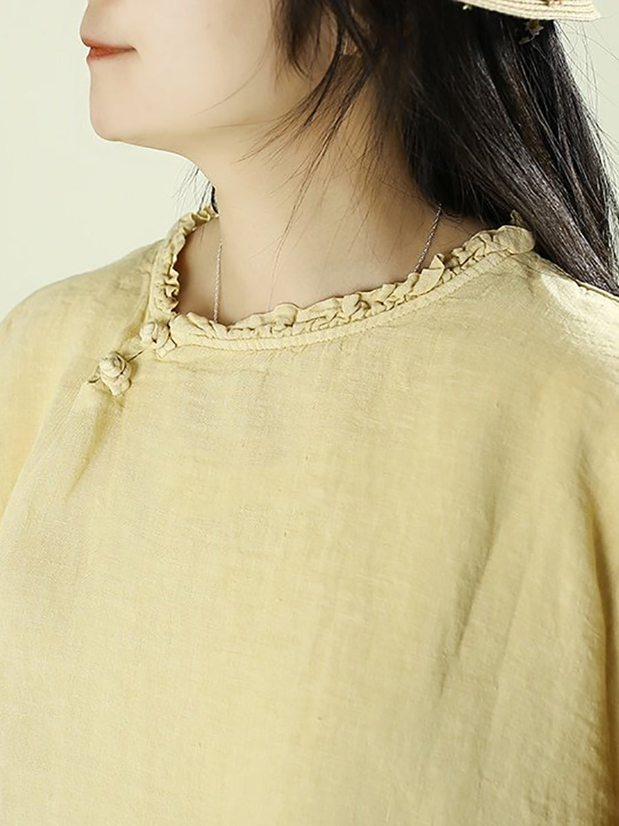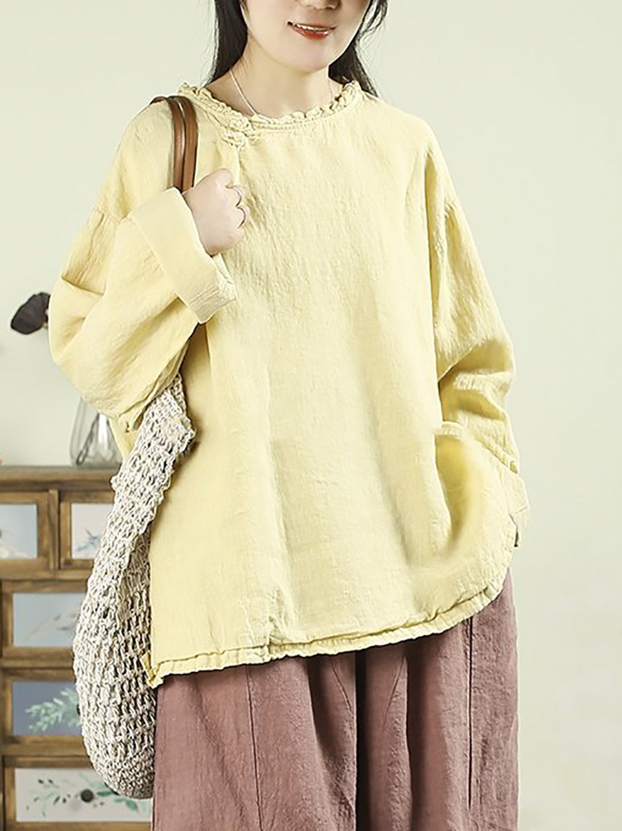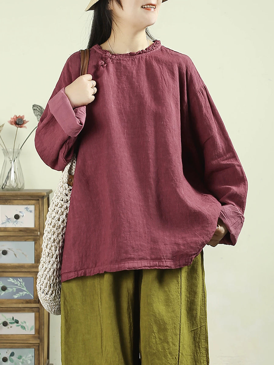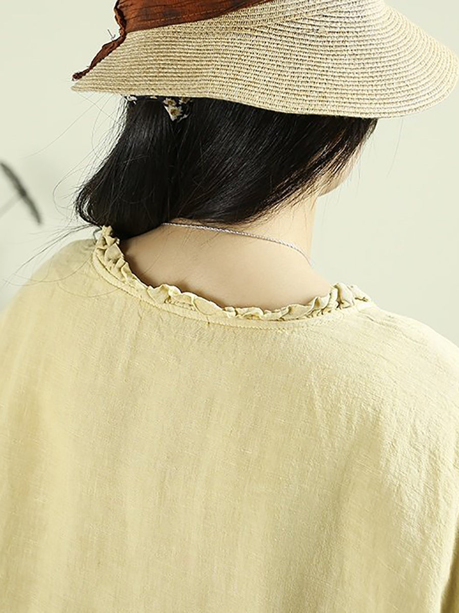 Dámská jarní etnická čistě barevná halenka s výstřihem do O-neck, 100% lněný vzor
