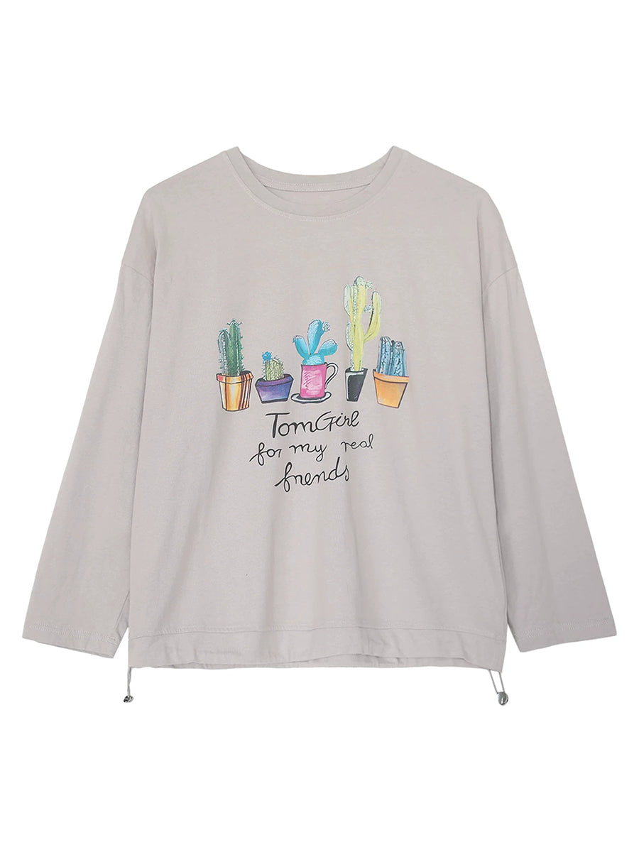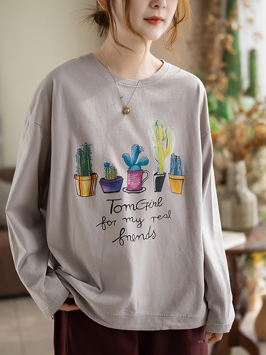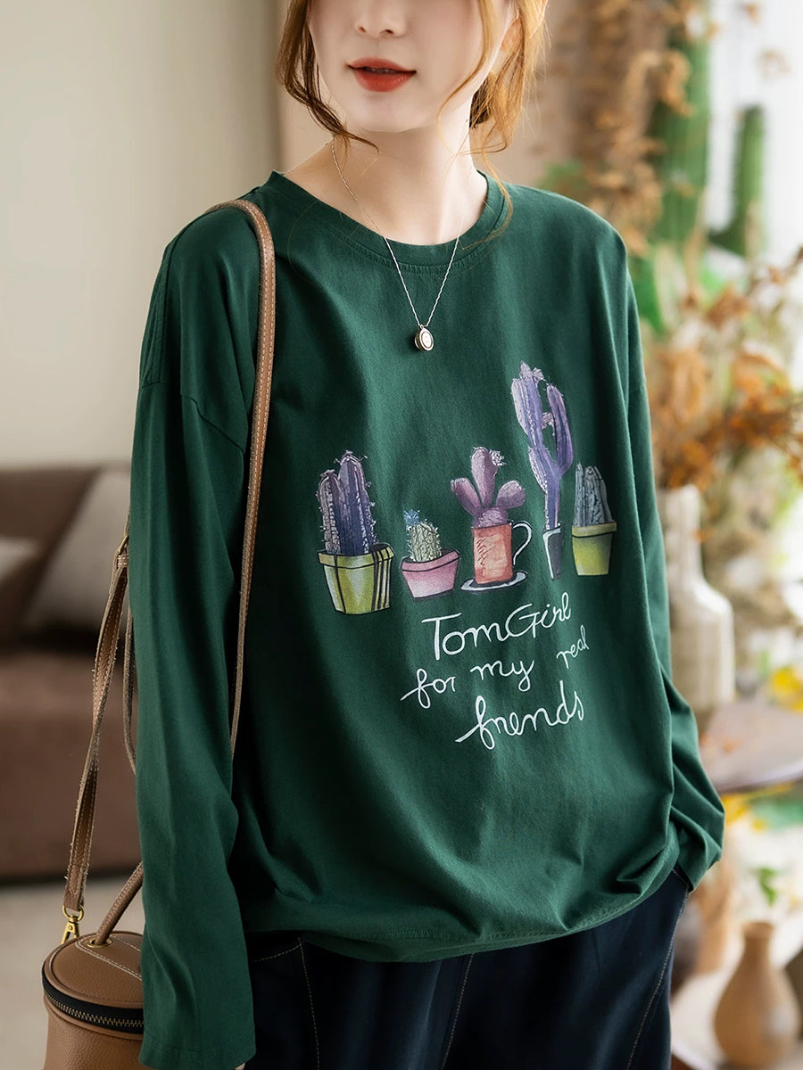 Dámská jarní bavlněná halenka s výstřihem do O-neck s uměleckými rostlinami