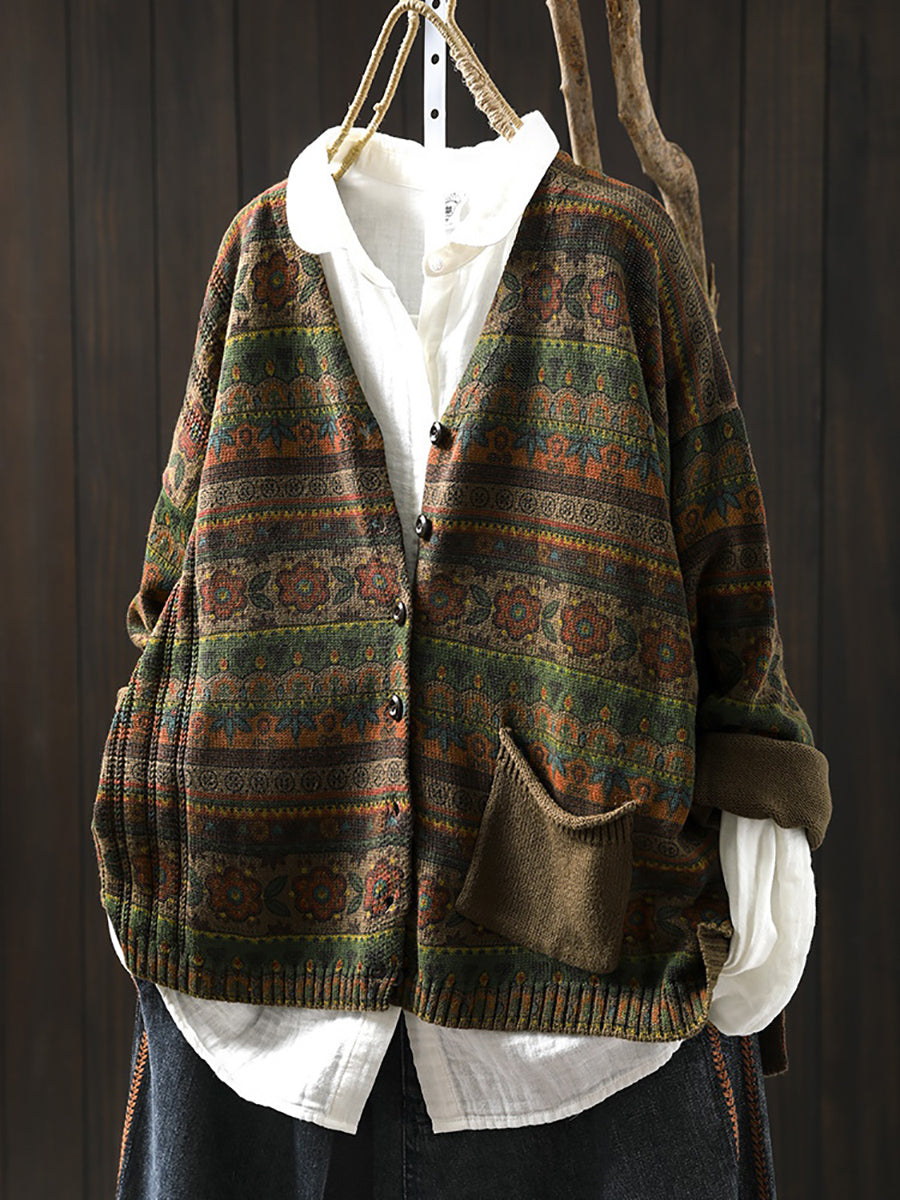 Dámský podzimní retro pletený svetr s květinovým proužkem a výstřihem do V