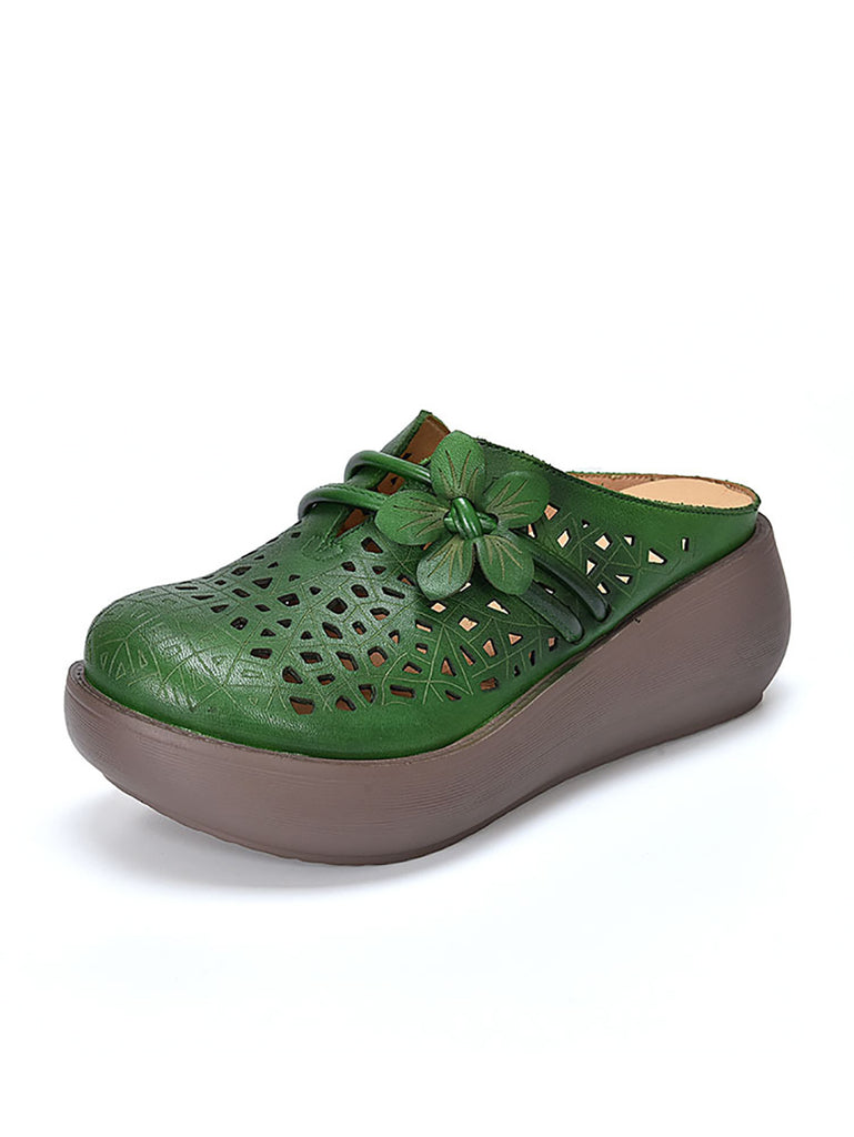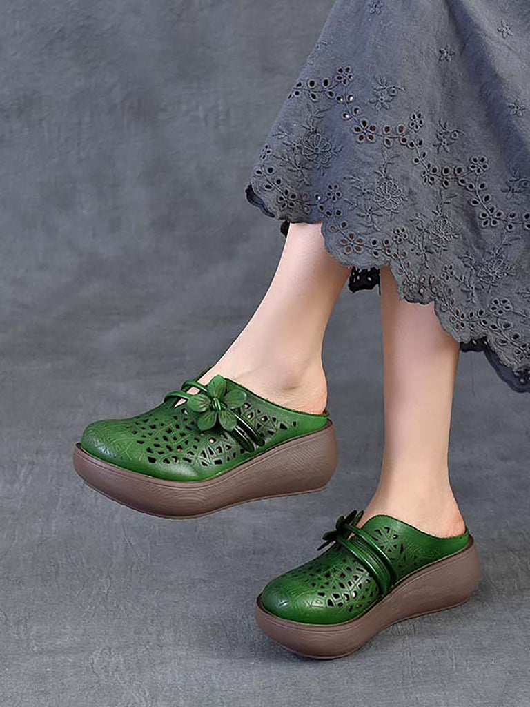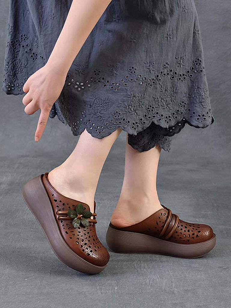 Dámské etnické kožené pantofle s květinovým vzorem na platformě