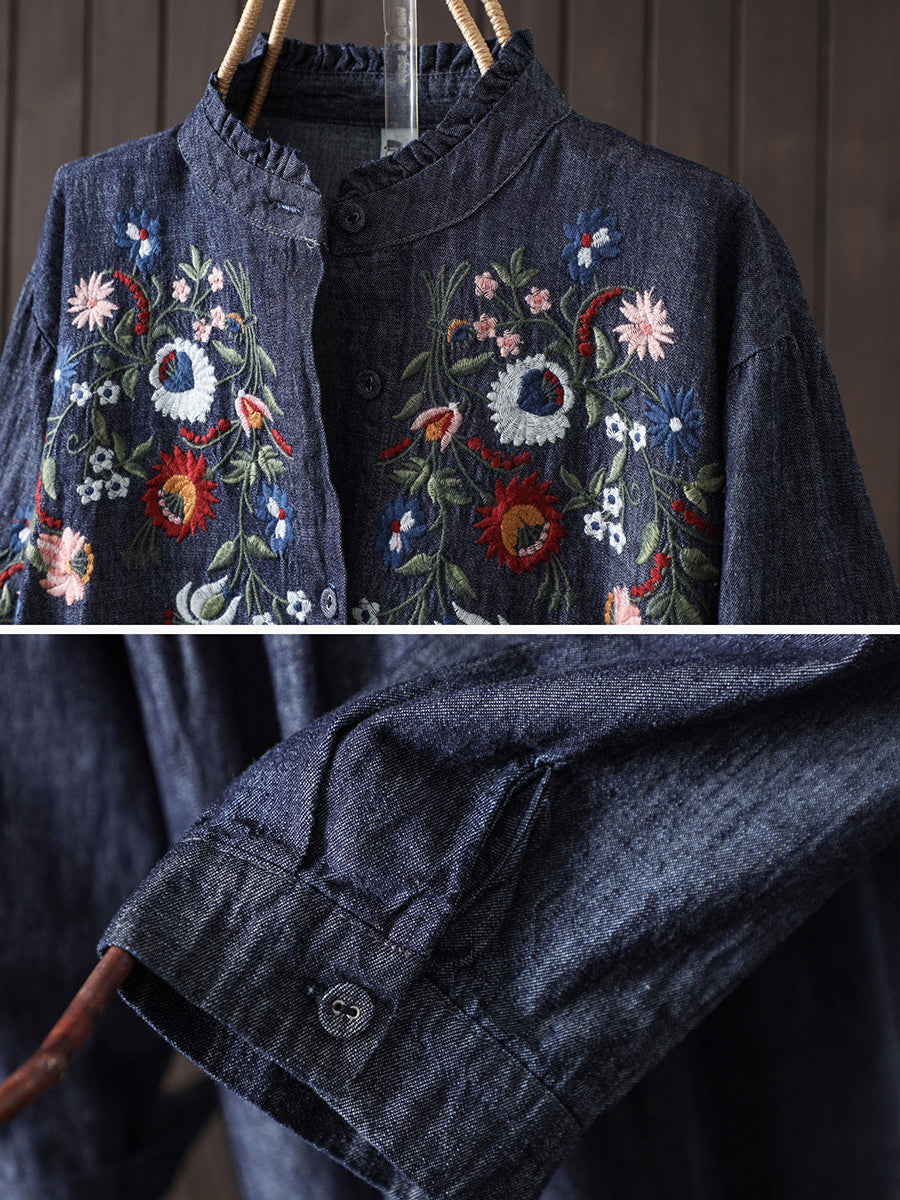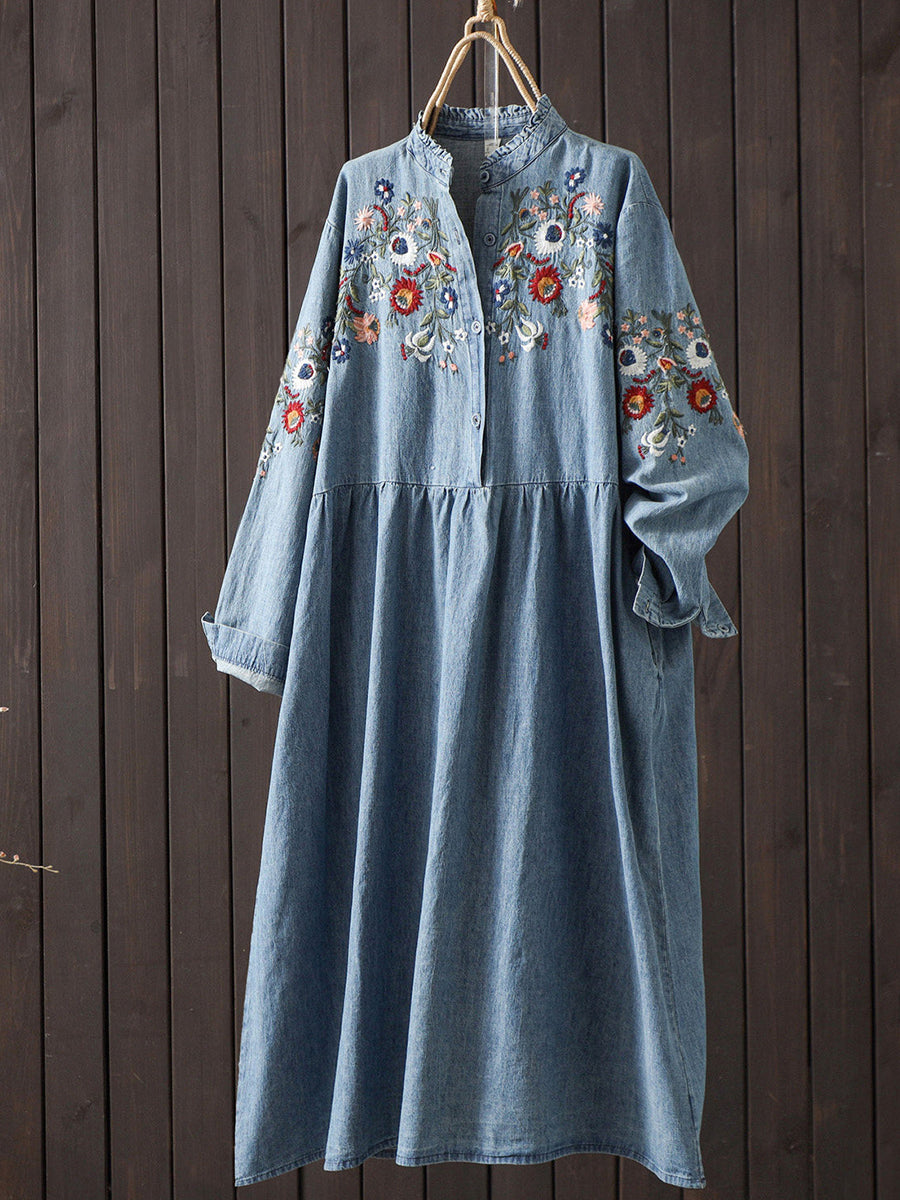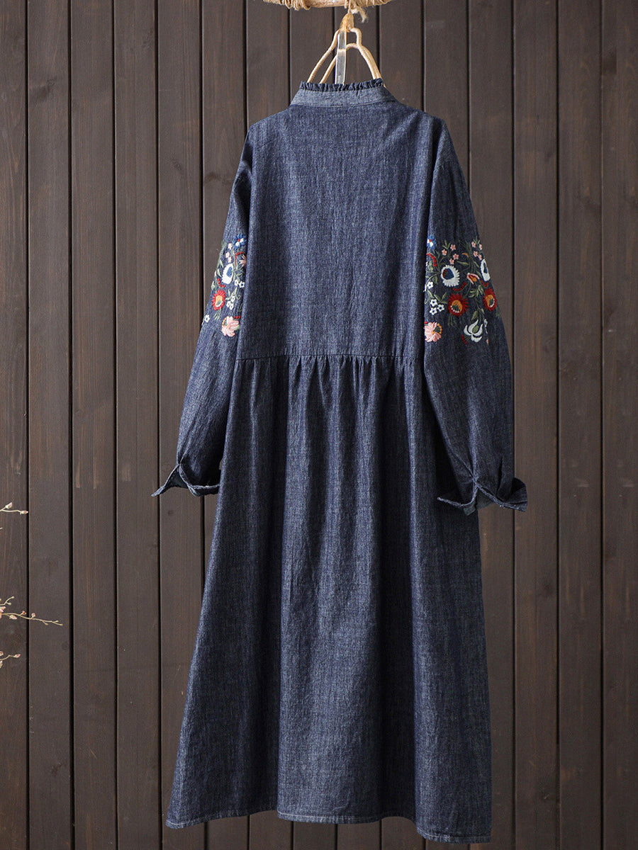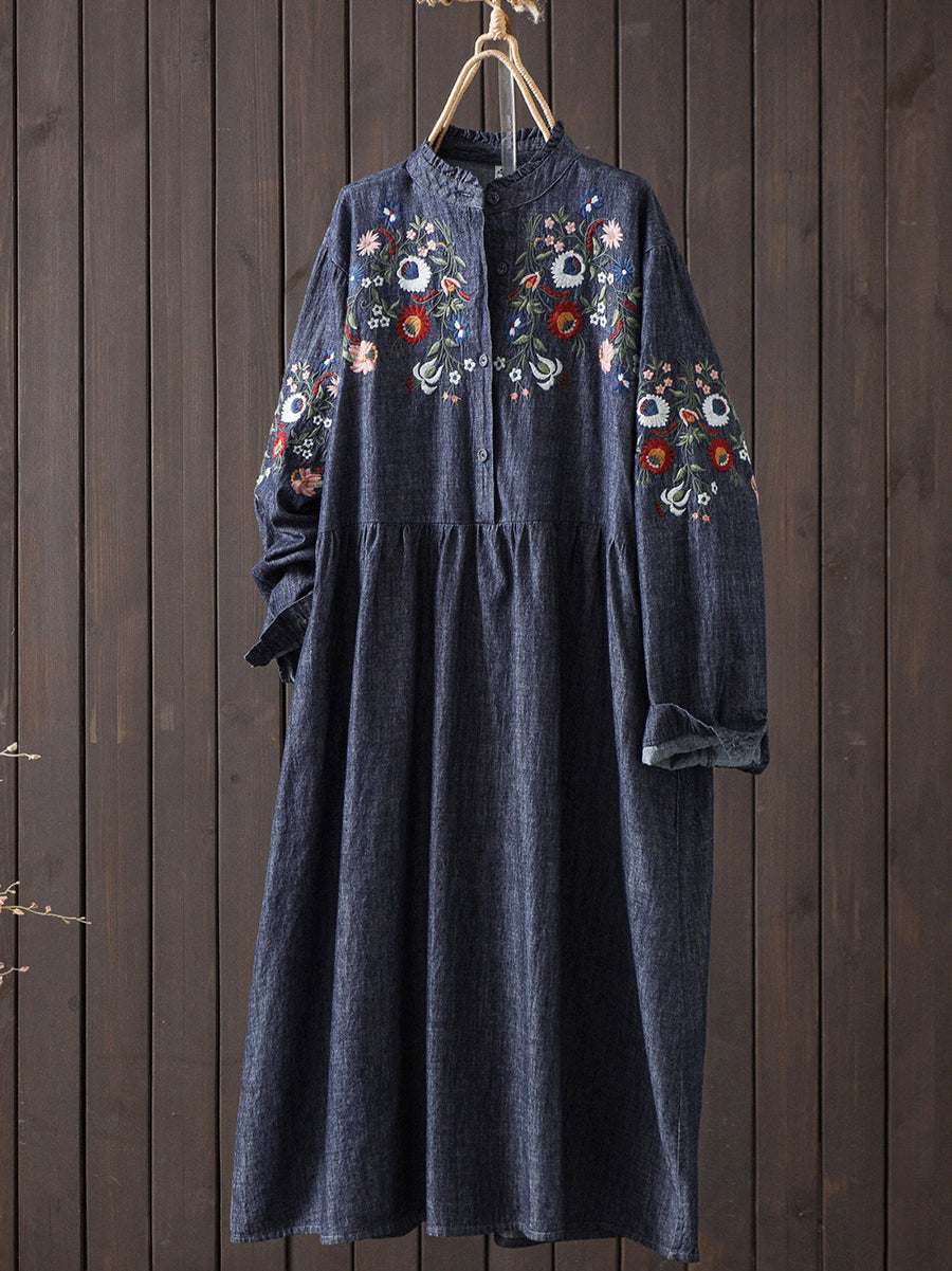 Dámské jarní umělecké výšivkové džínové šaty se stojáčkem
