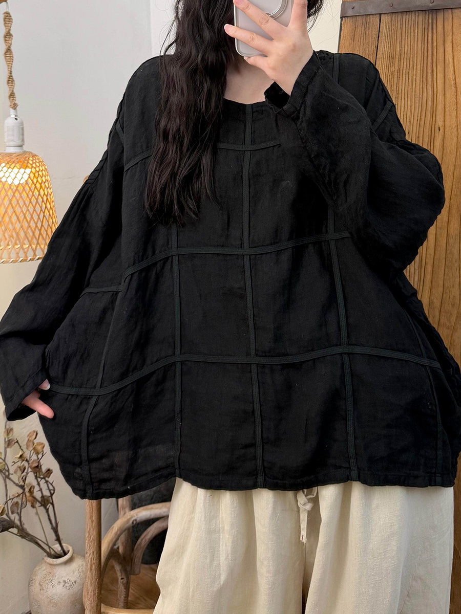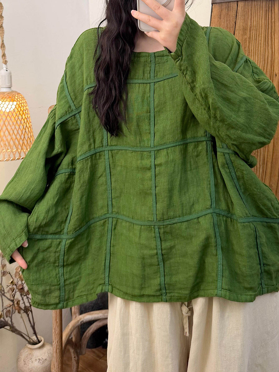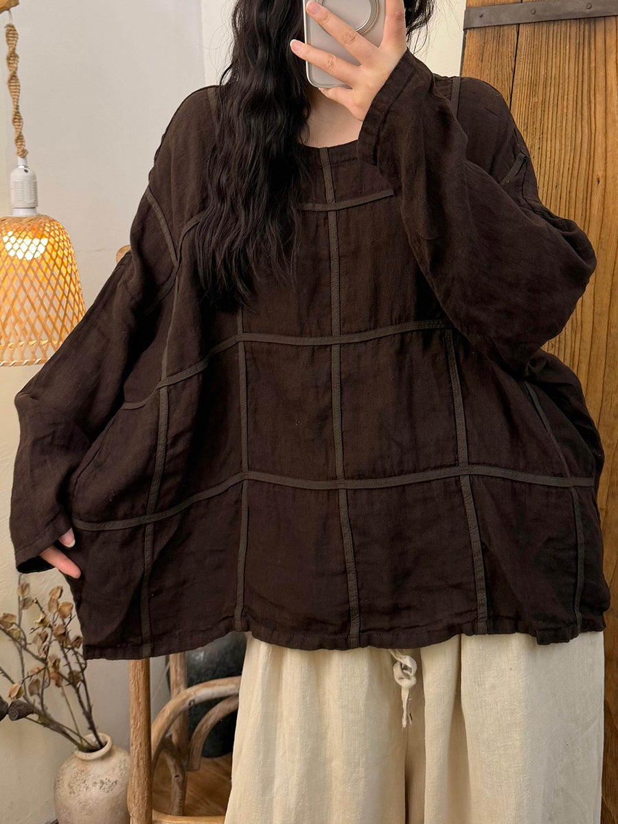 Dámská jarní vintage kostkovaná lněná košile s výstřihem do O-neck