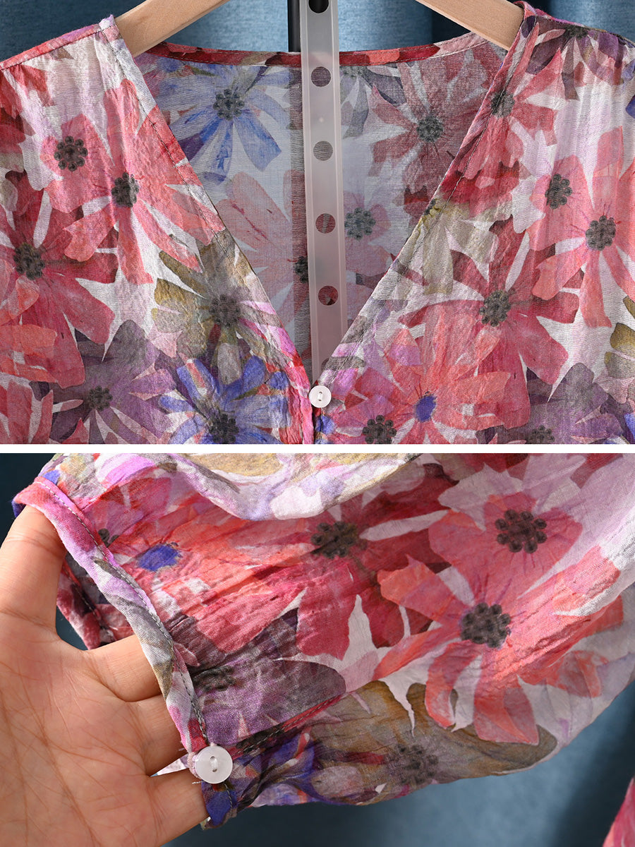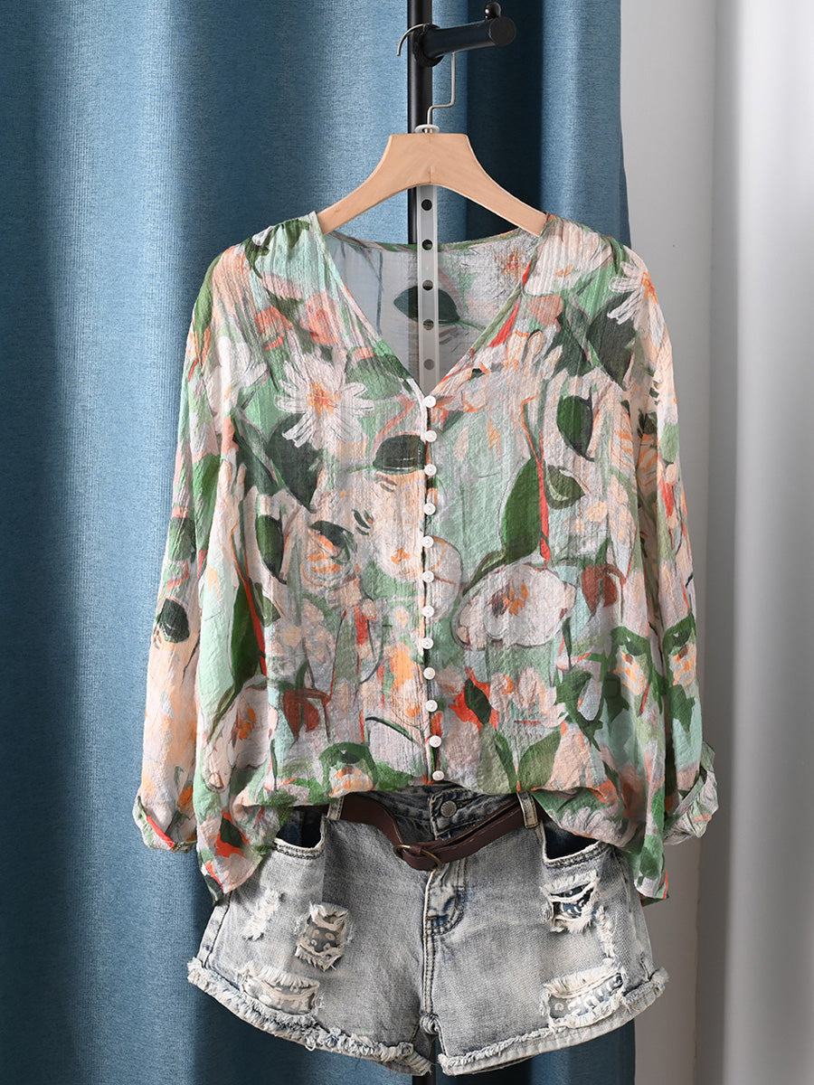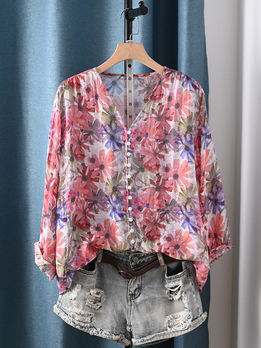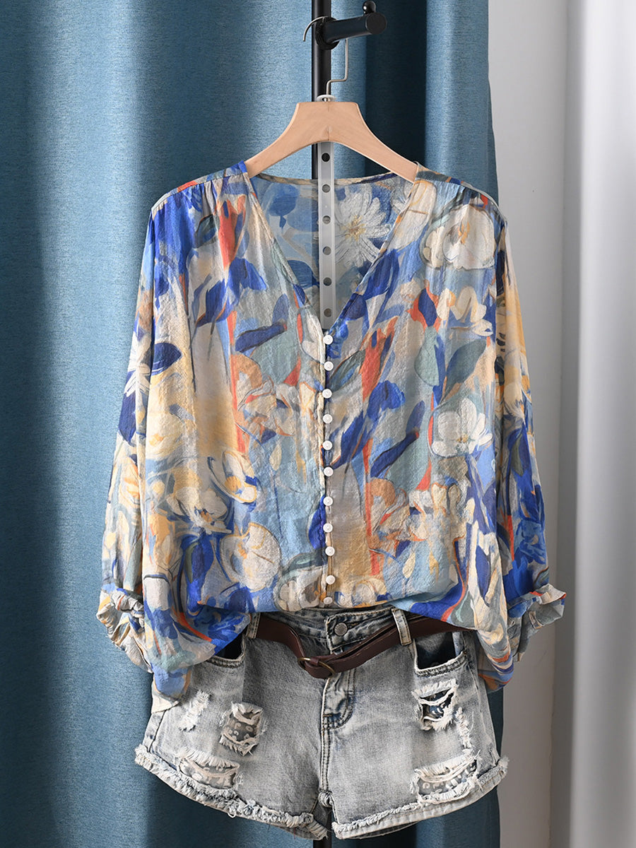 Dámské letní umělecké květinové tričko s výstřihem do V