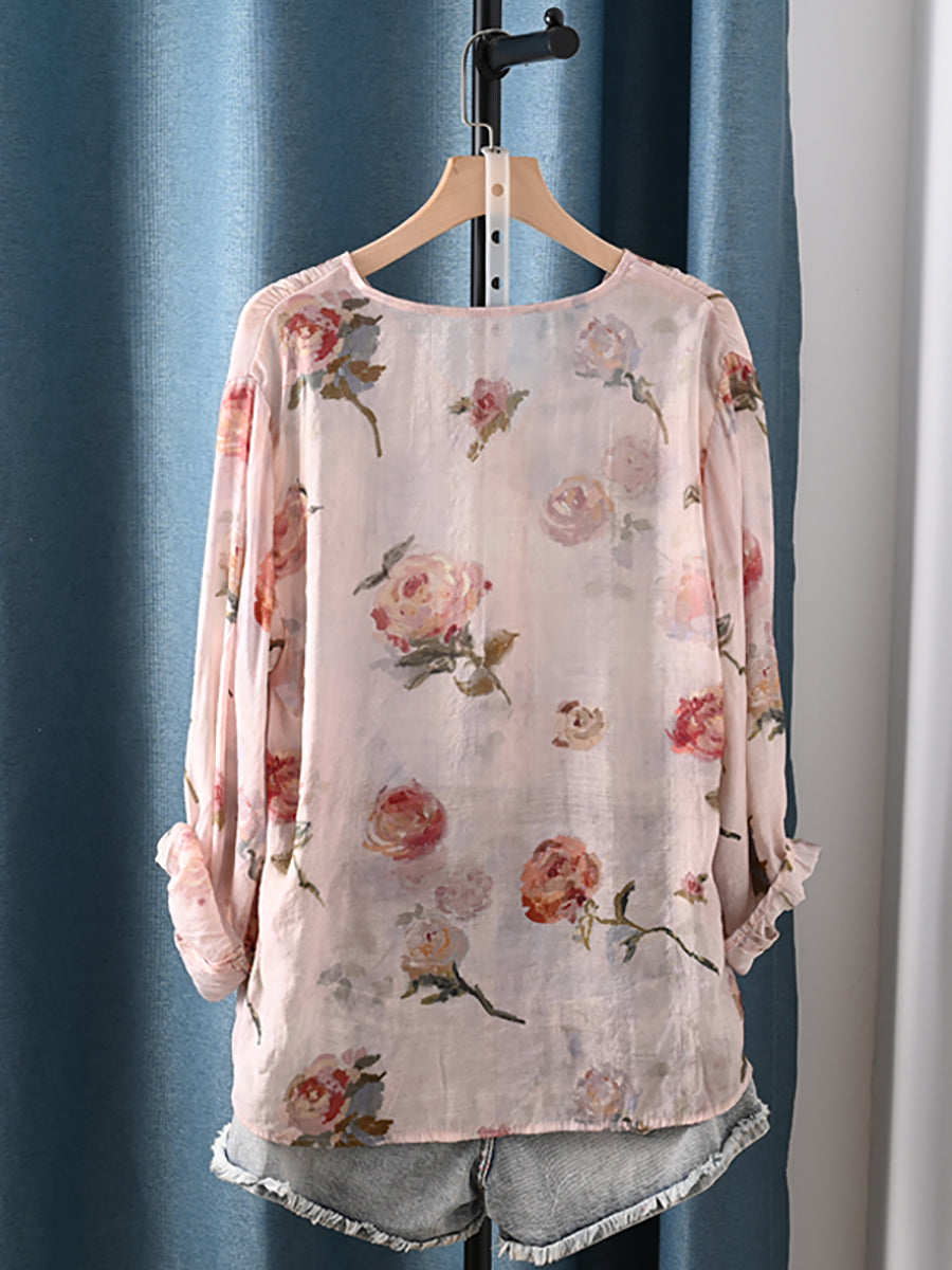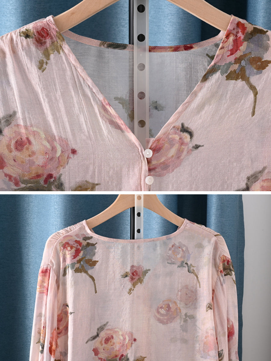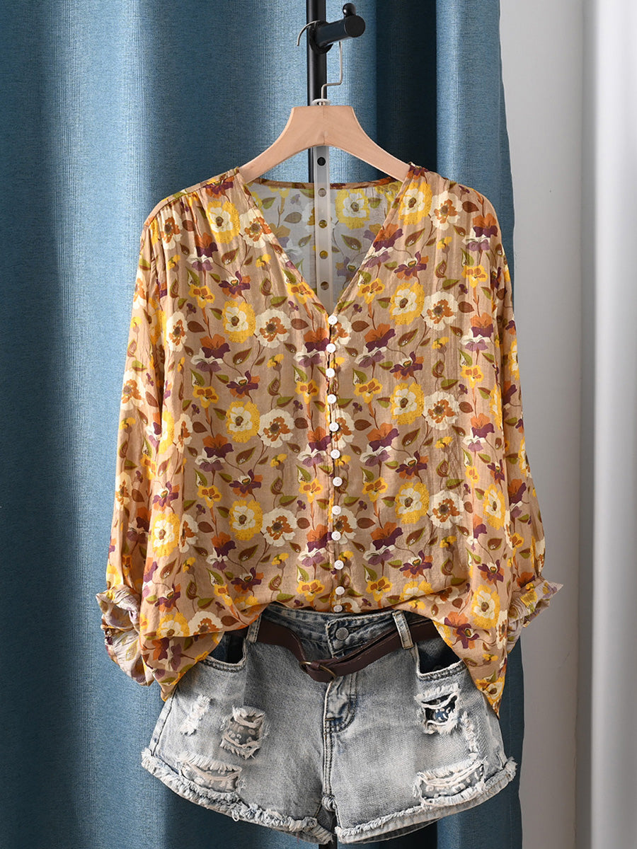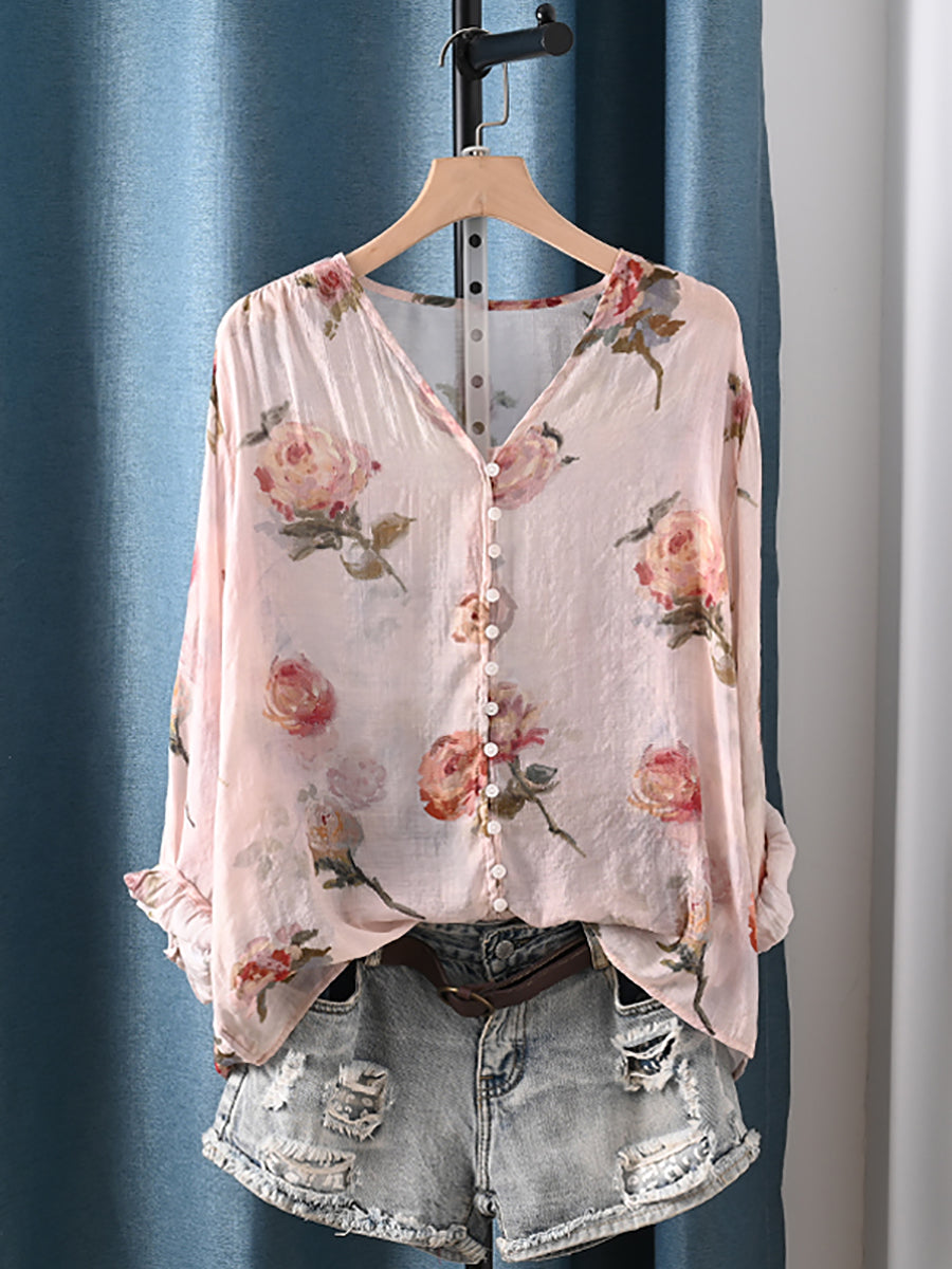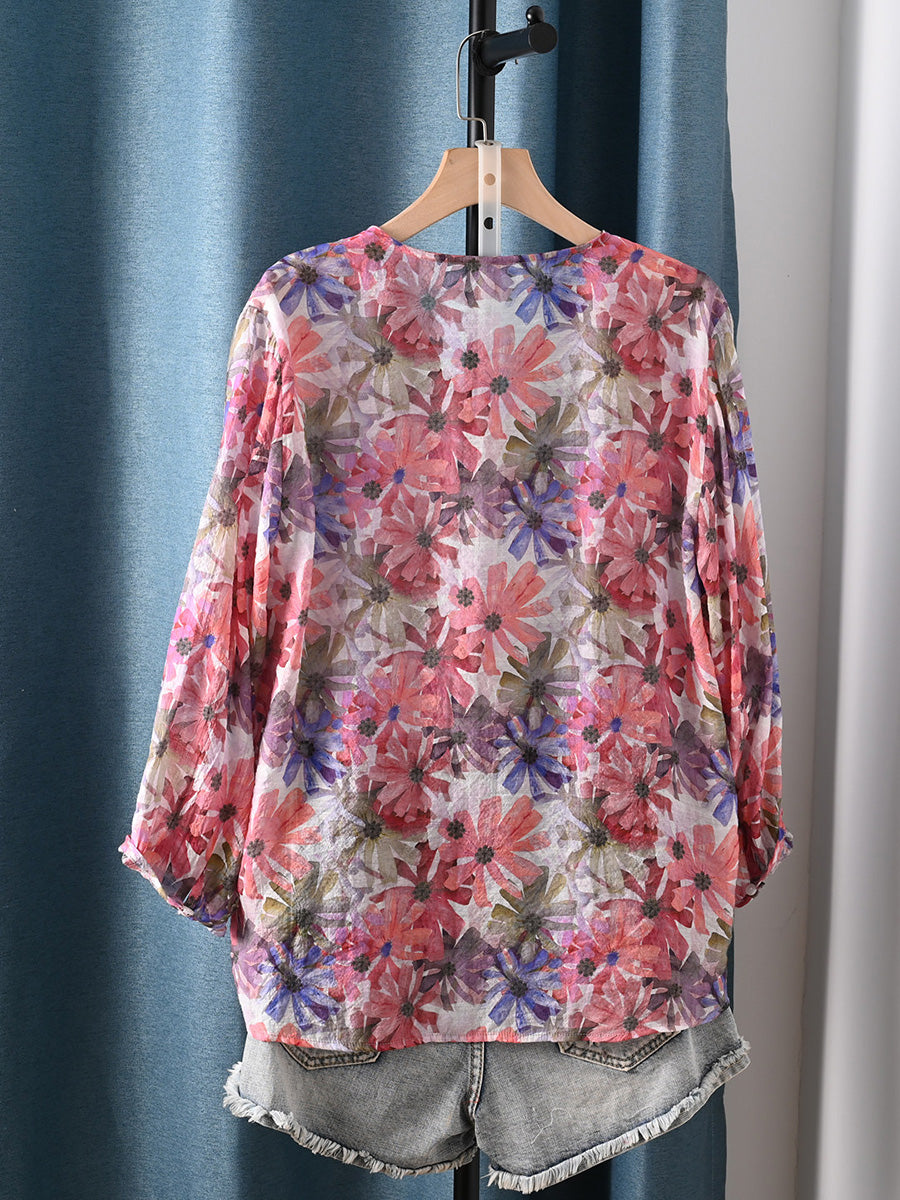 Dámské letní umělecké květinové tričko s výstřihem do V