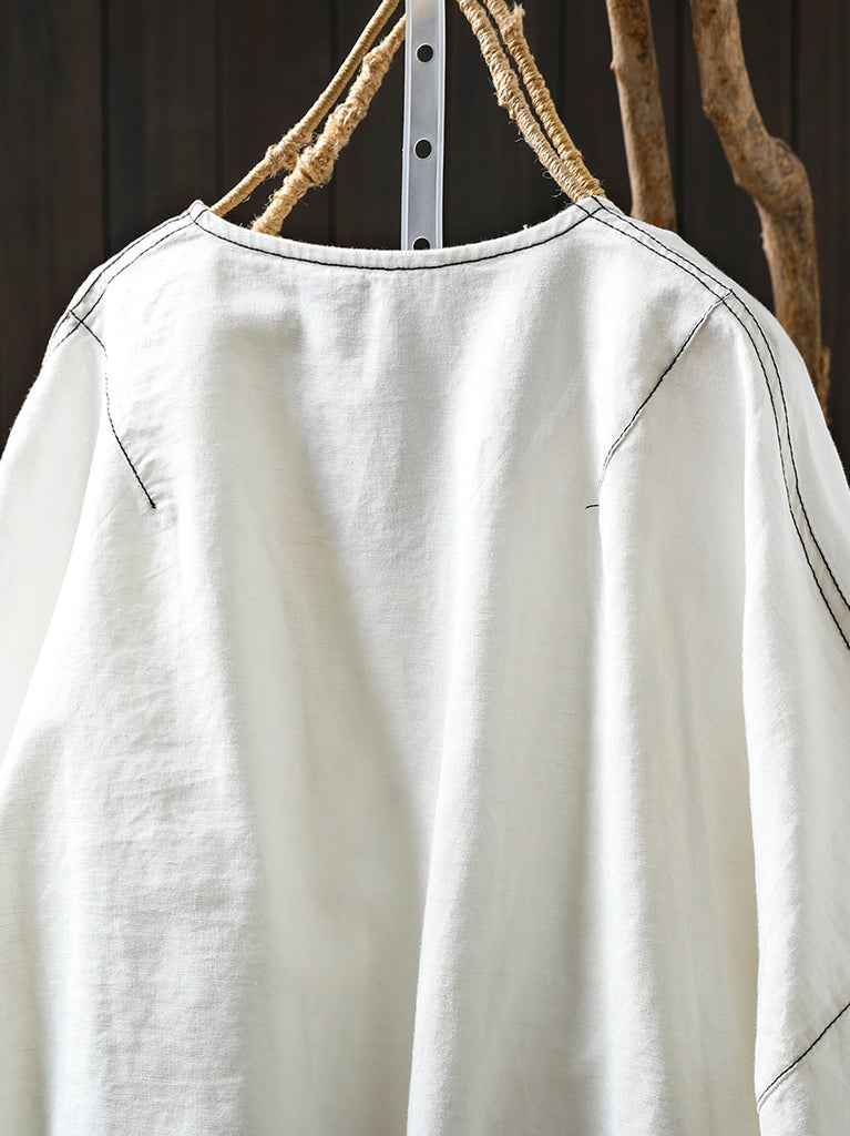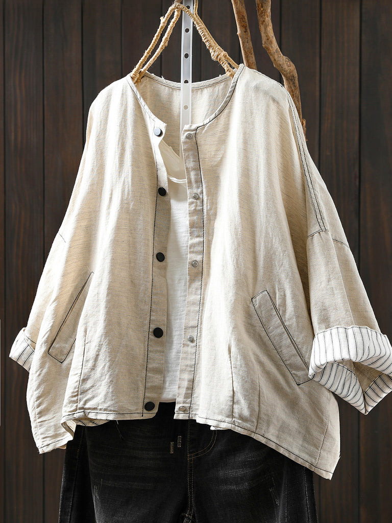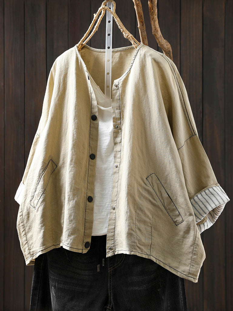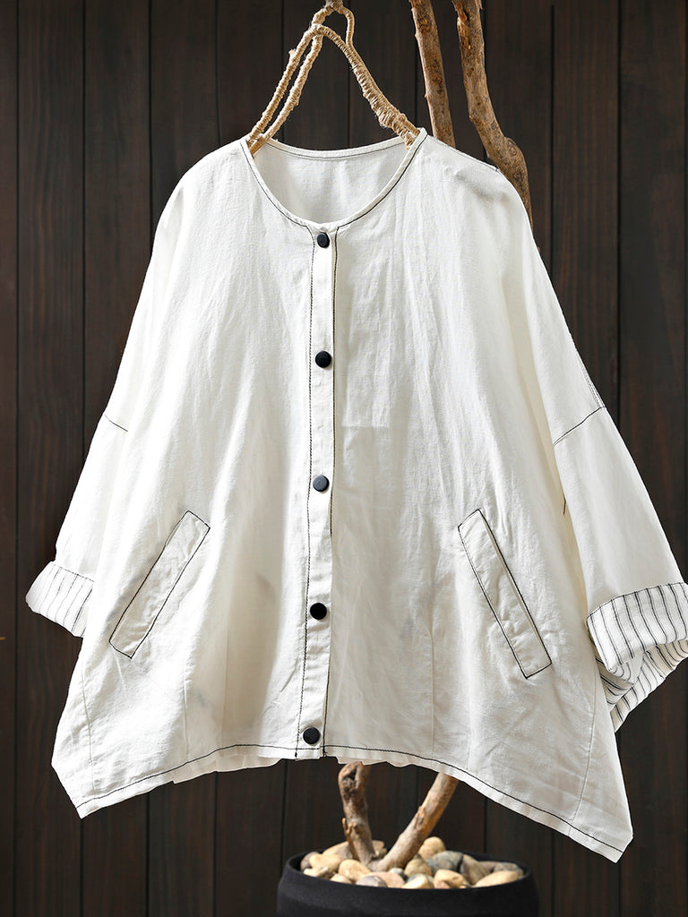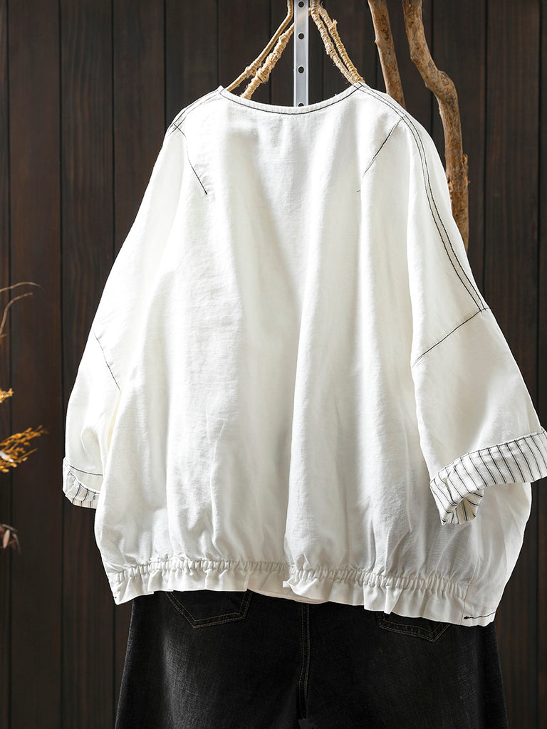 Dámská letní pletená lněná košile s uměleckými pruhy a výstřihem do O-neck