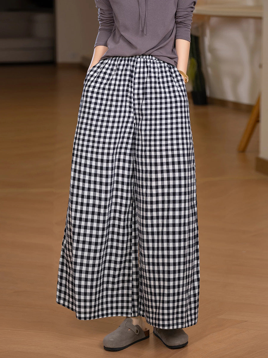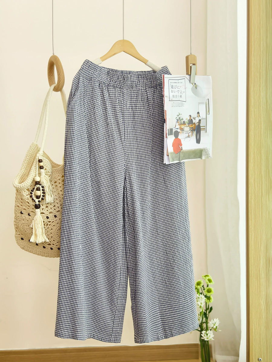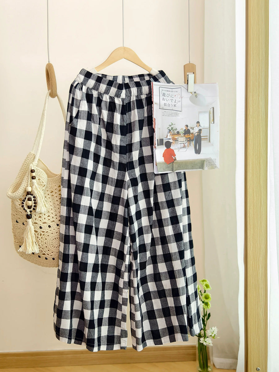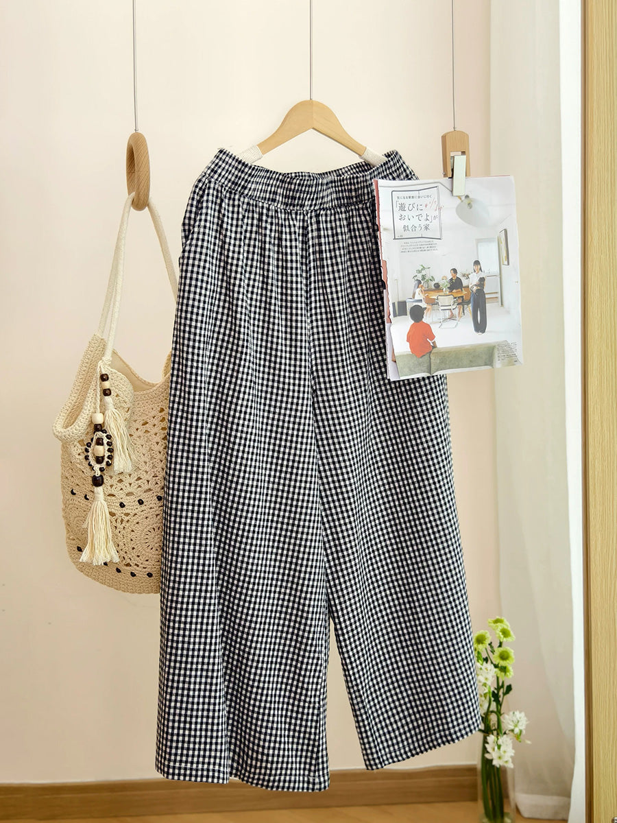 Dámské letní retro kostkované kalhoty se širokými nohavicemi, 100% bavlna